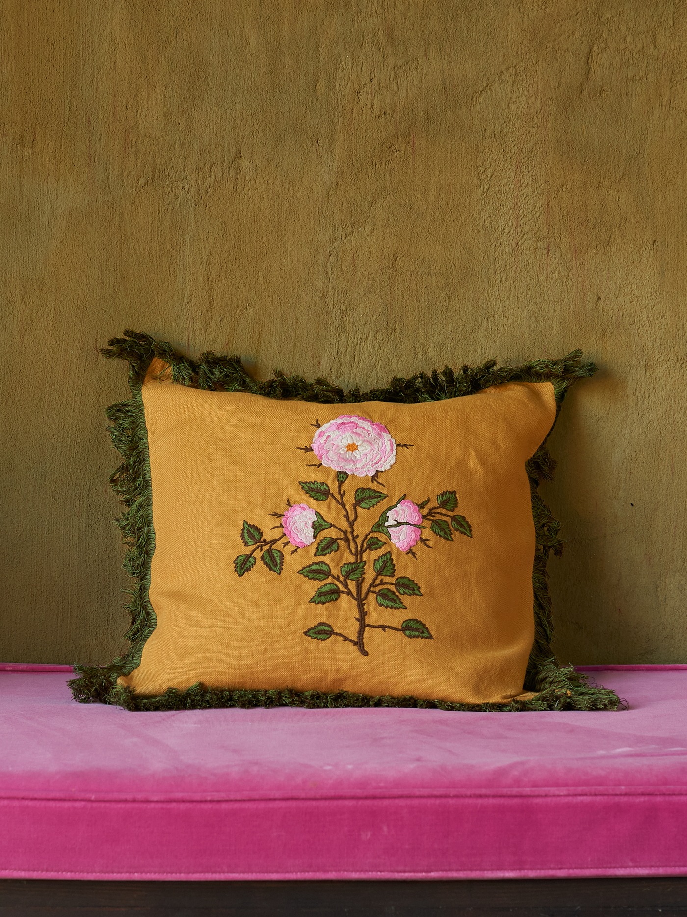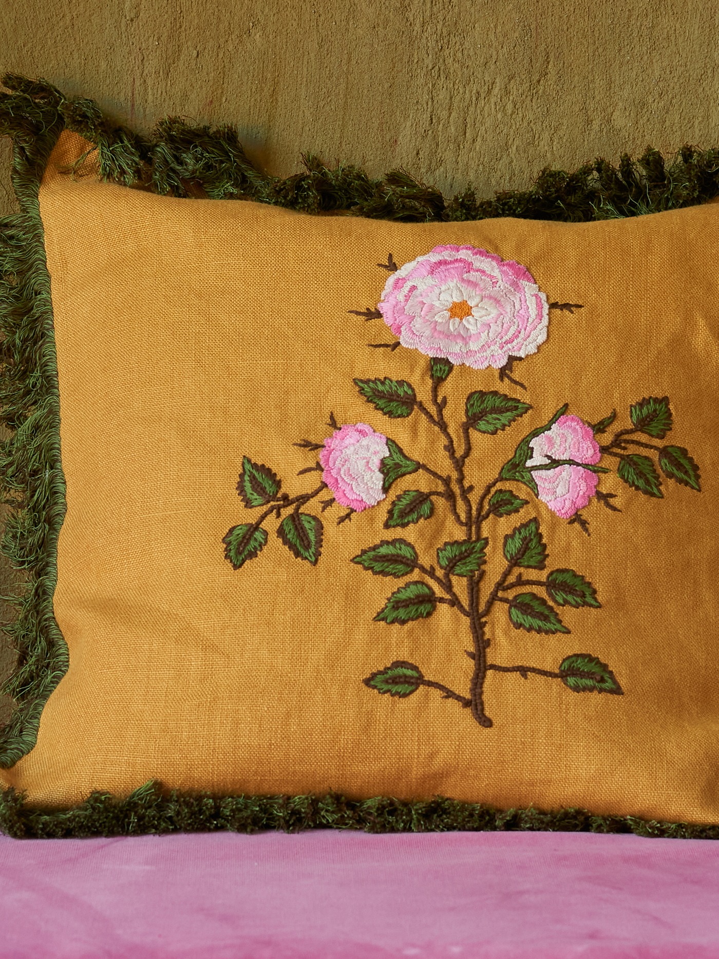 Cushion cover made of fine Matka silk in mustard gold , hand embroidered with a romantic Rose design. This cushion is finished with a dark green and brown mixed, hand made fringe and has a button closure at the back.