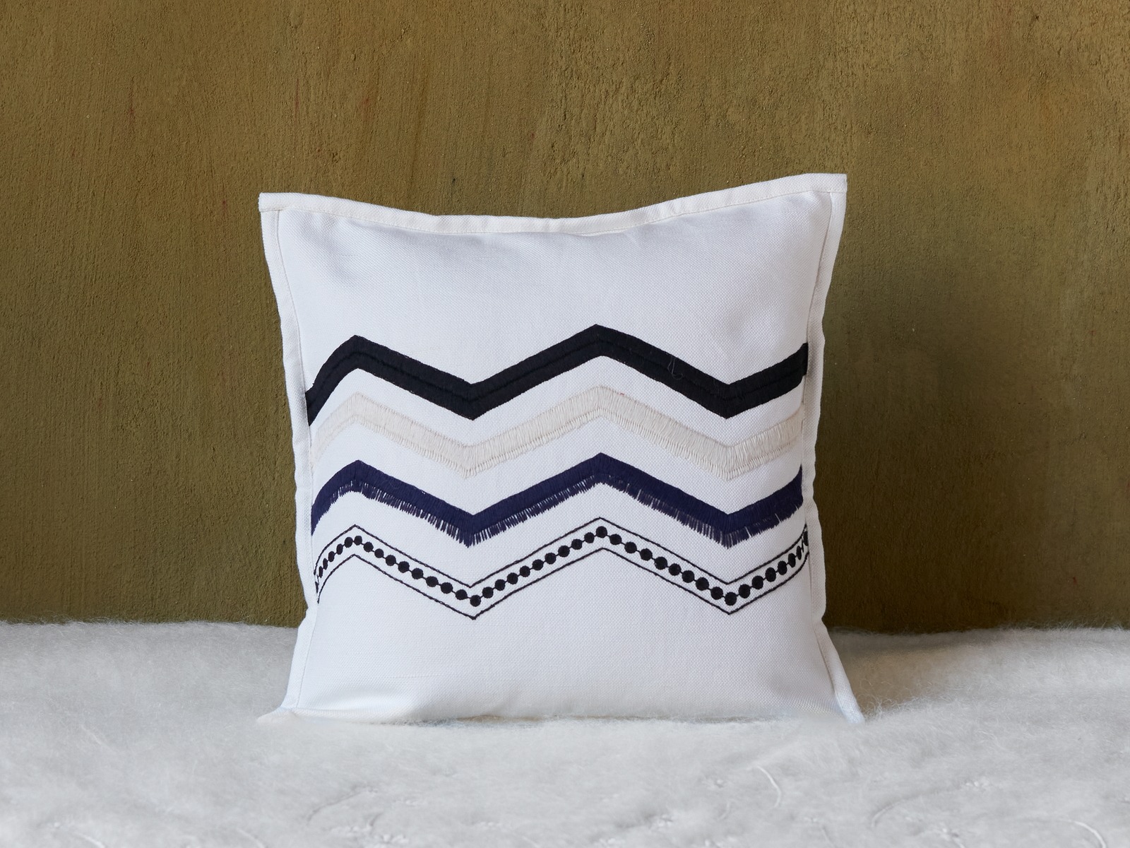 Optical white cotton cushion cover, size 40x40 cm, with an intricately embroidered zigzag design in black, cream and dark navy. Each line is done in a different stitch.