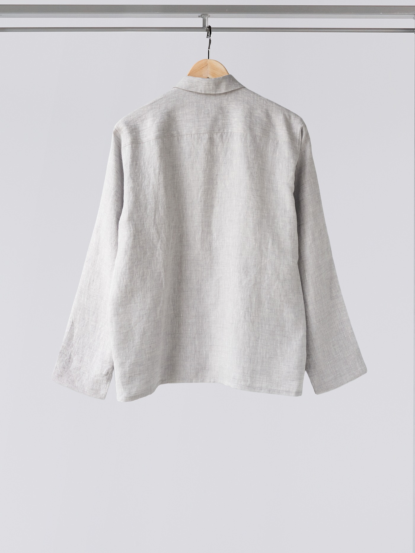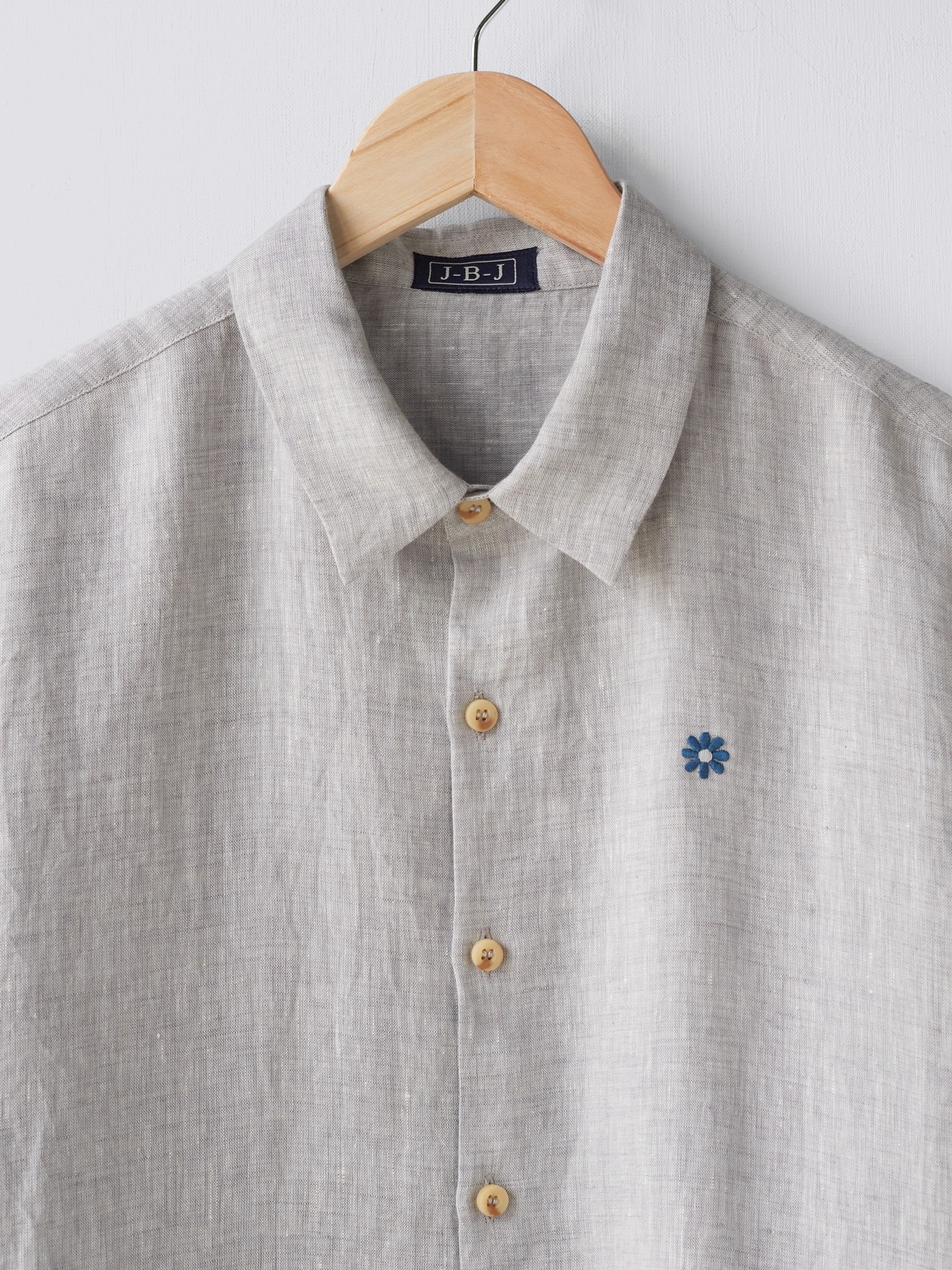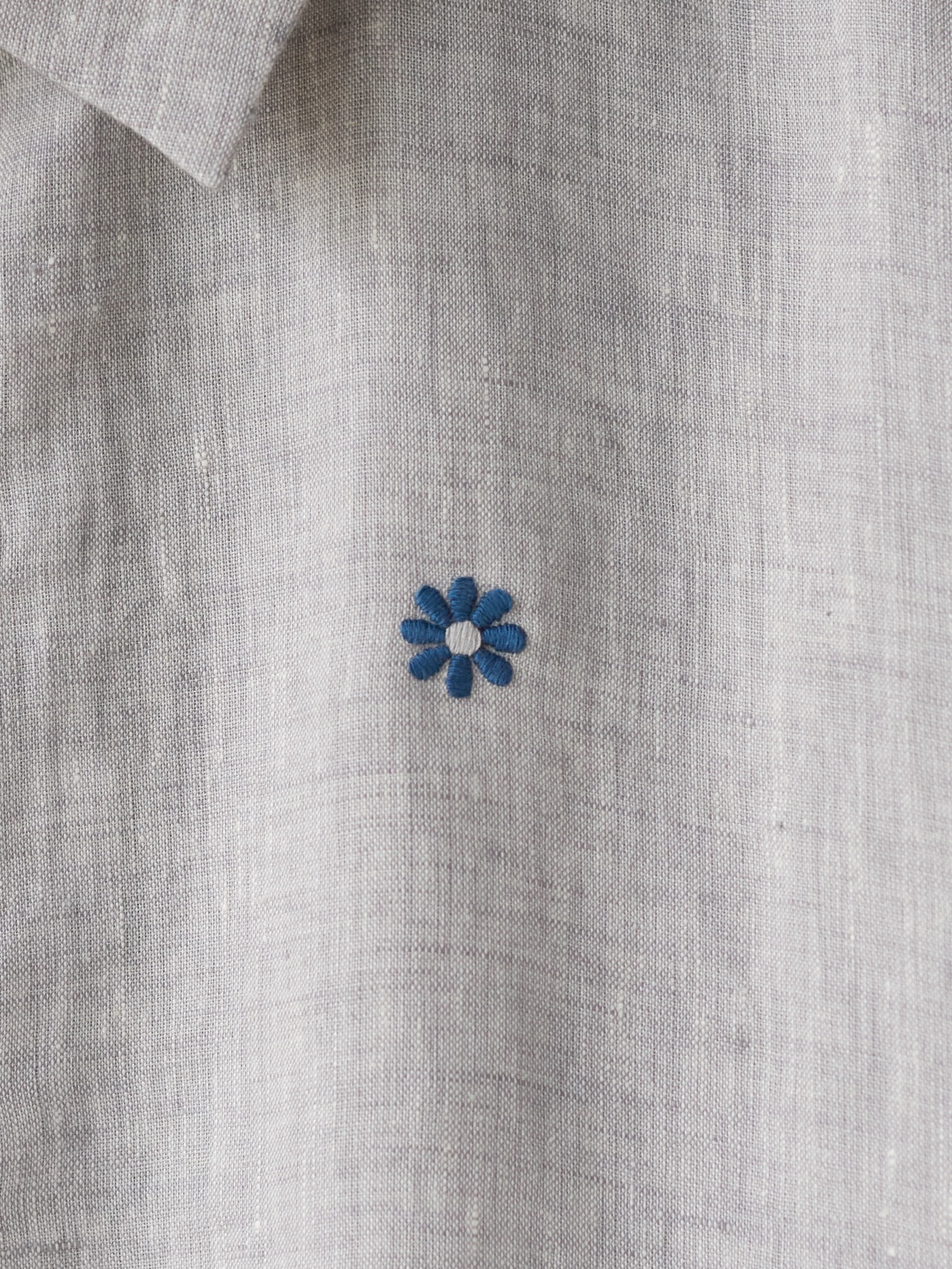 Available in fine blue linen or in navy linen wool, this shirt is distinguished by the signature Jupe by Jackie flower, delicately hand embroidered.