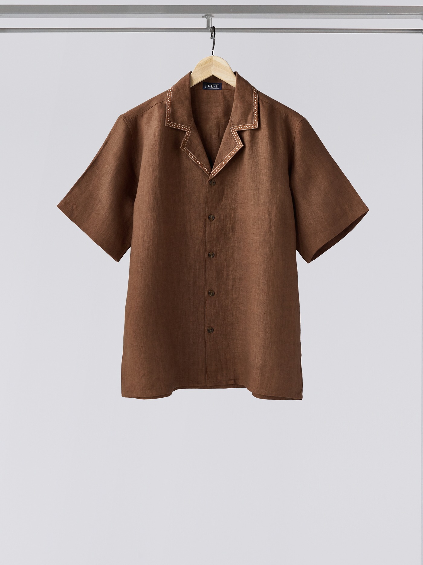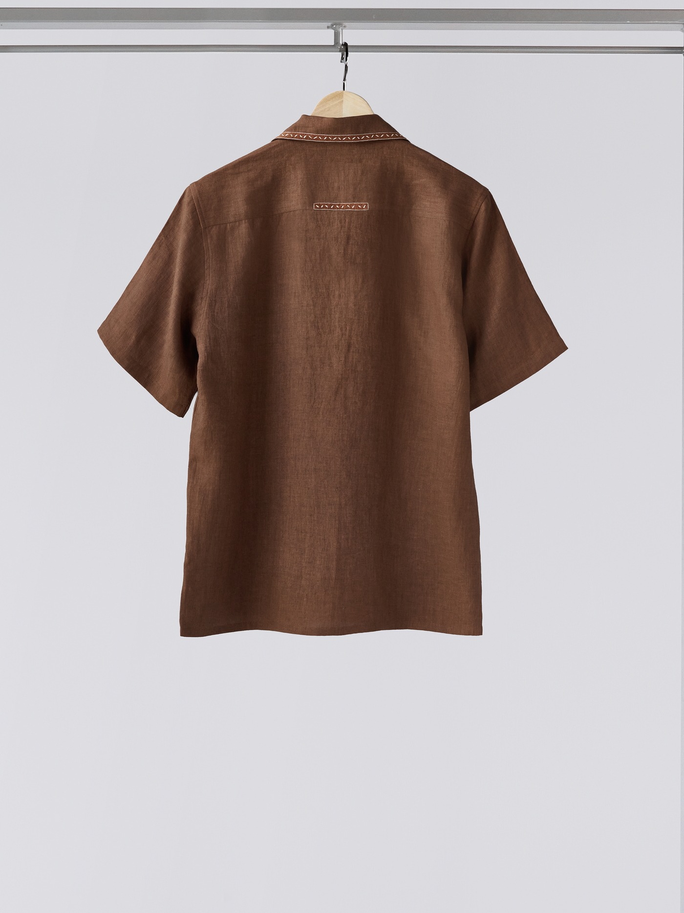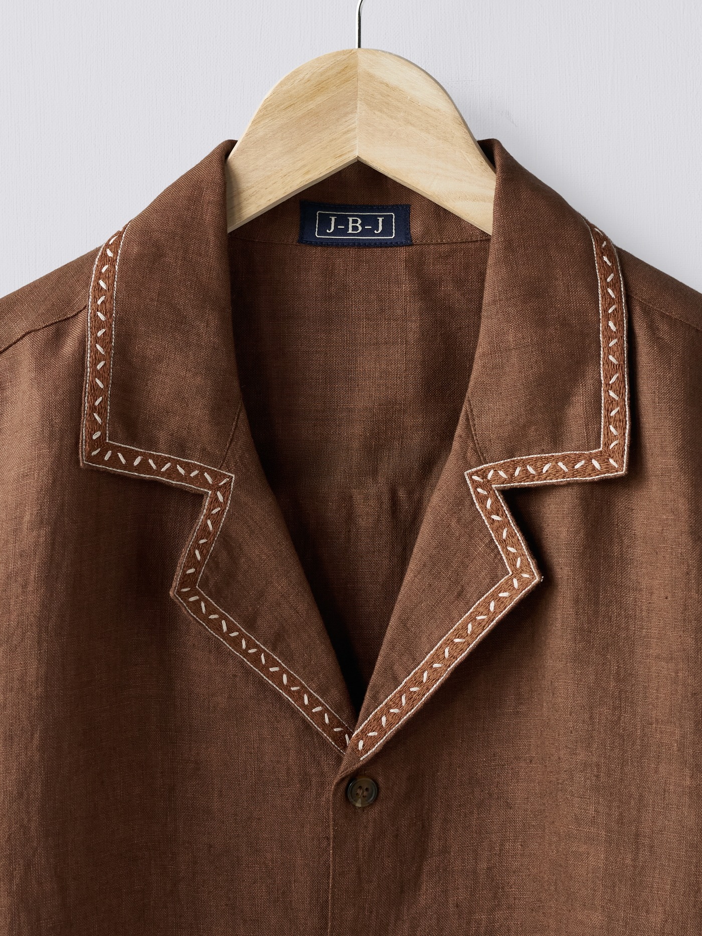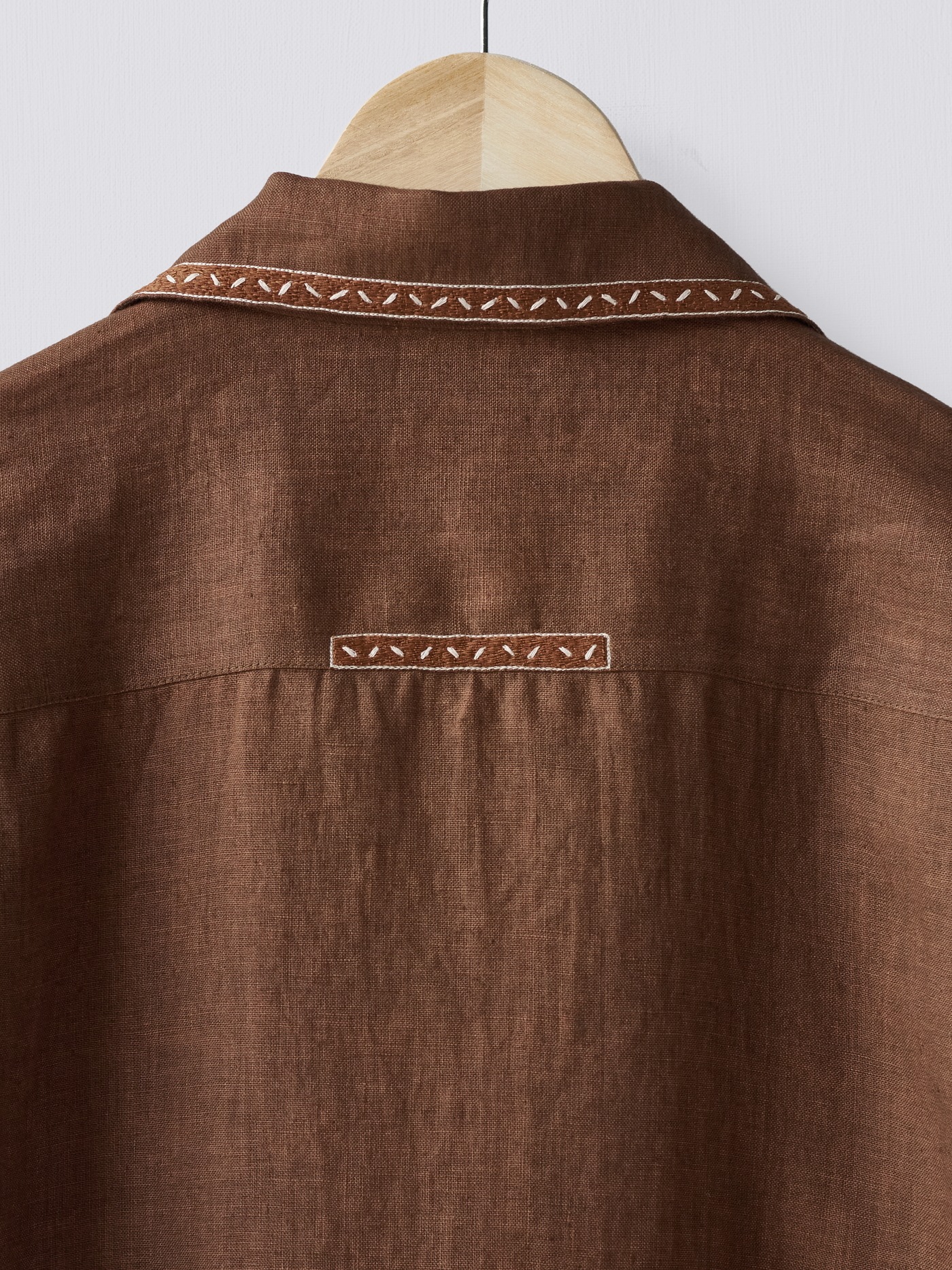 Brown linen shirt with hand embroidered accents.