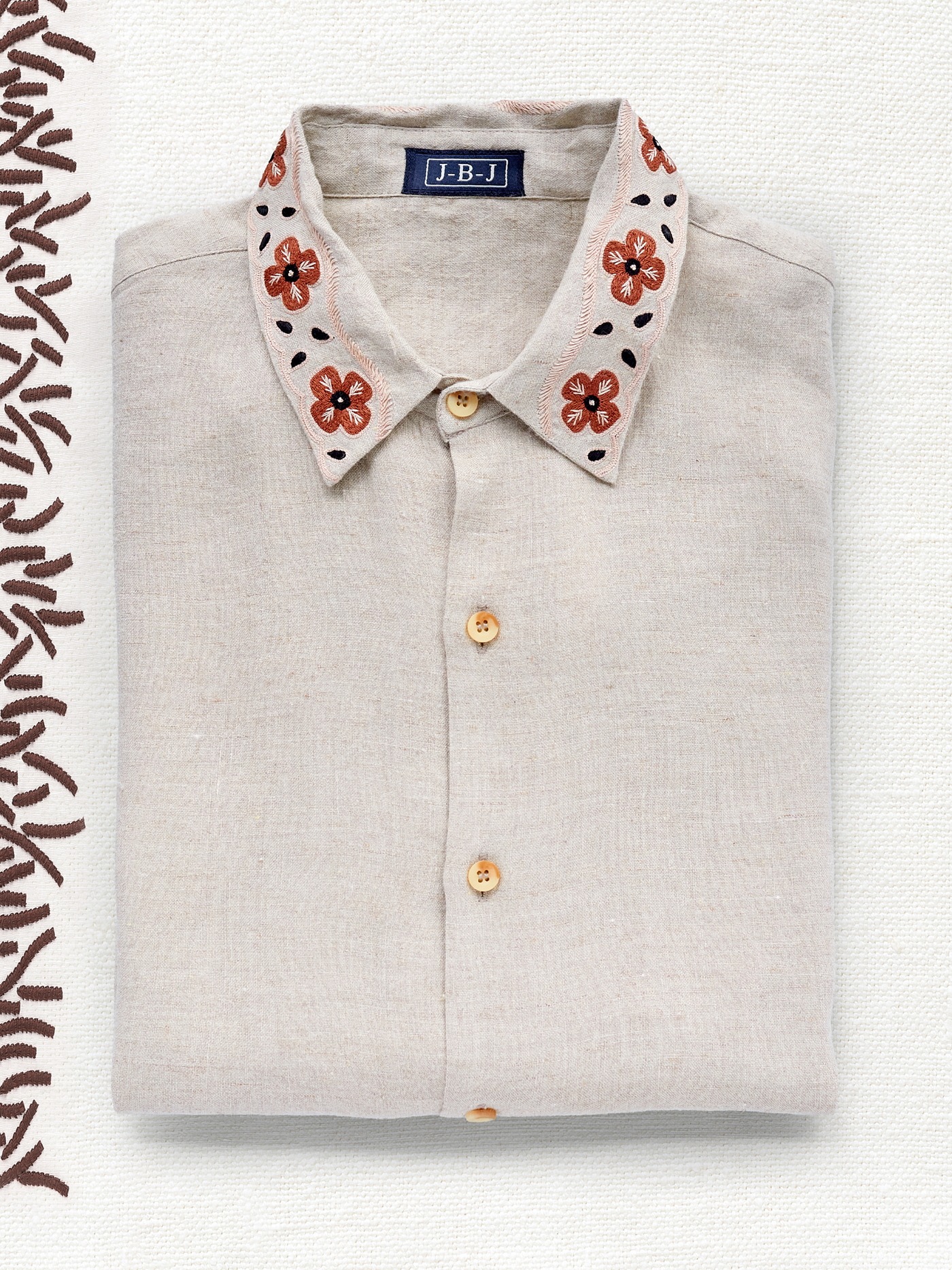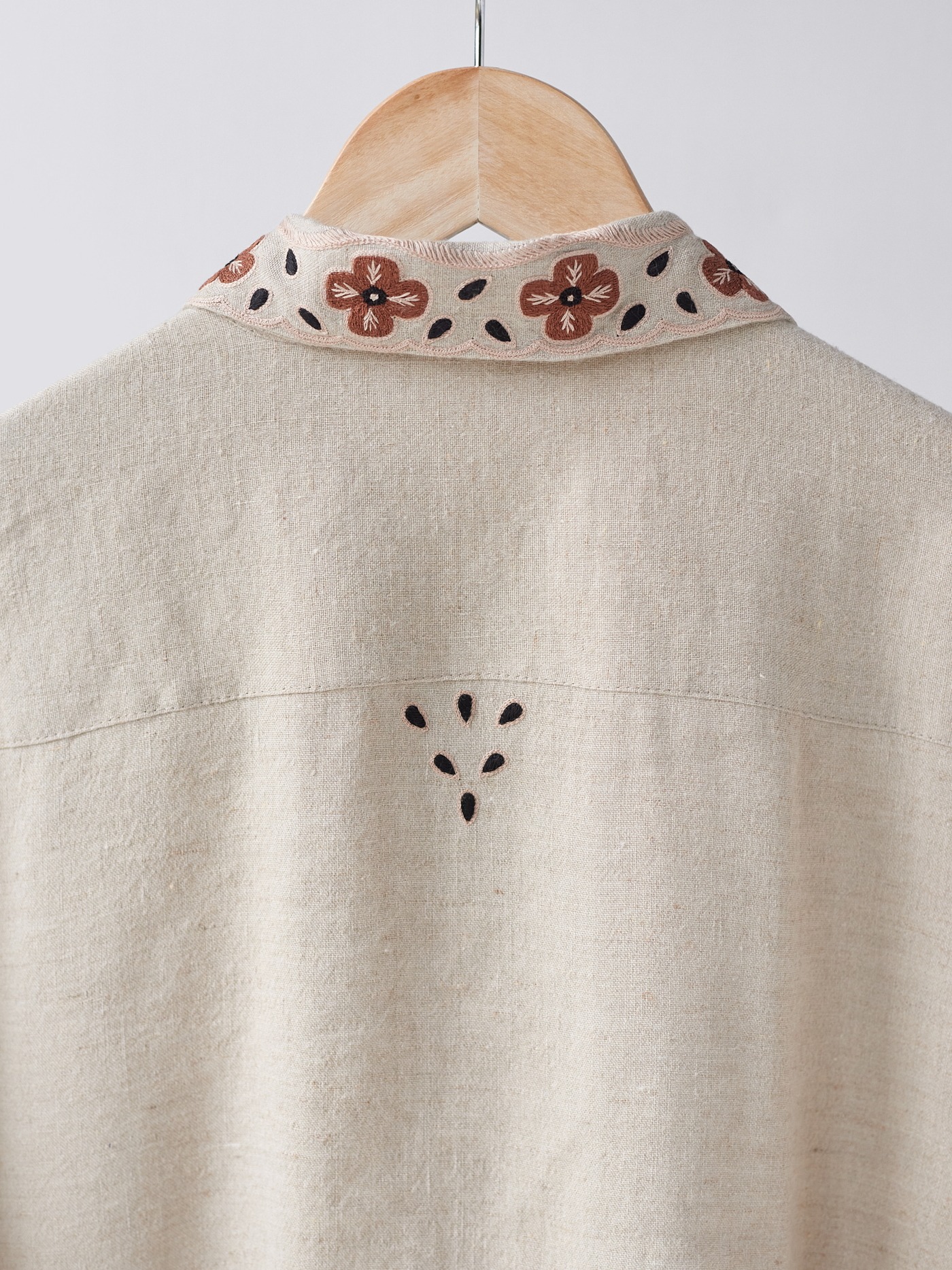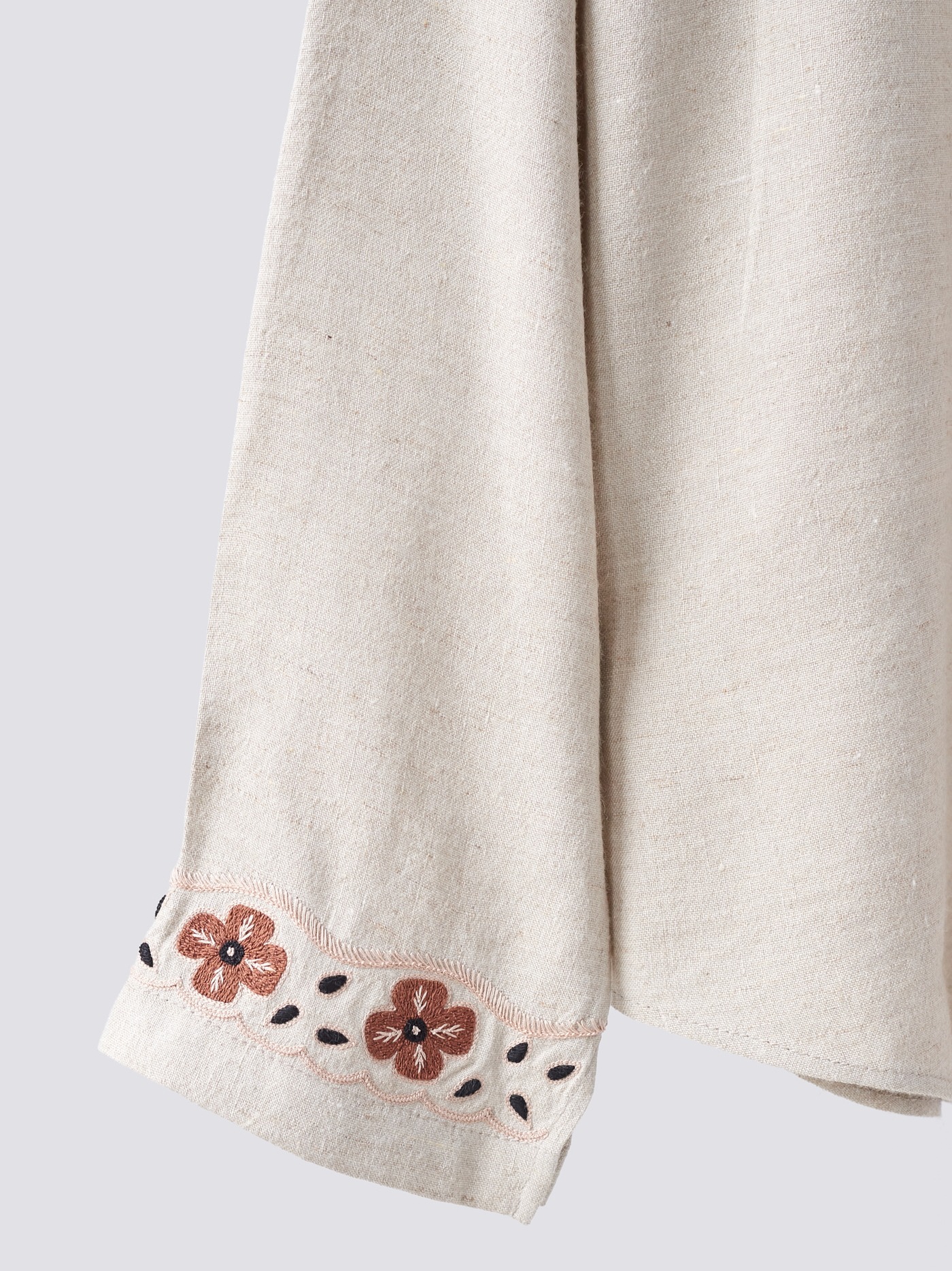Intricately, hand embroidered flowers in cream and brown.