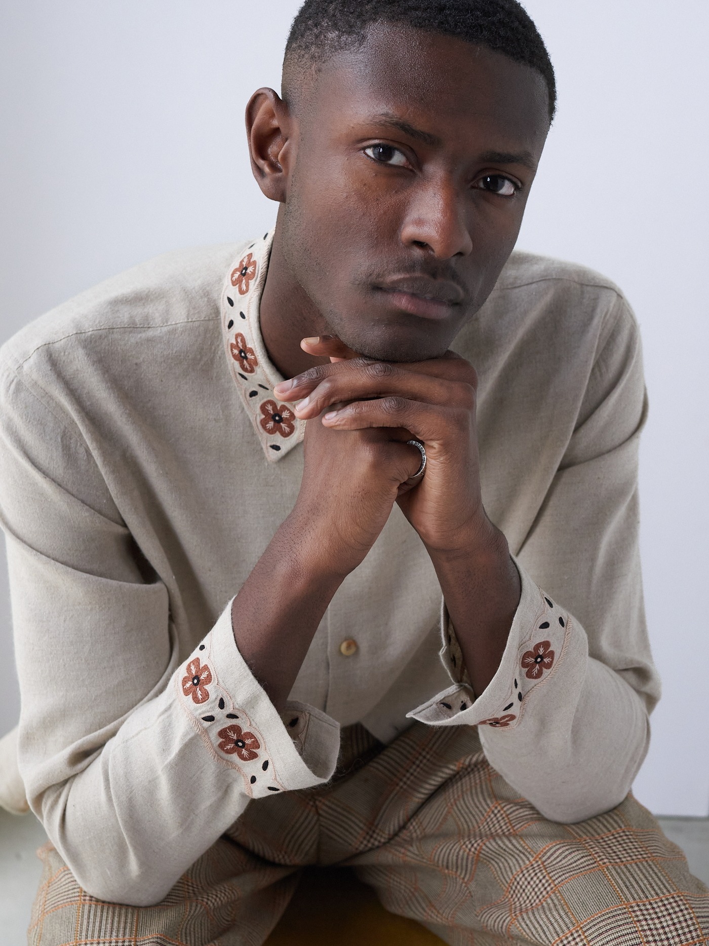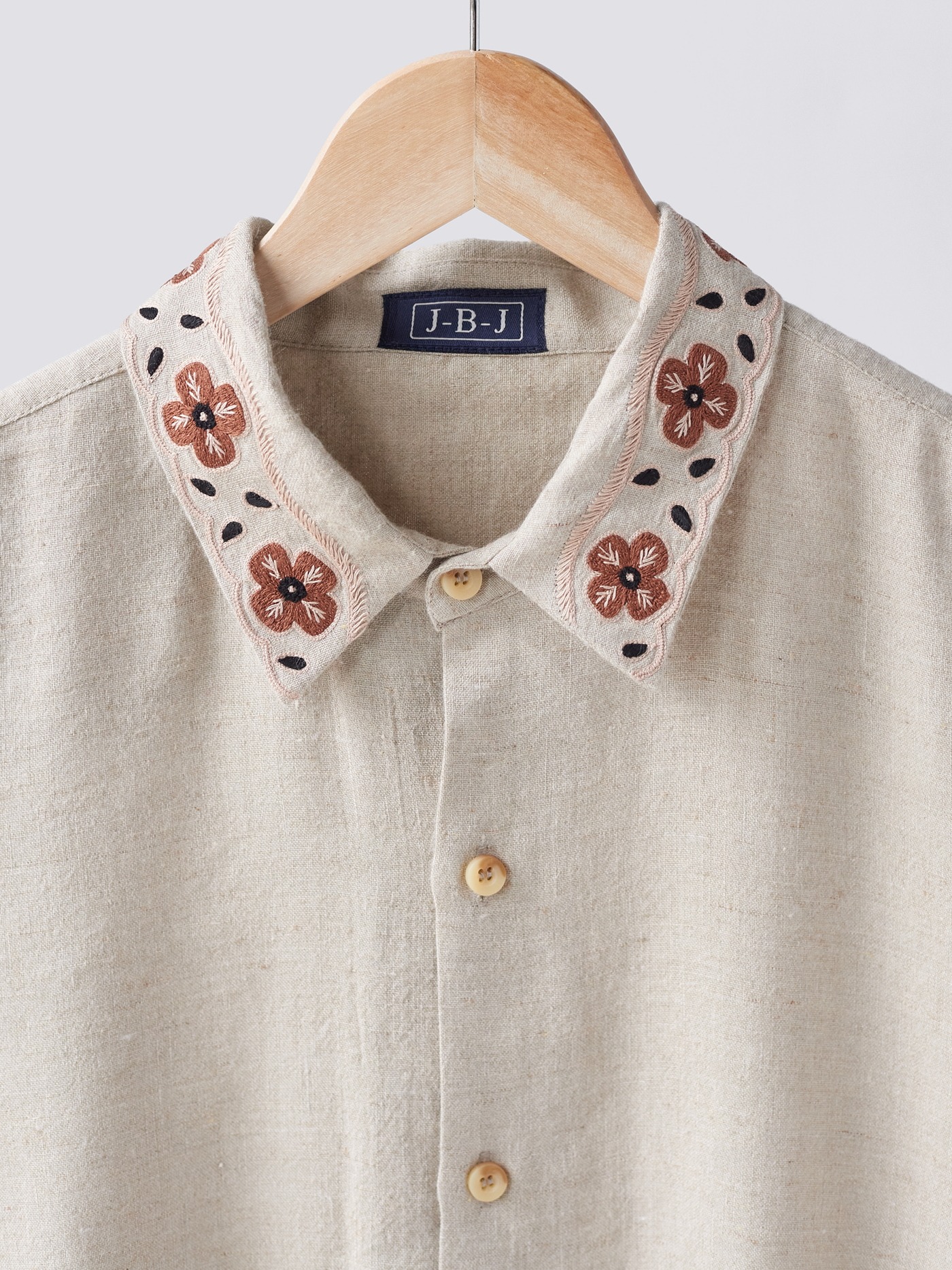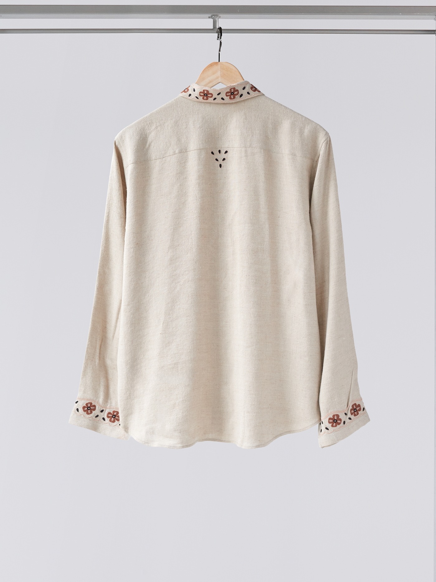 Intricately, hand embroidered flowers in cream and brown.