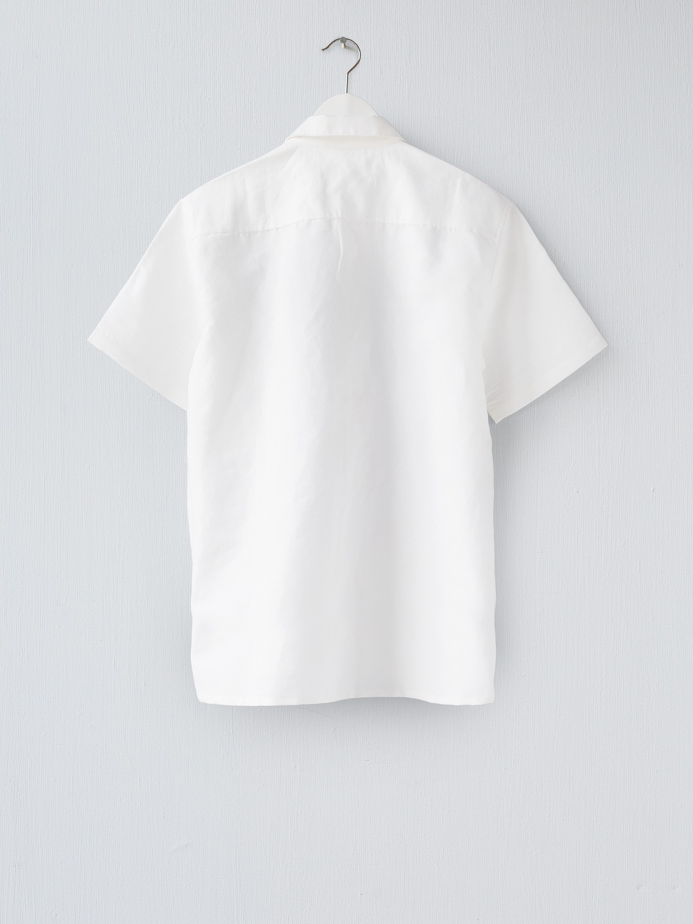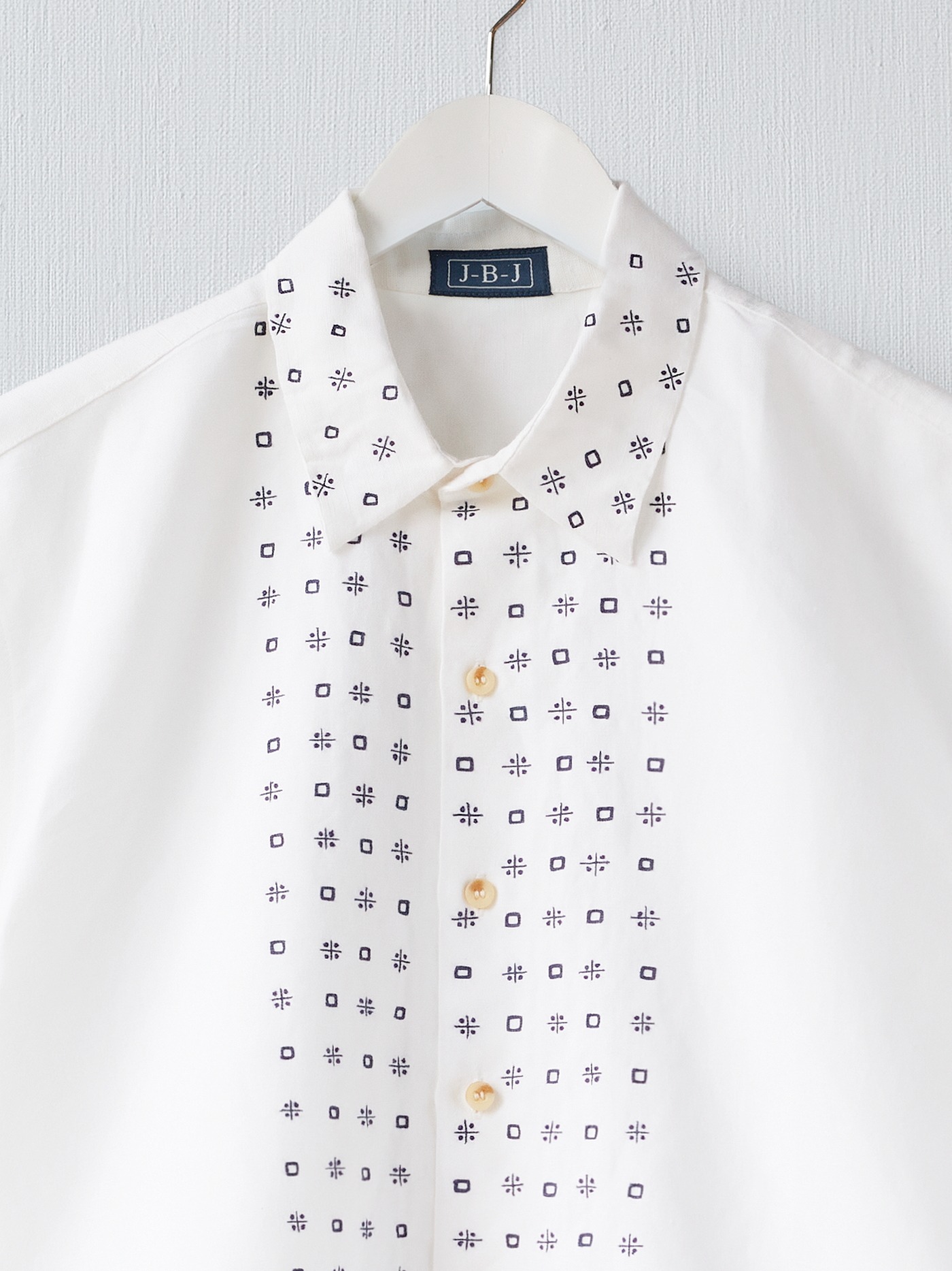 Off white cotton linen short sleeved shirt. The fine navy details on the front are entirely embroidered by hand.