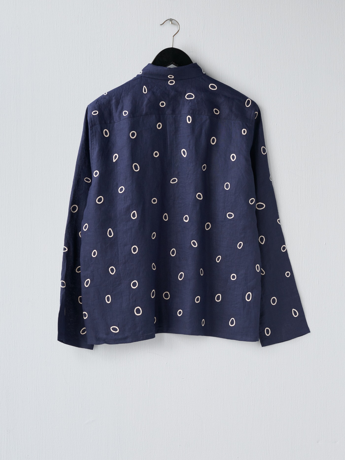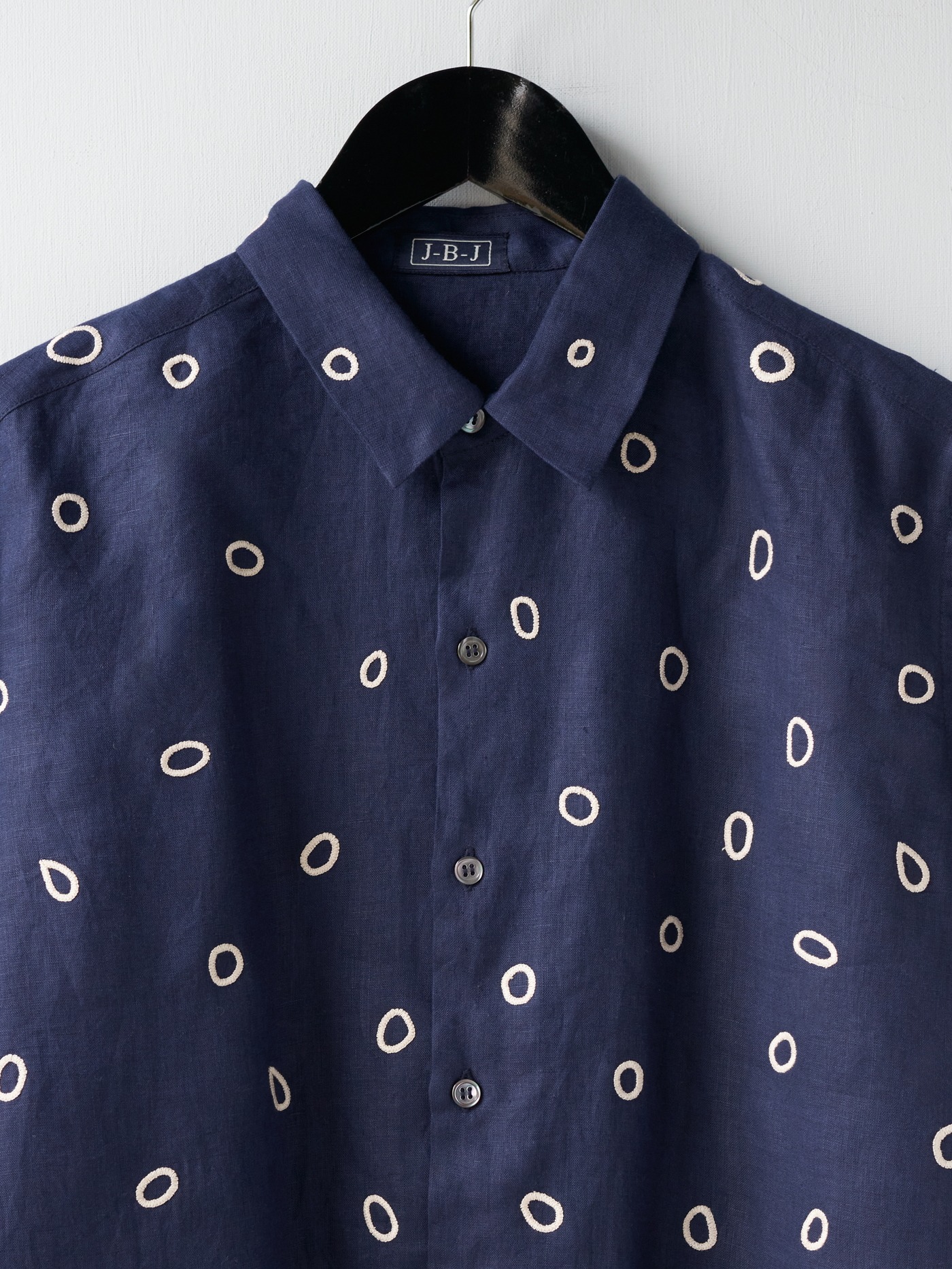 Navy linen wool blend shirt, hand embroidered with an all over pattern of cream circles.