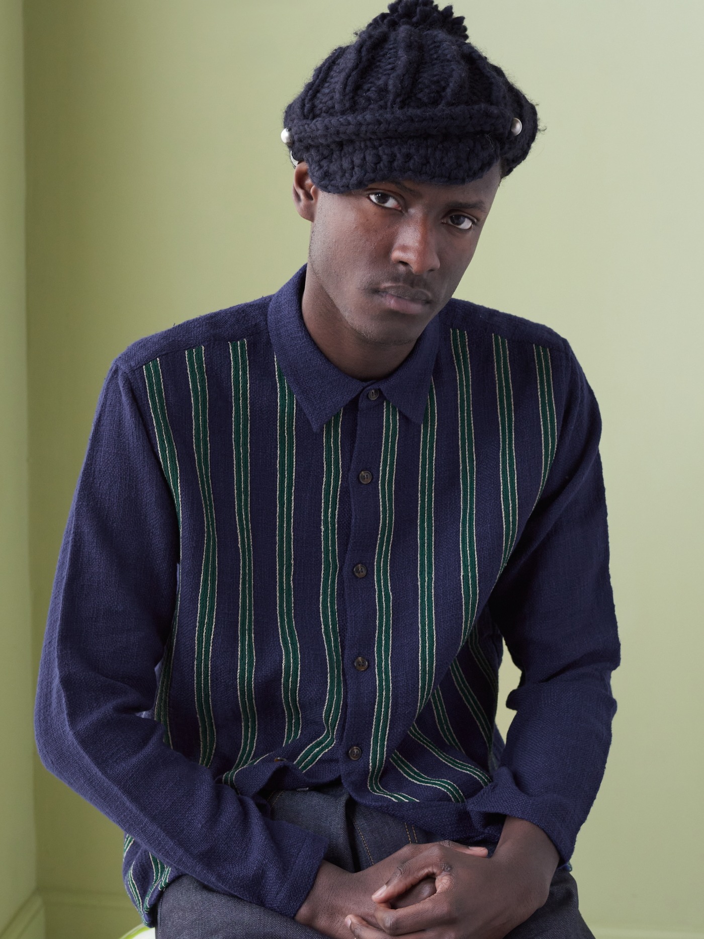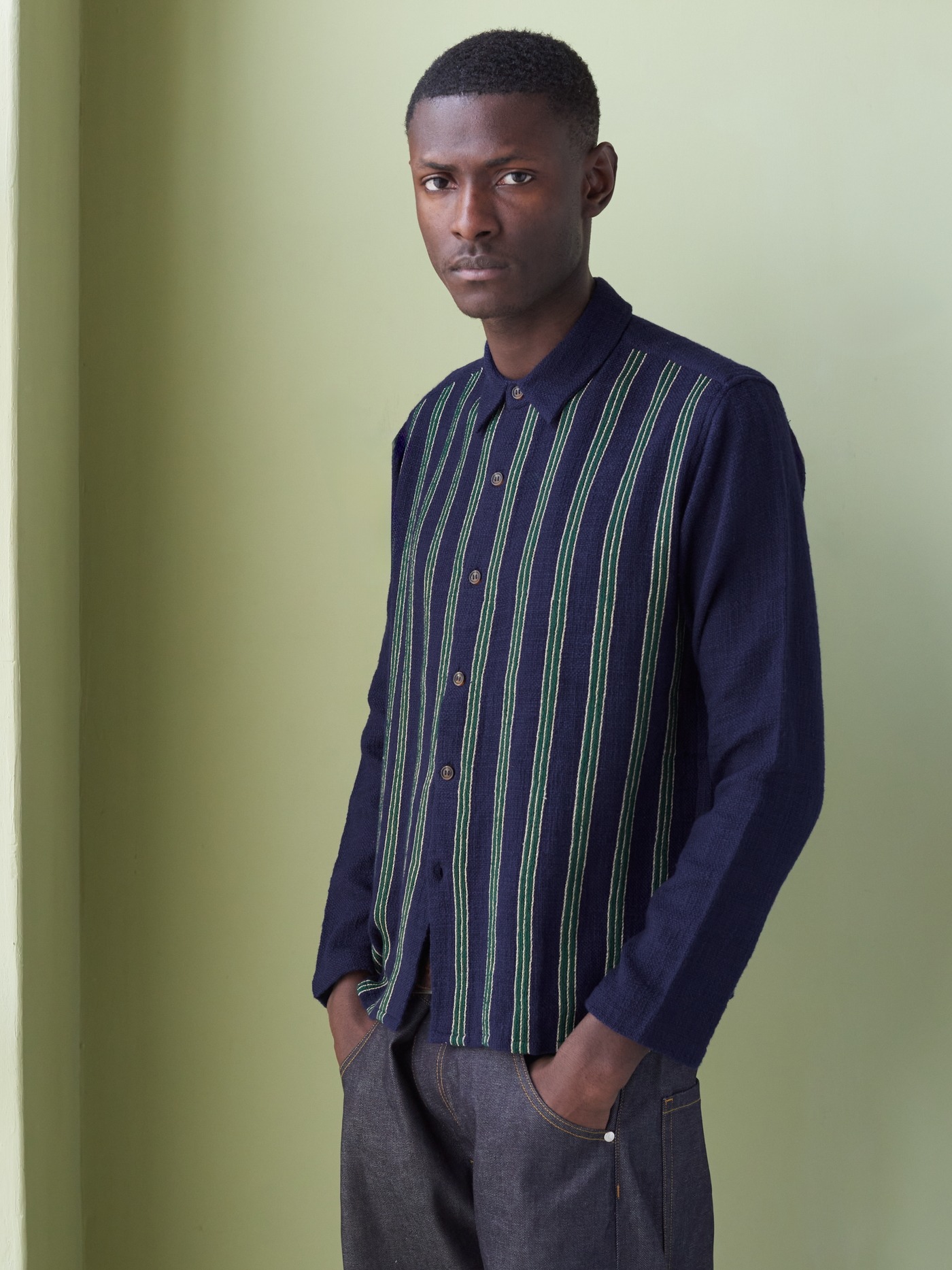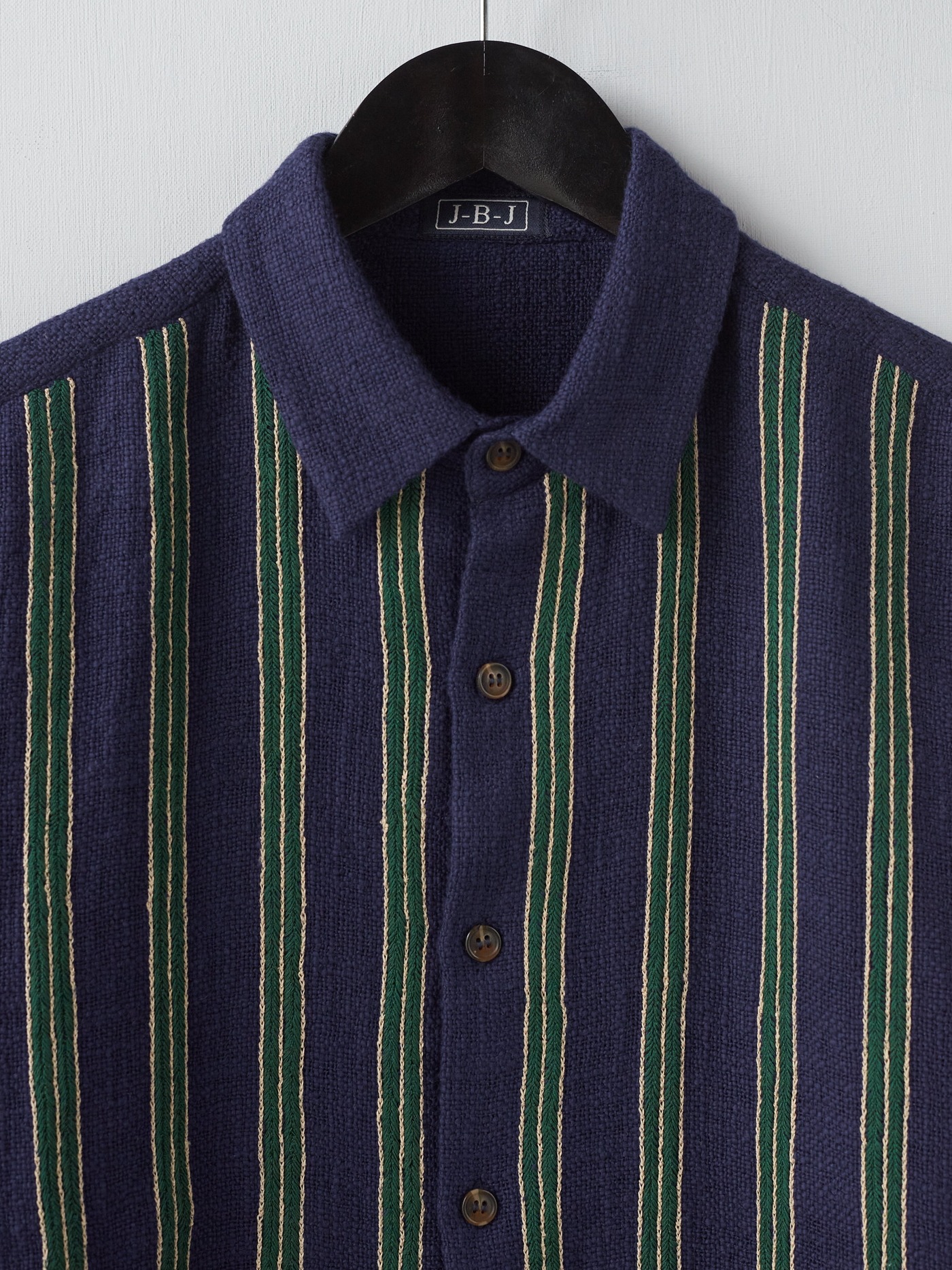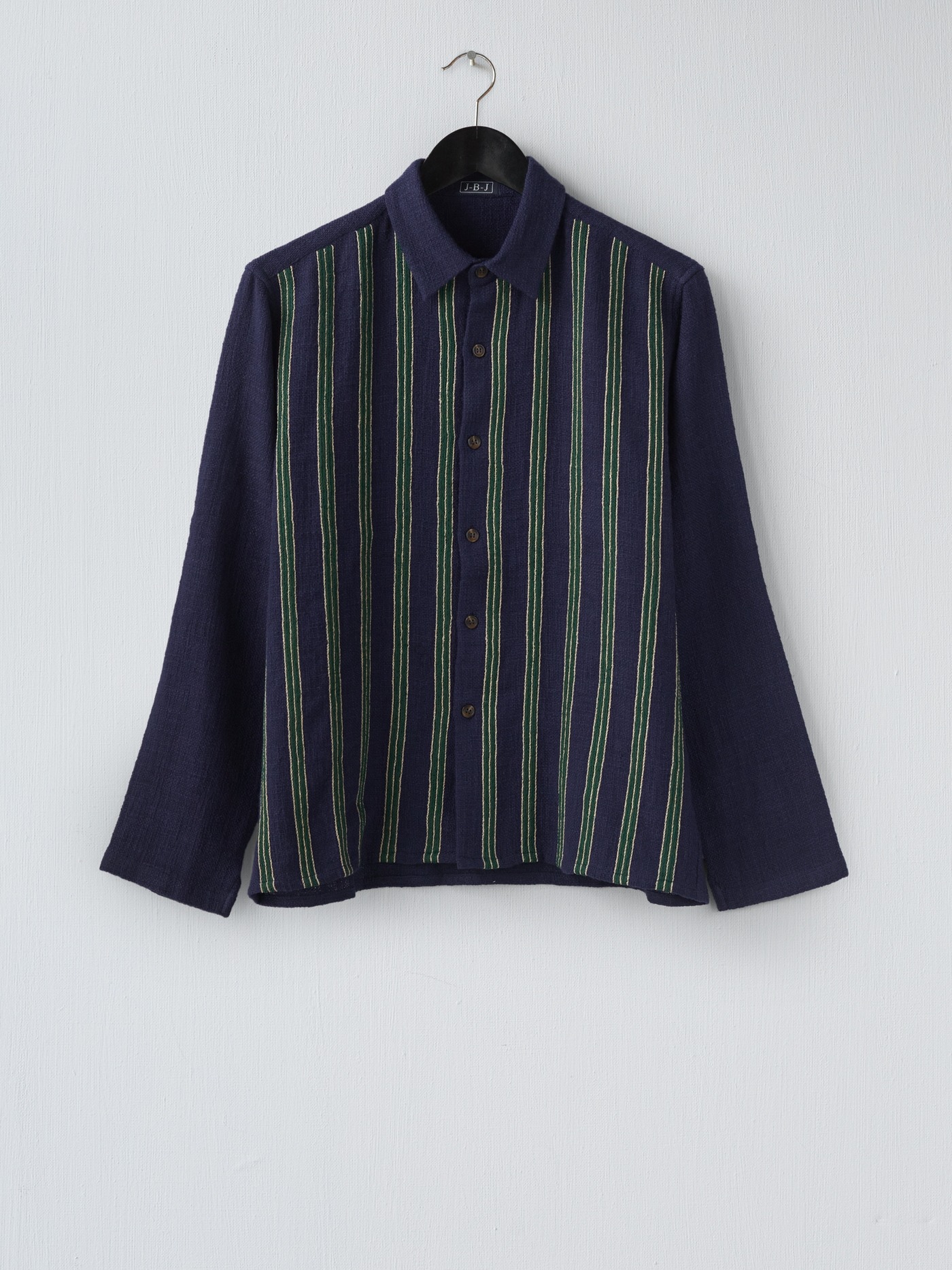 One of a kind navy Khadi cotton shirt, intricately hand embroidered with navy, cream and green vertical lines on the front.