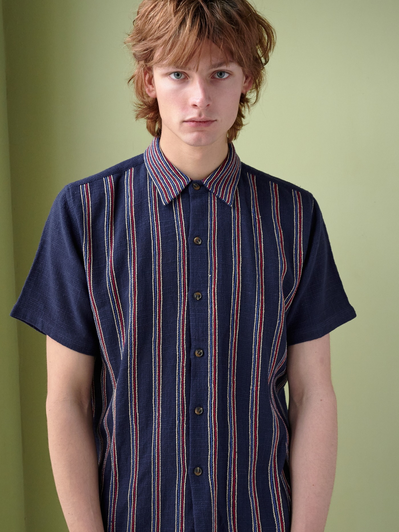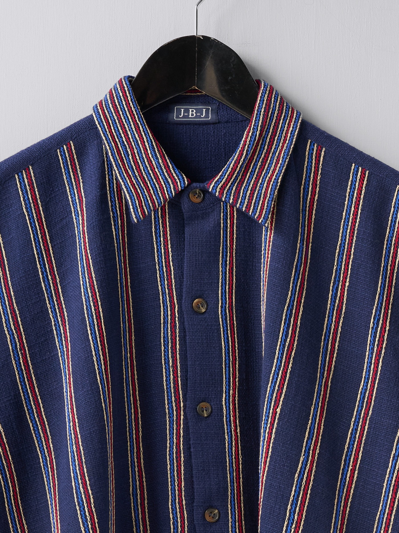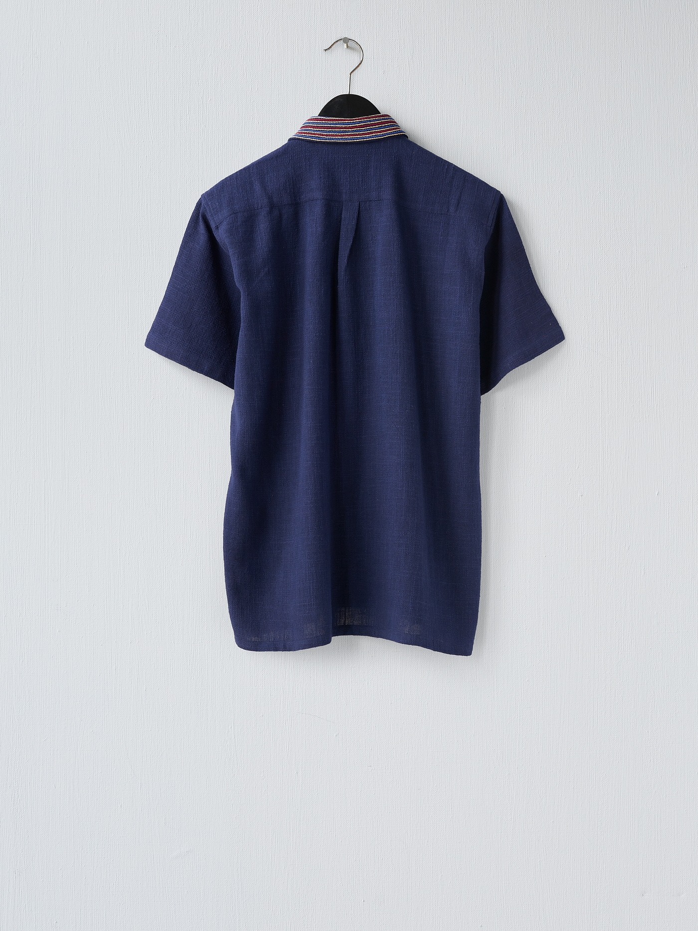 Navy short sleeved shirt made of Khadi cotton, with an, intricately made, hand embroidered design in tones of red, blue and dark cream