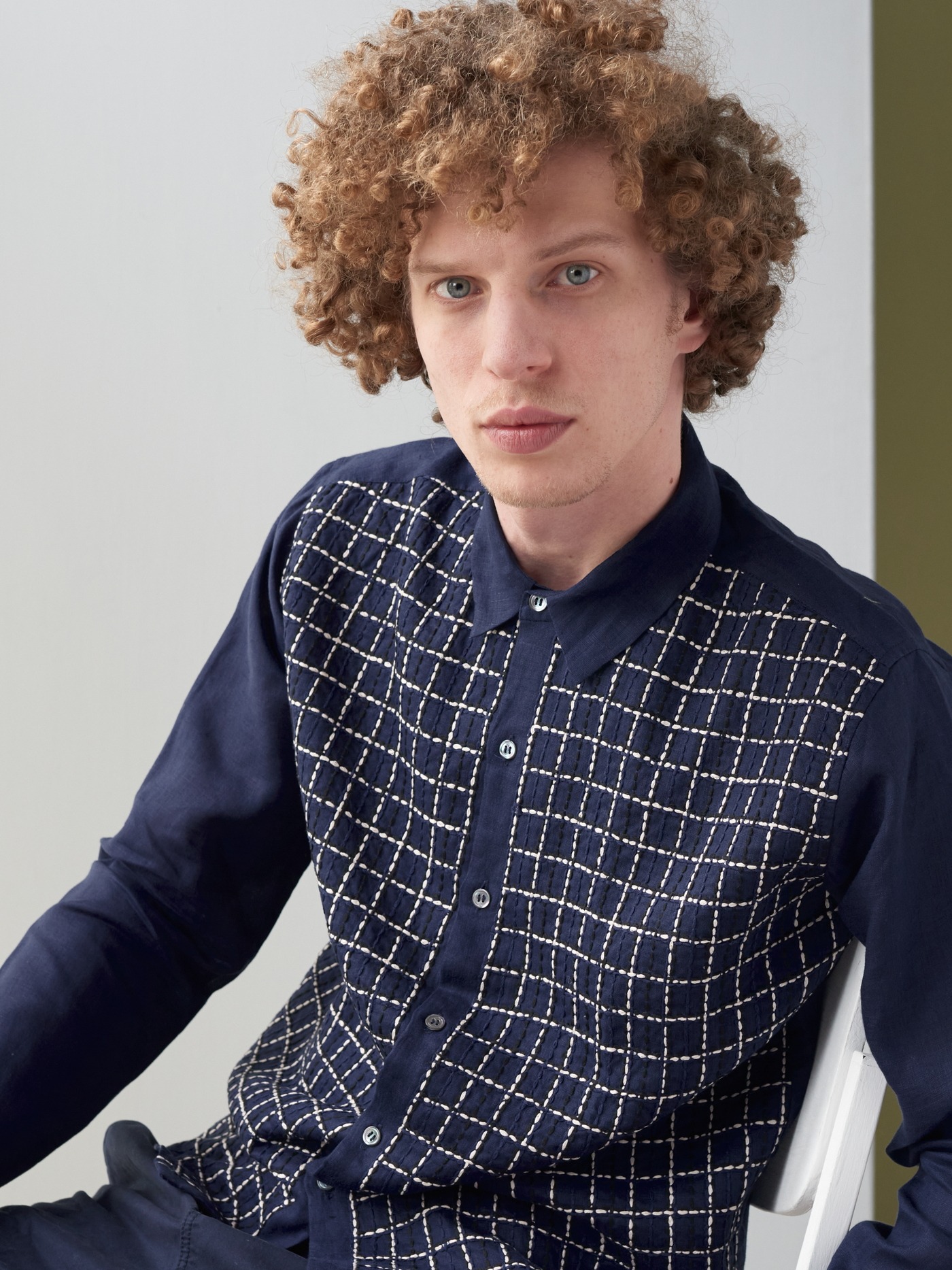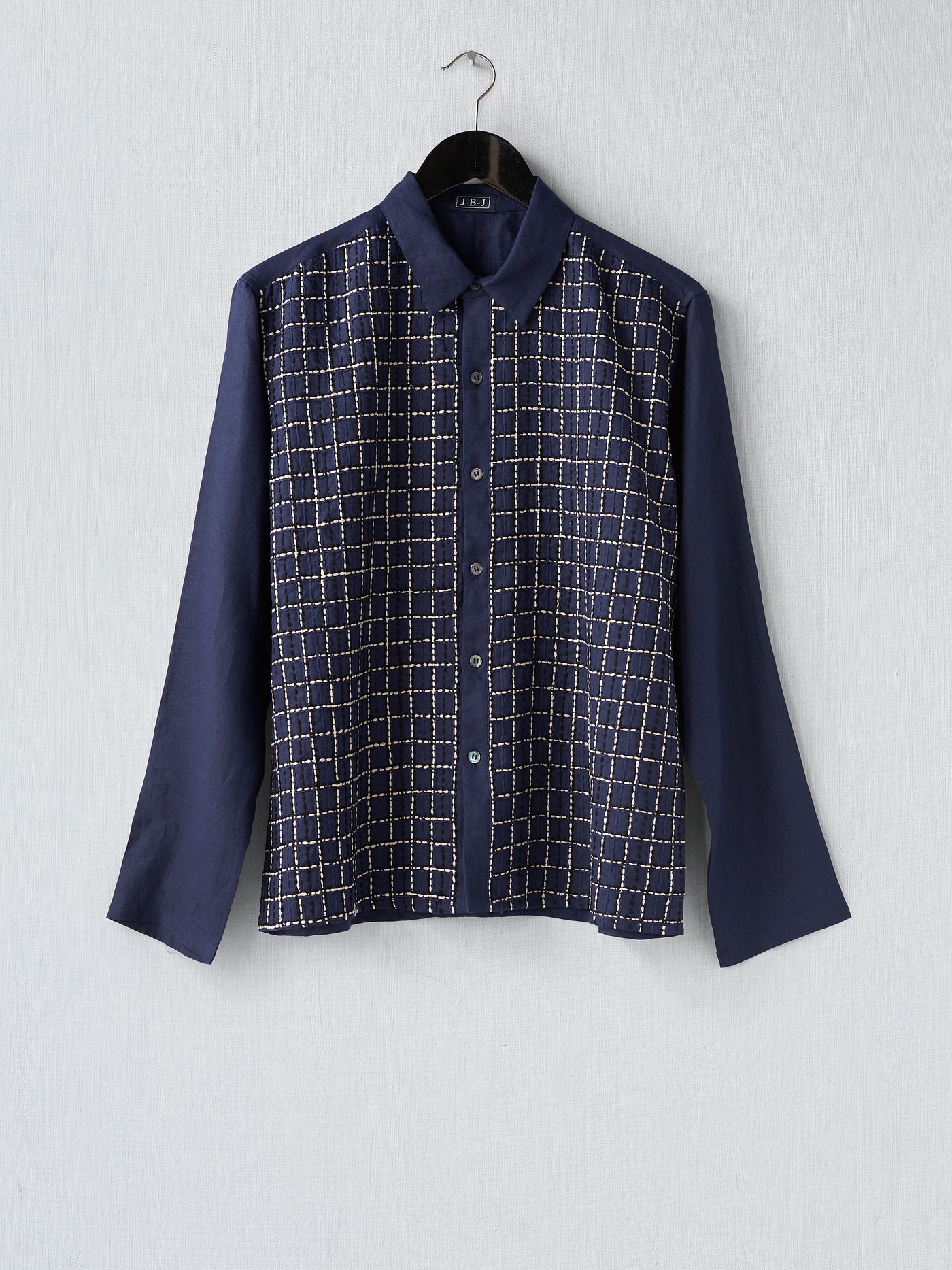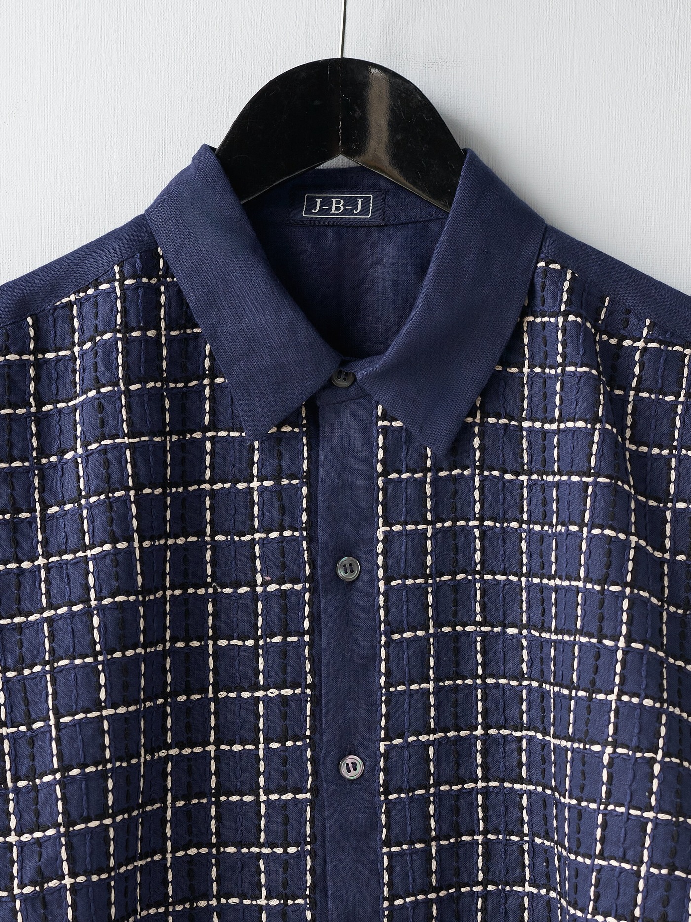 Intricately crafted, navy linen shirt, hand embroidered with a Tartan pattern, in cream and navy, on the front.
