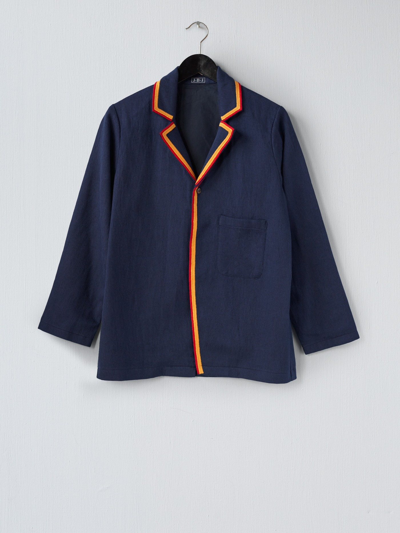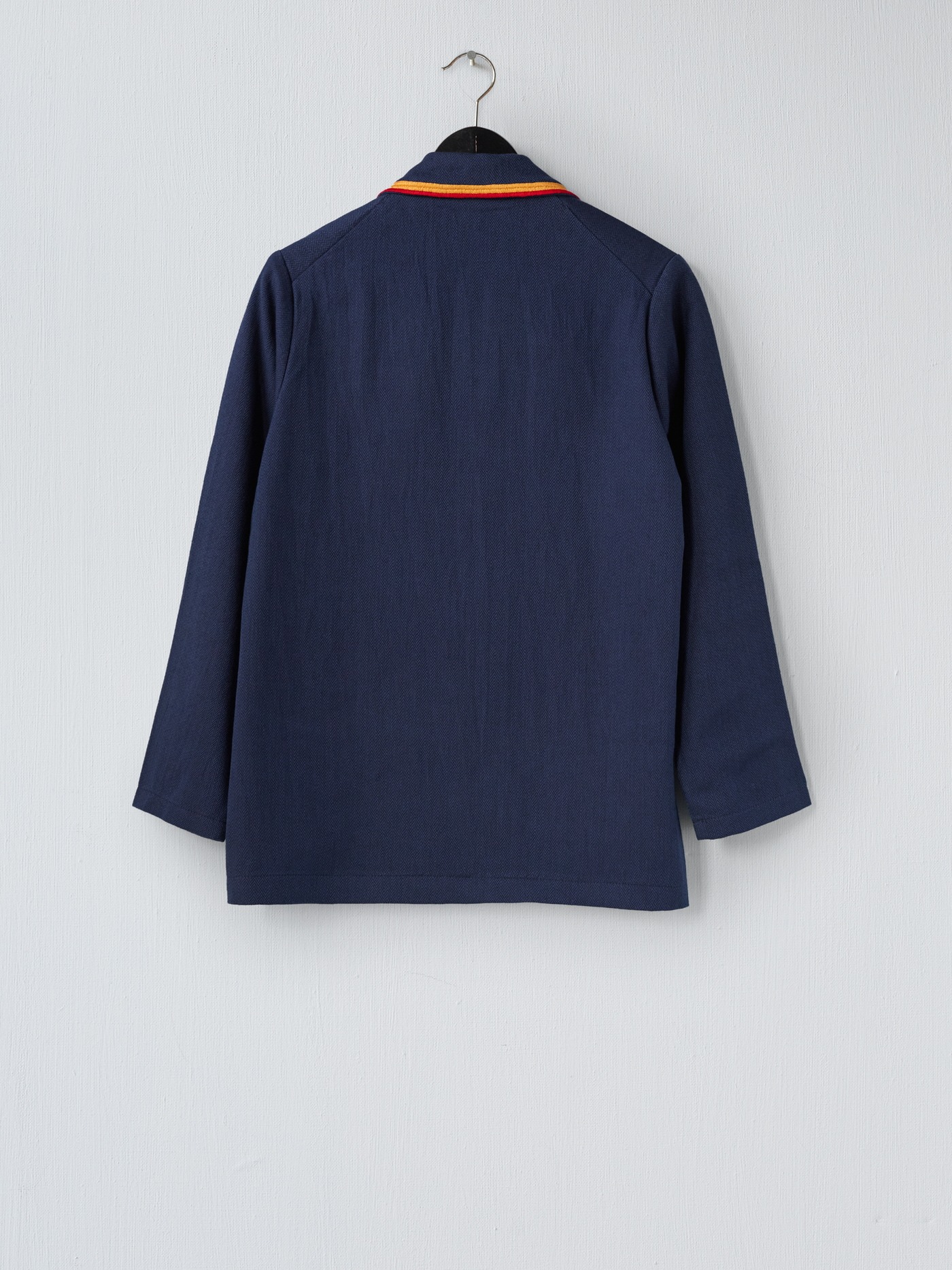Navy jacket, made of a light cotton wool blend fabric, with a hand embroidered contrasting border in orange and red.