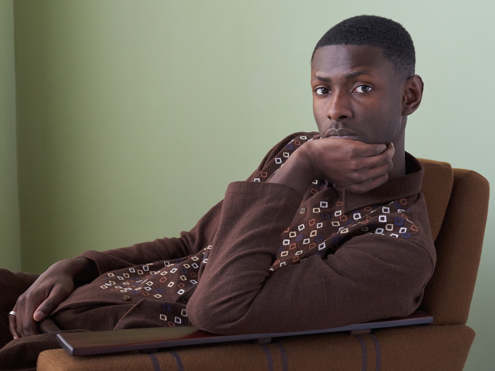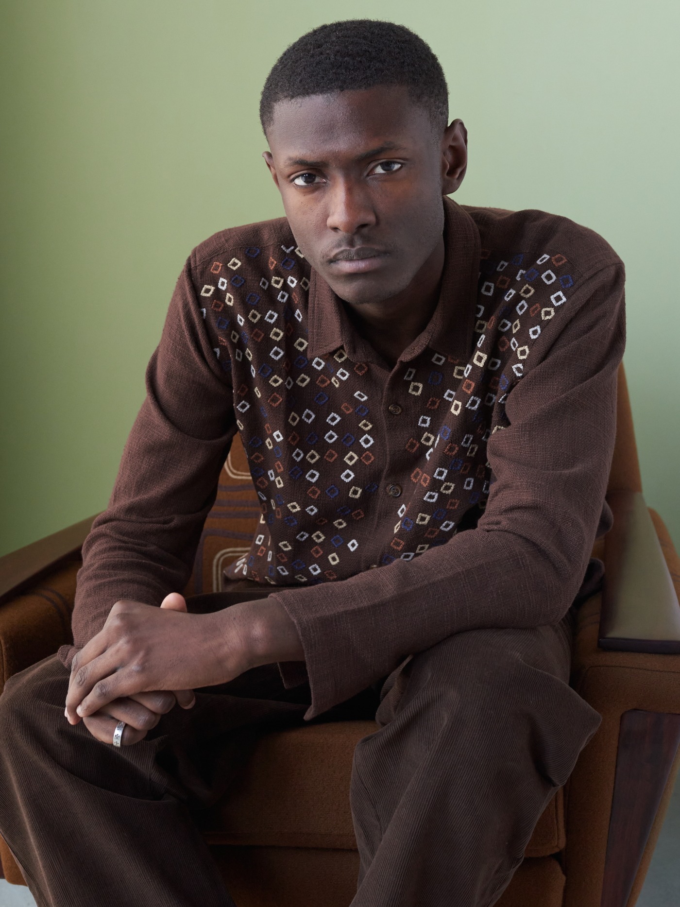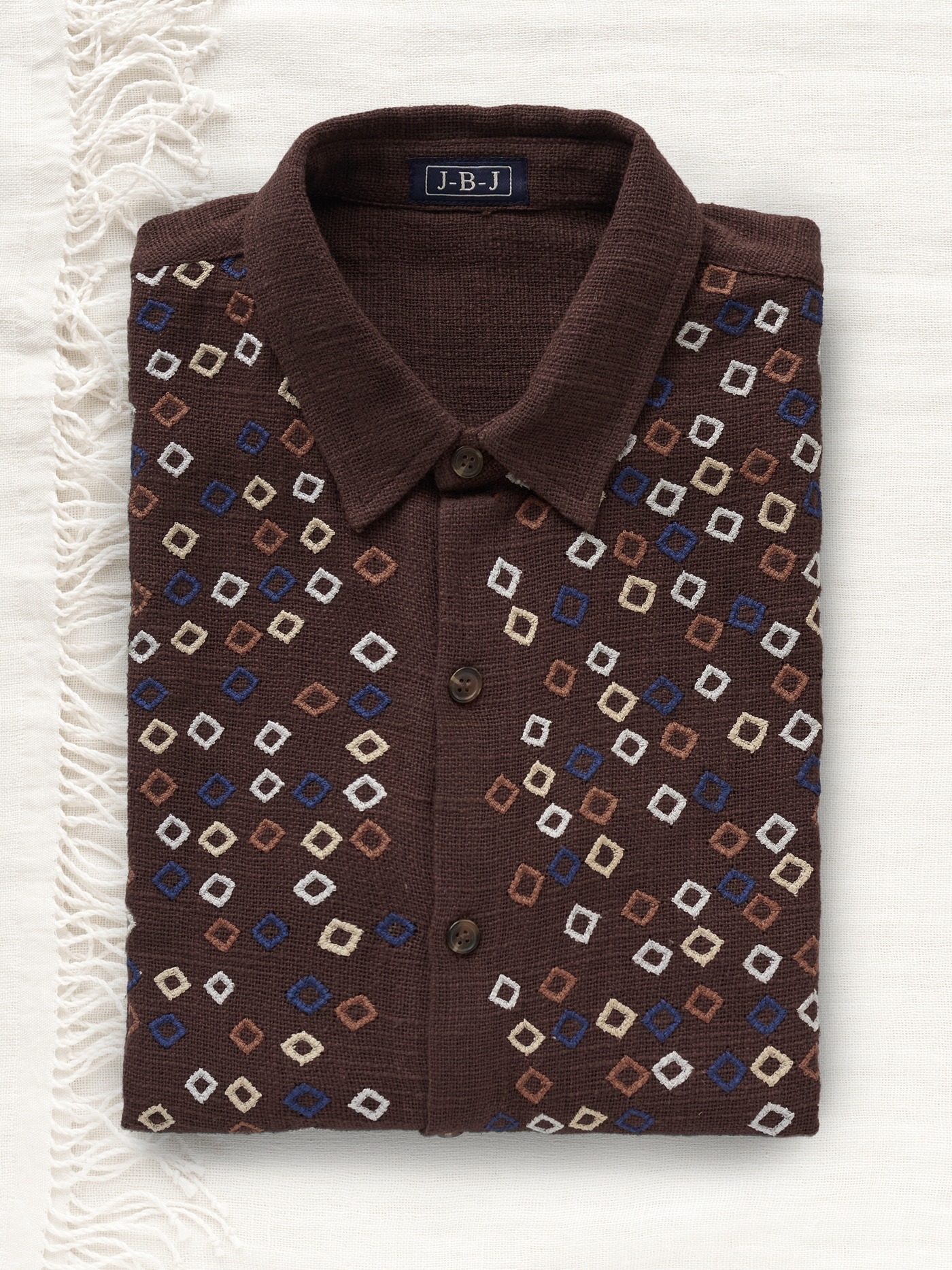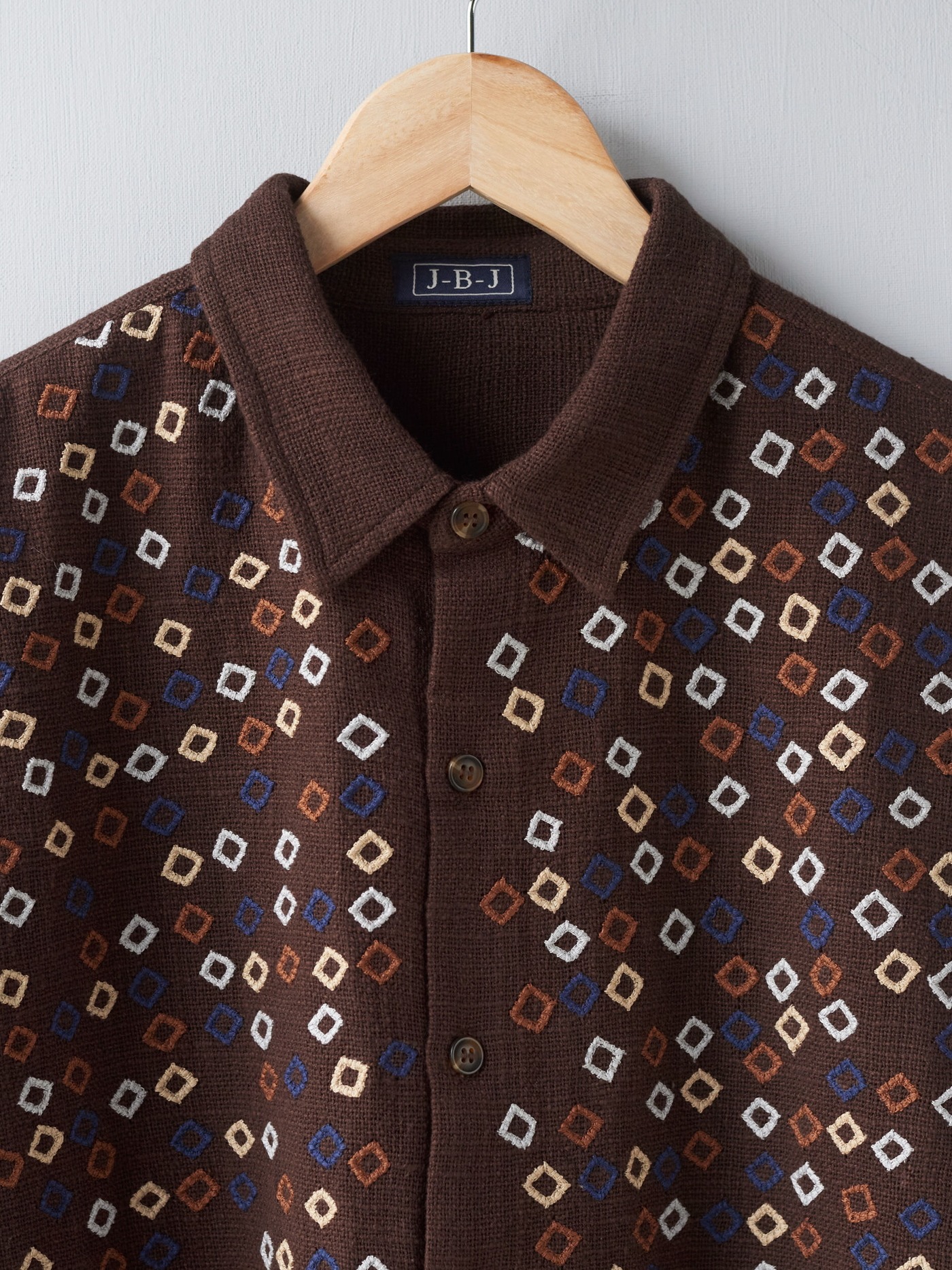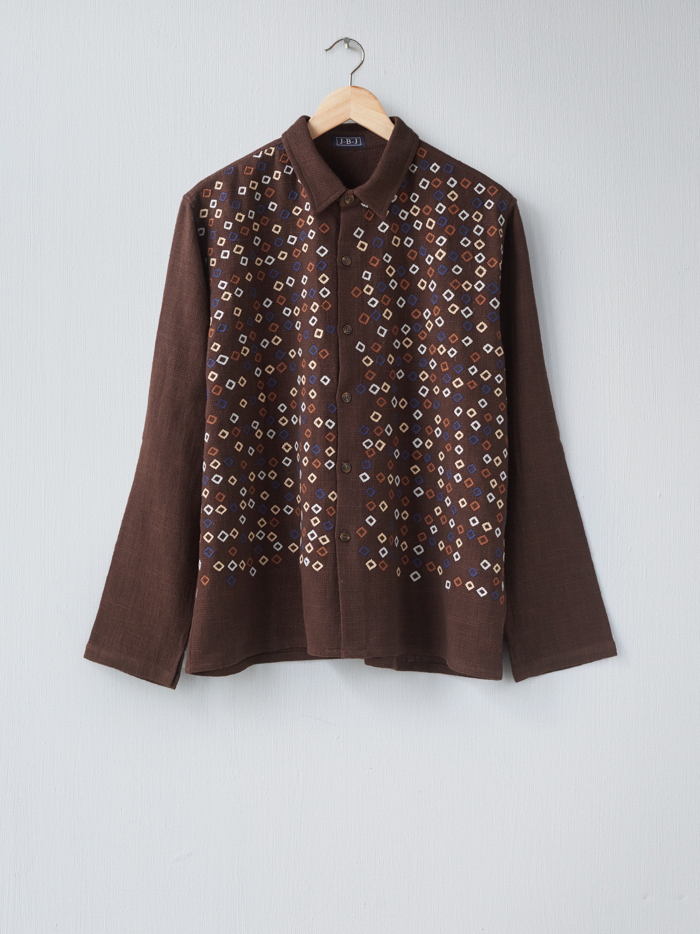 One of a kind brown Khadi cotton shirt, intricately hand embroidered on the front.