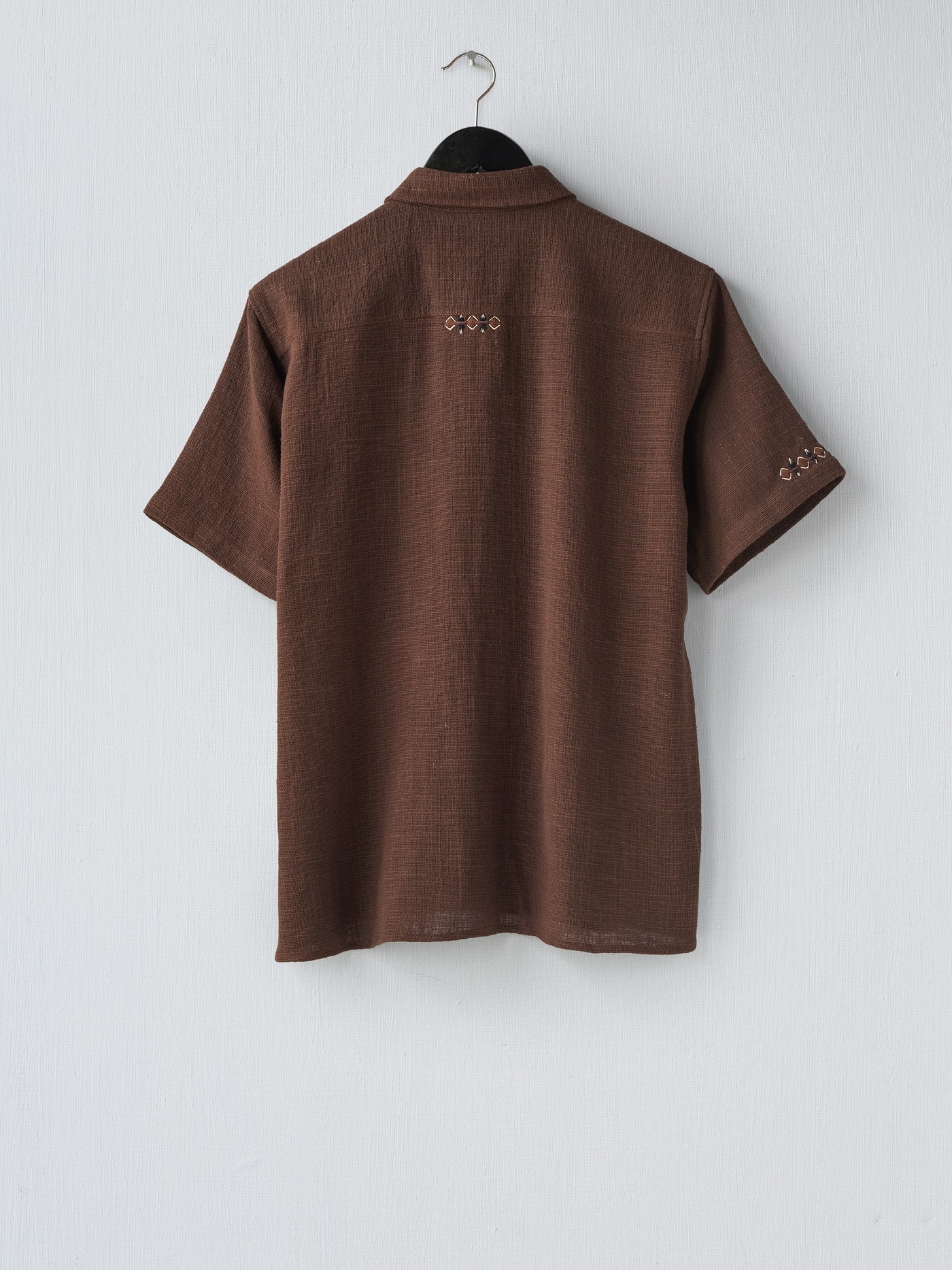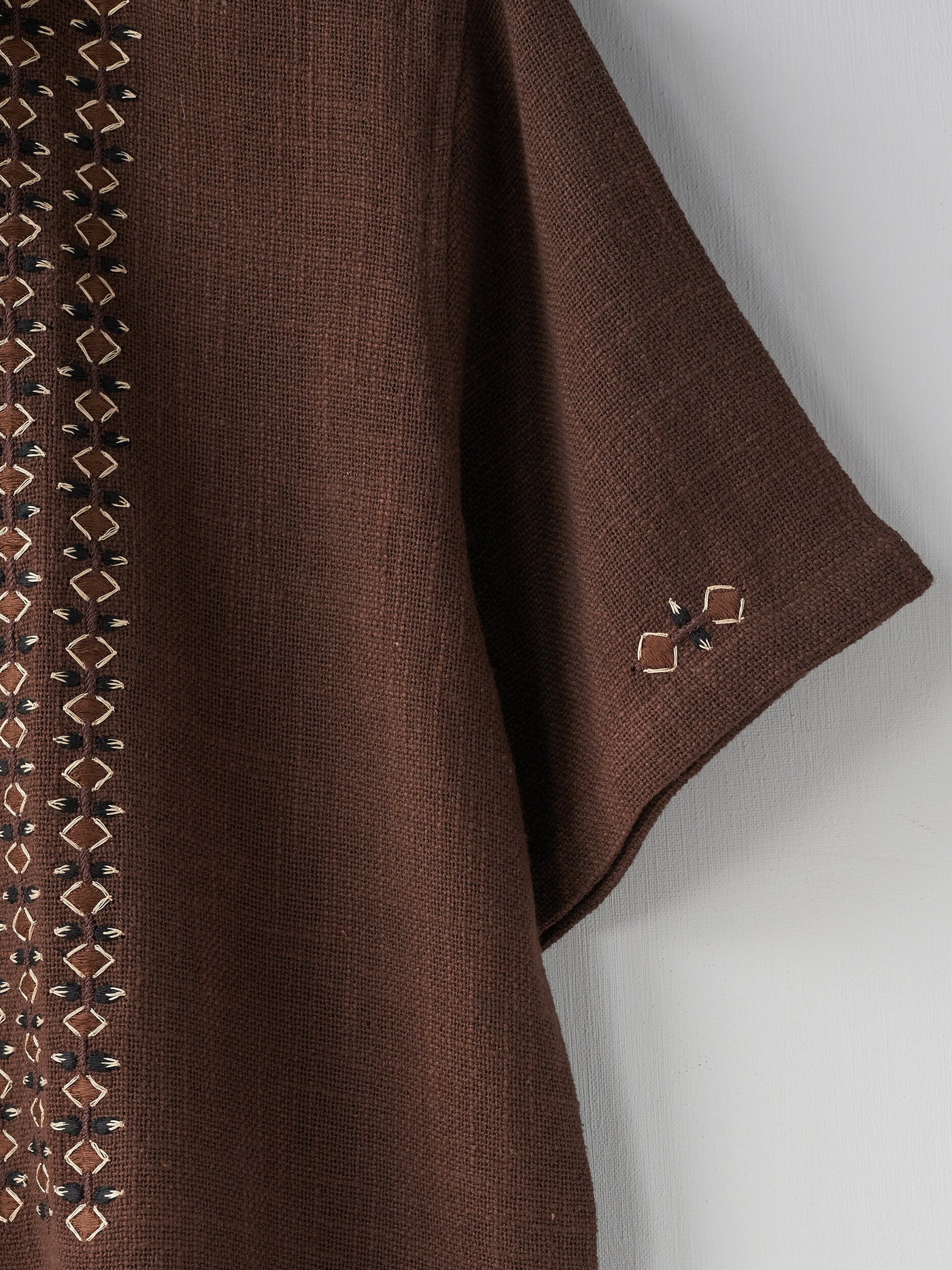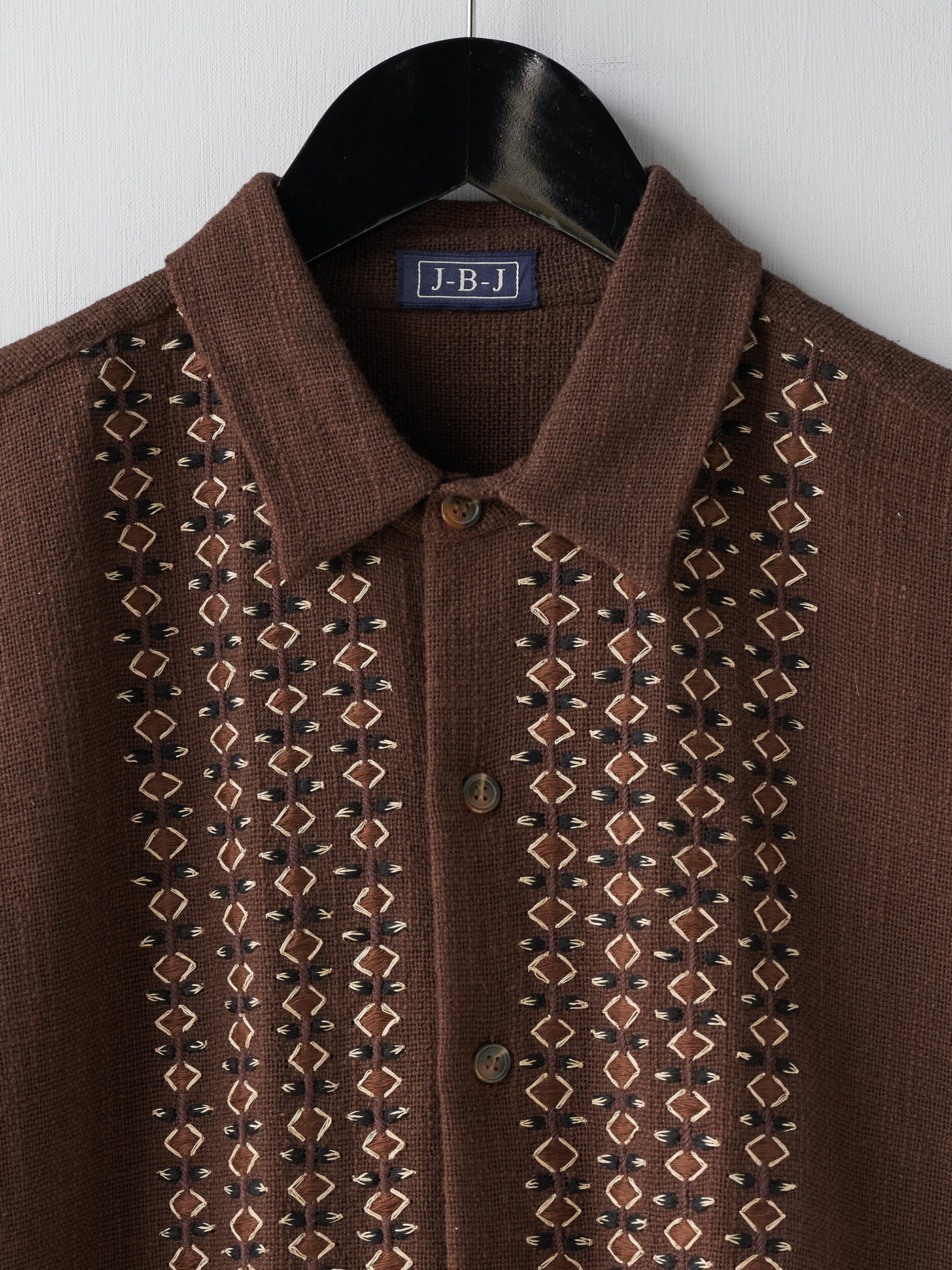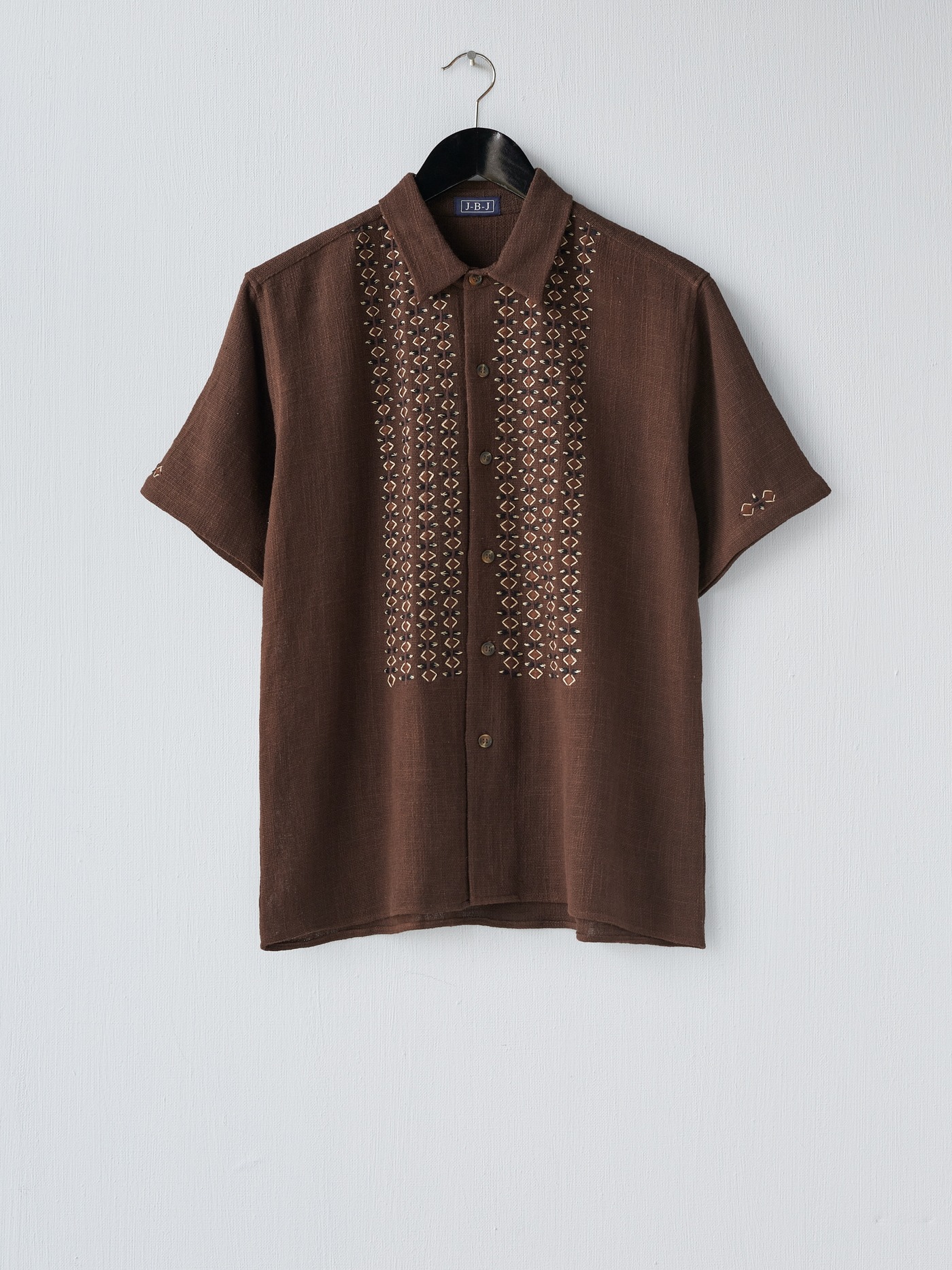 Brown cotton shirt with an intricate hand embroidered design in brown, cream and black.
