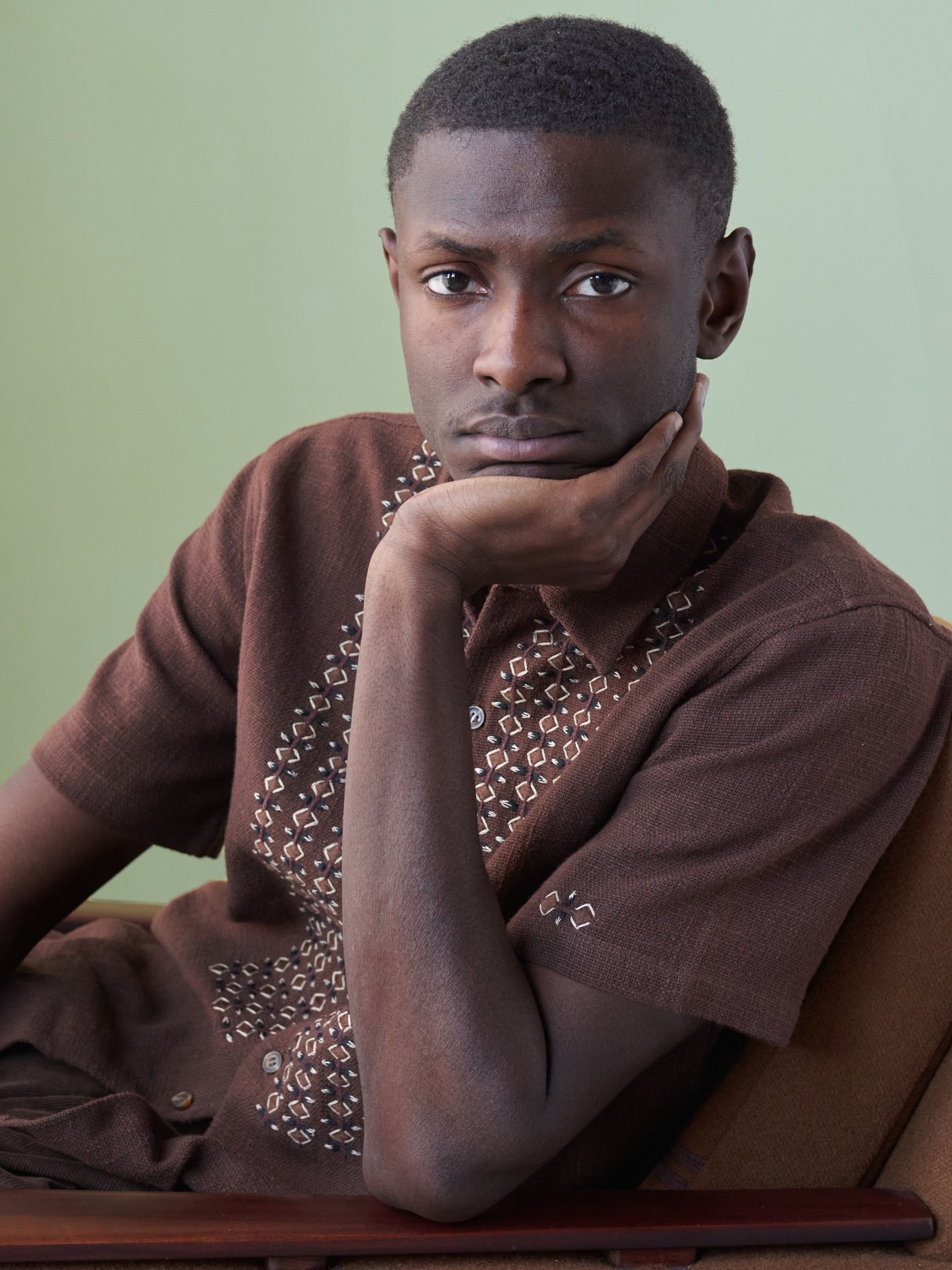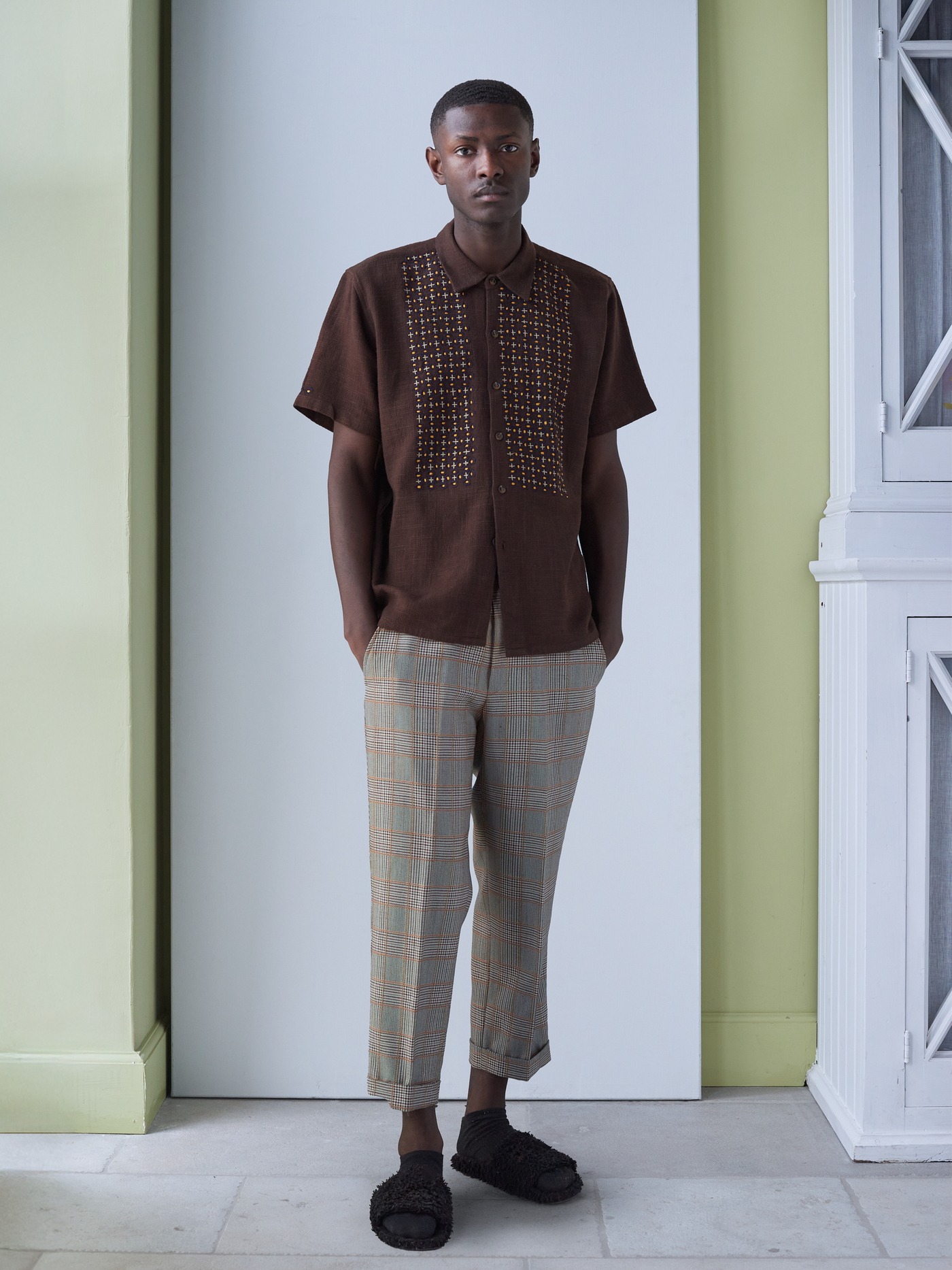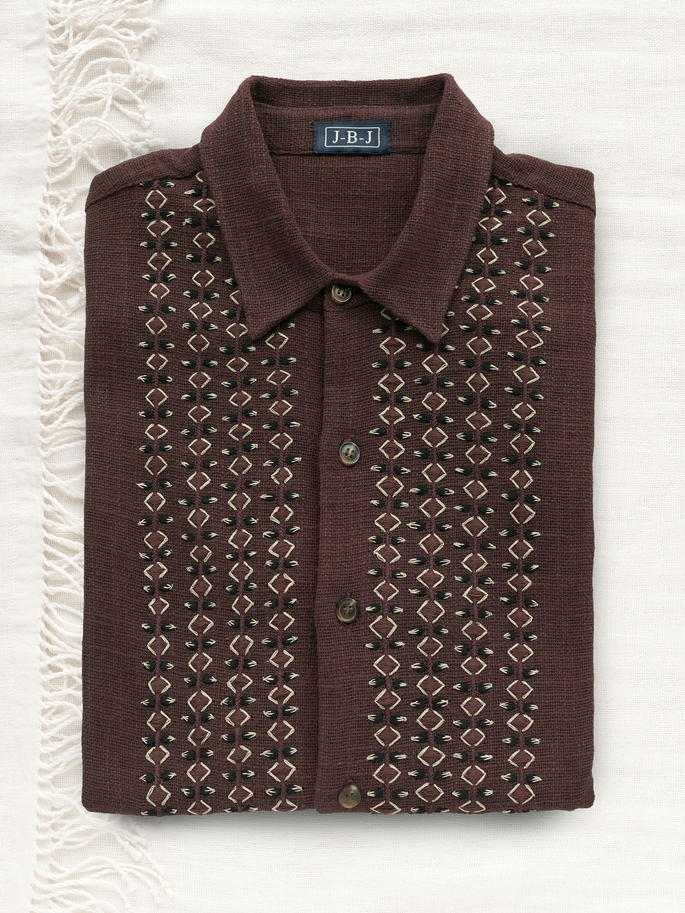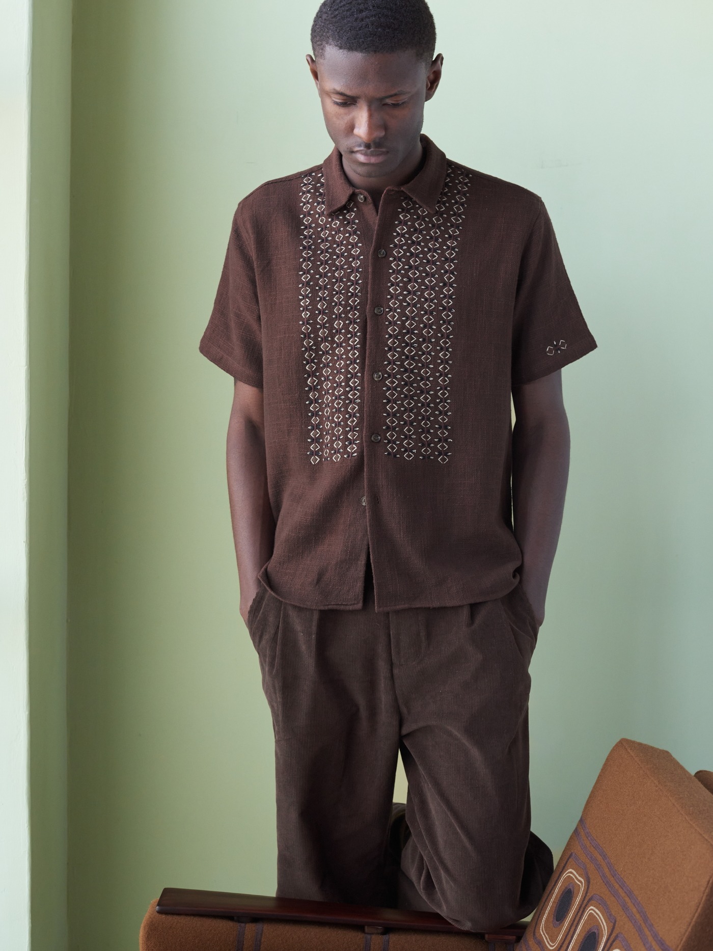 Brown cotton shirt with an intricate hand embroidered design in brown, cream and black.