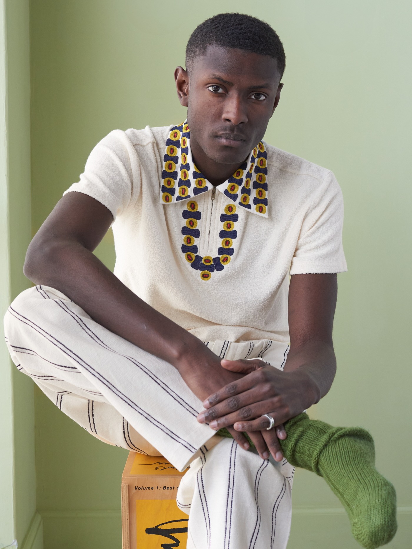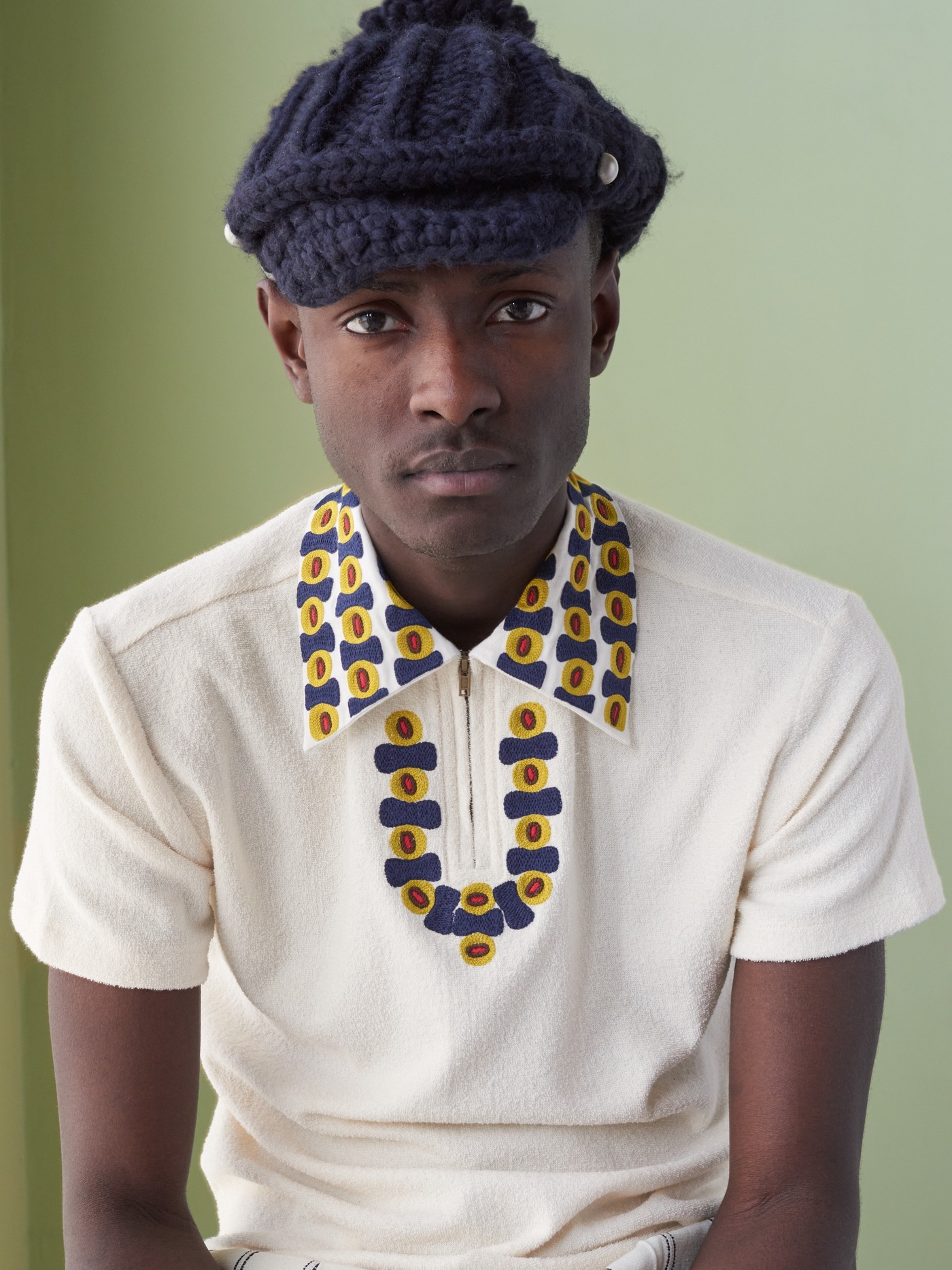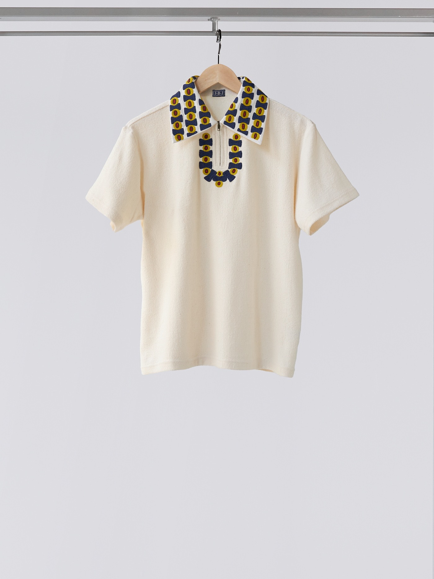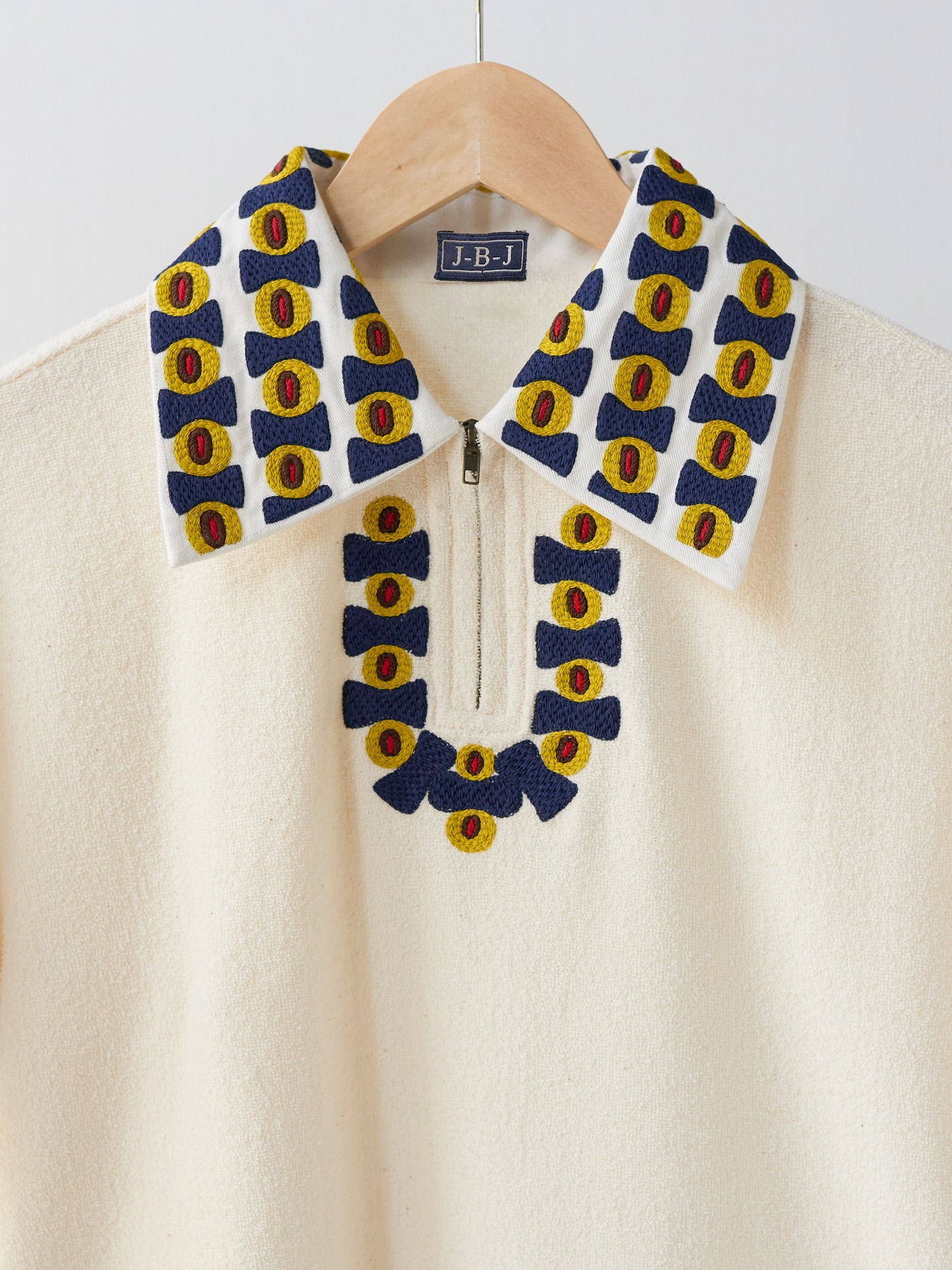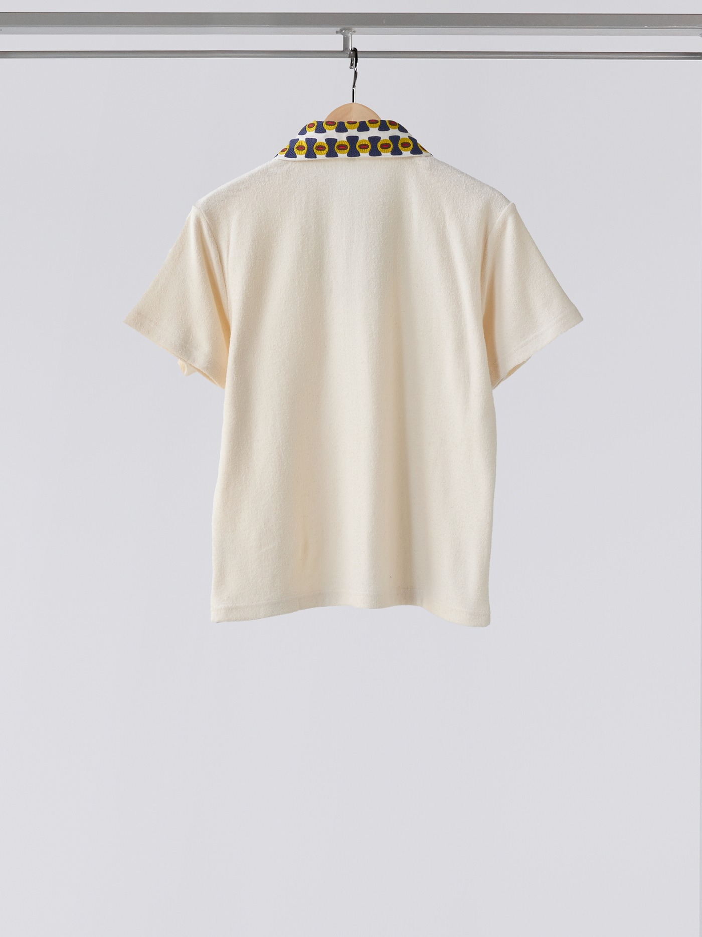 Cream Japanese Terry cotton Polo shirt, with an intricately hand embroidered collar made in lime yellow, dark navy, brown and red on cotton.