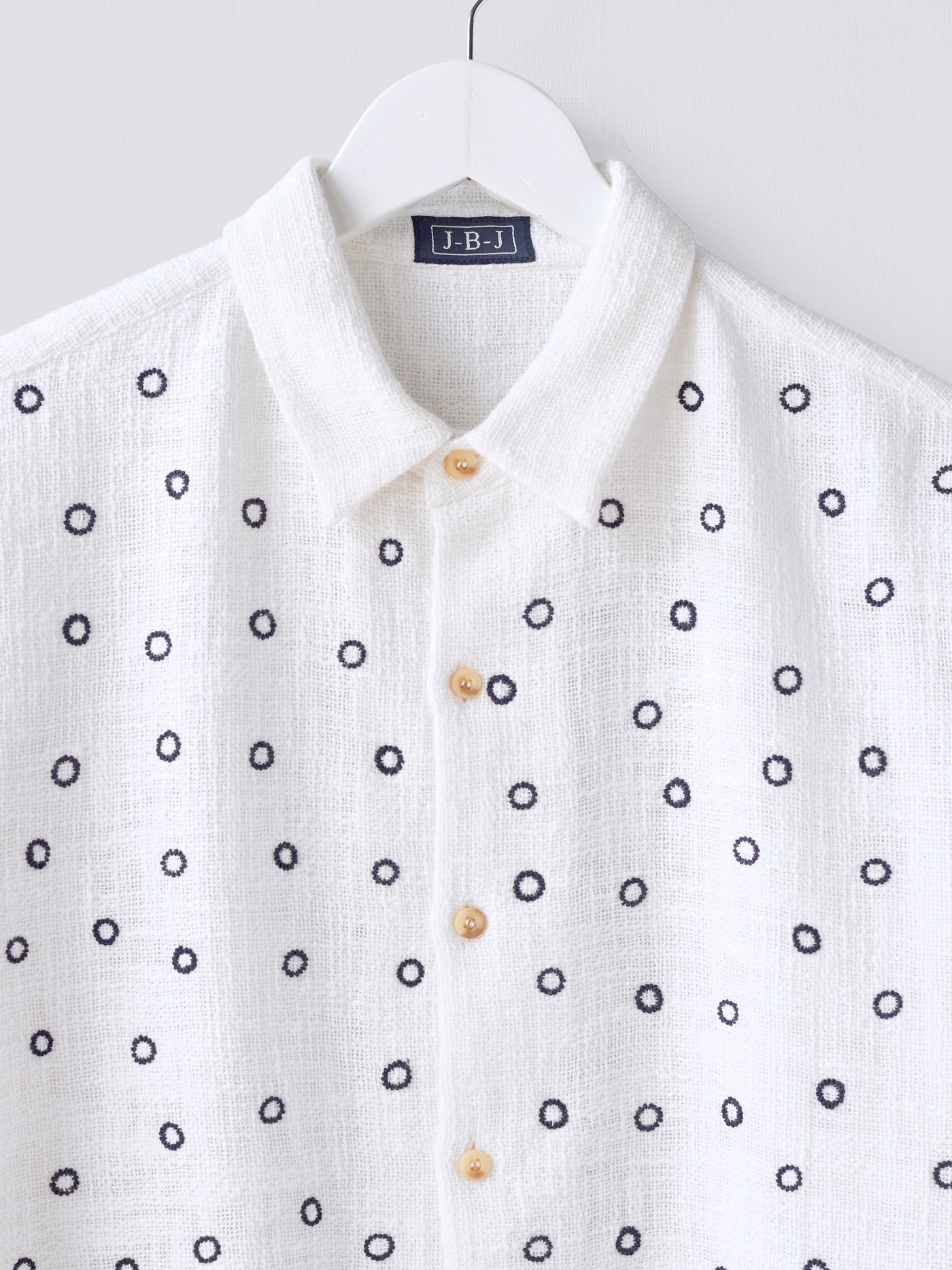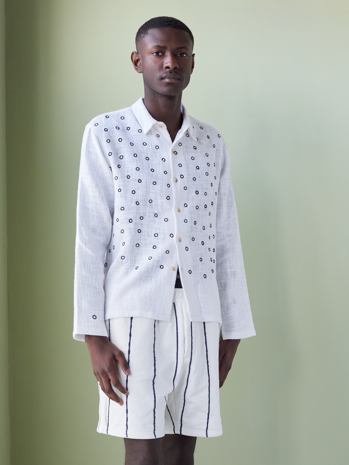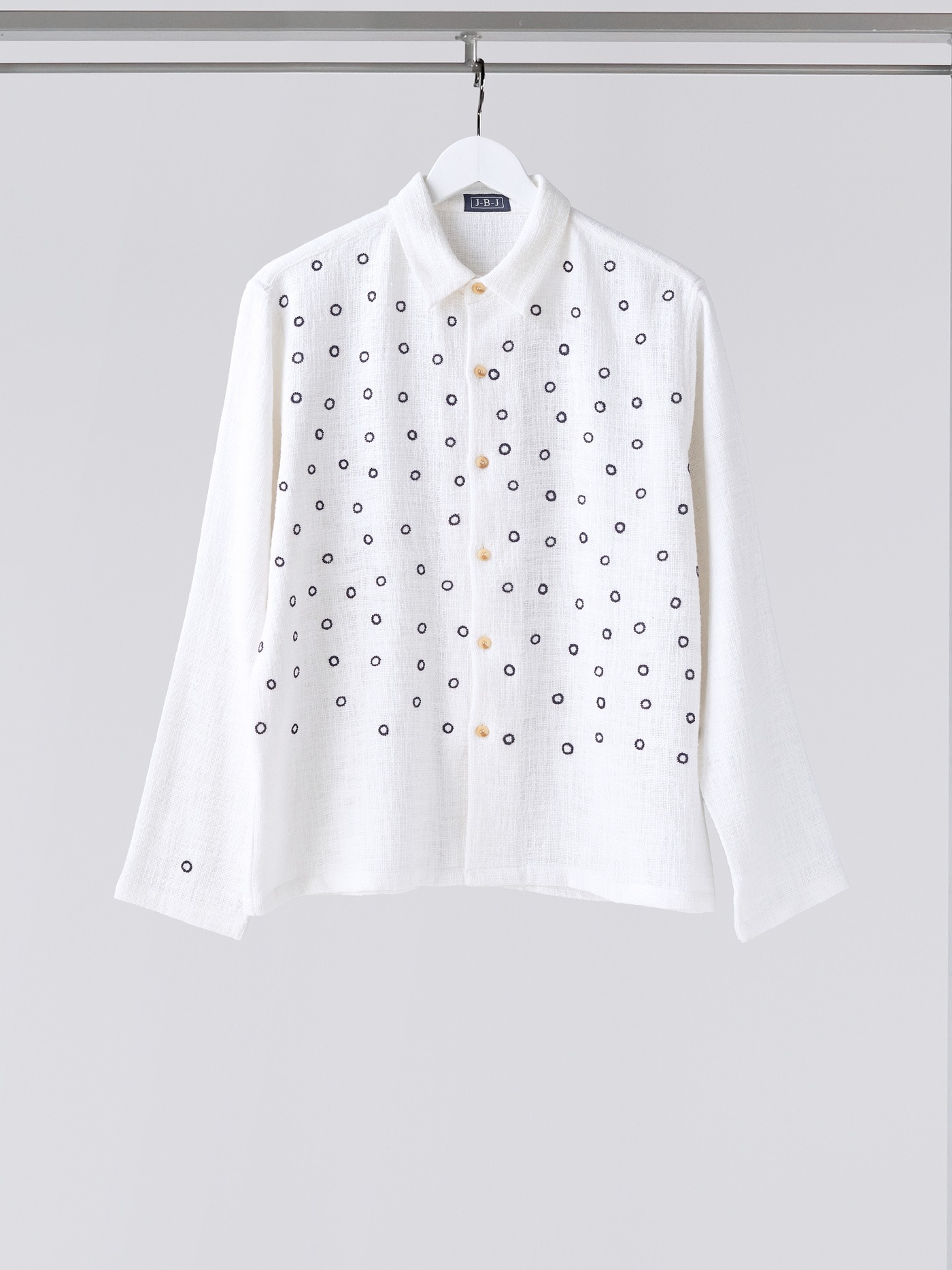 One of a kind khadi cotton shirt, hand embroidered with a circular design all over.