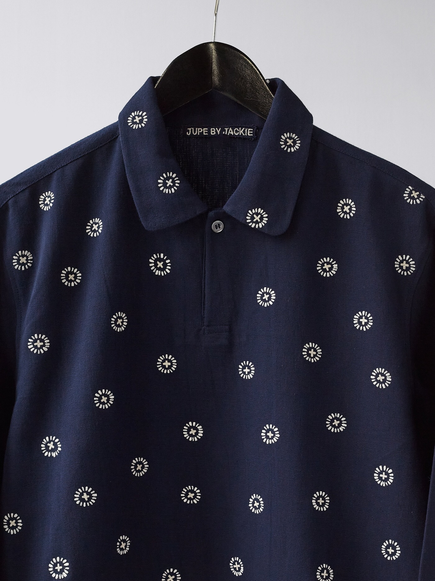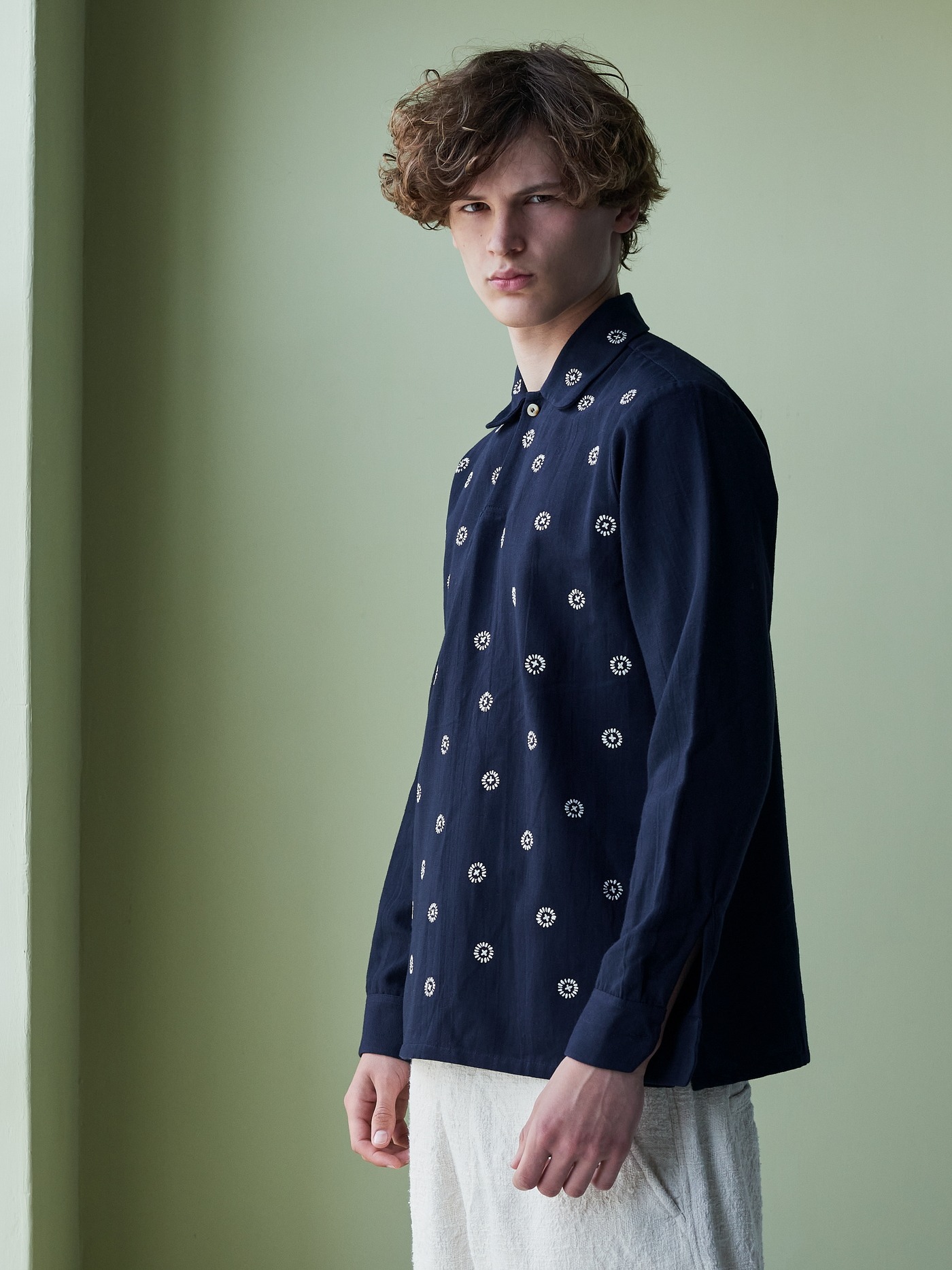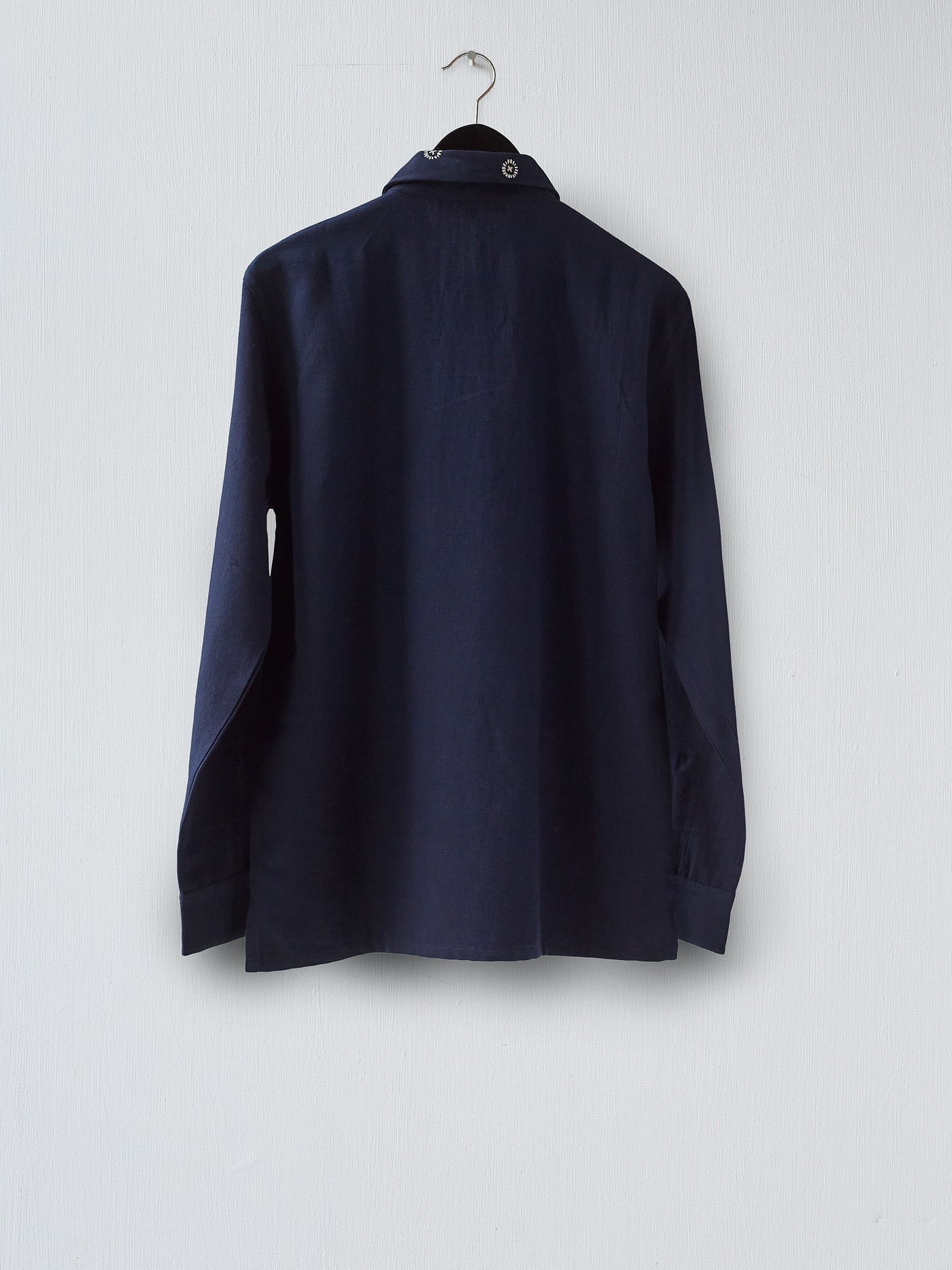 One of a kind linen shirt, hand embroidered with unique little circular details.