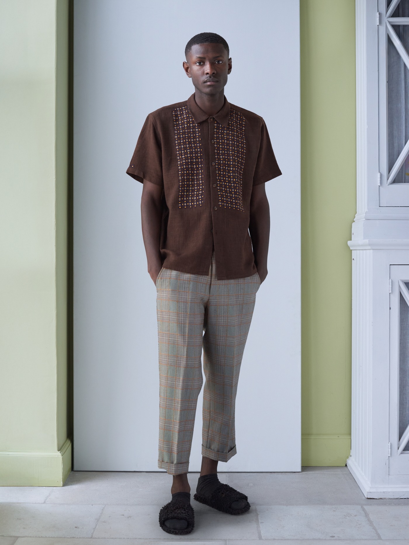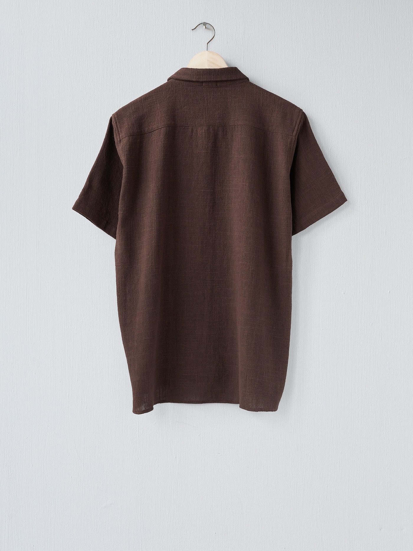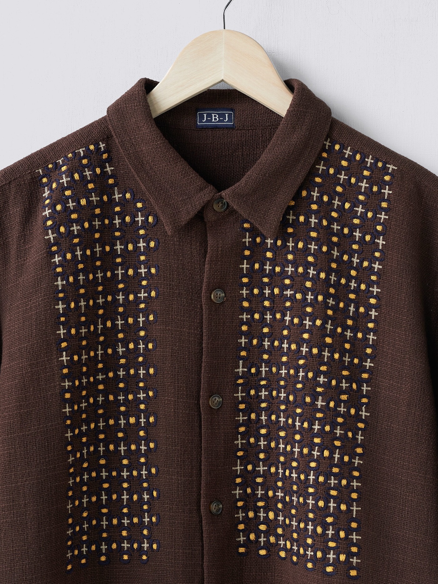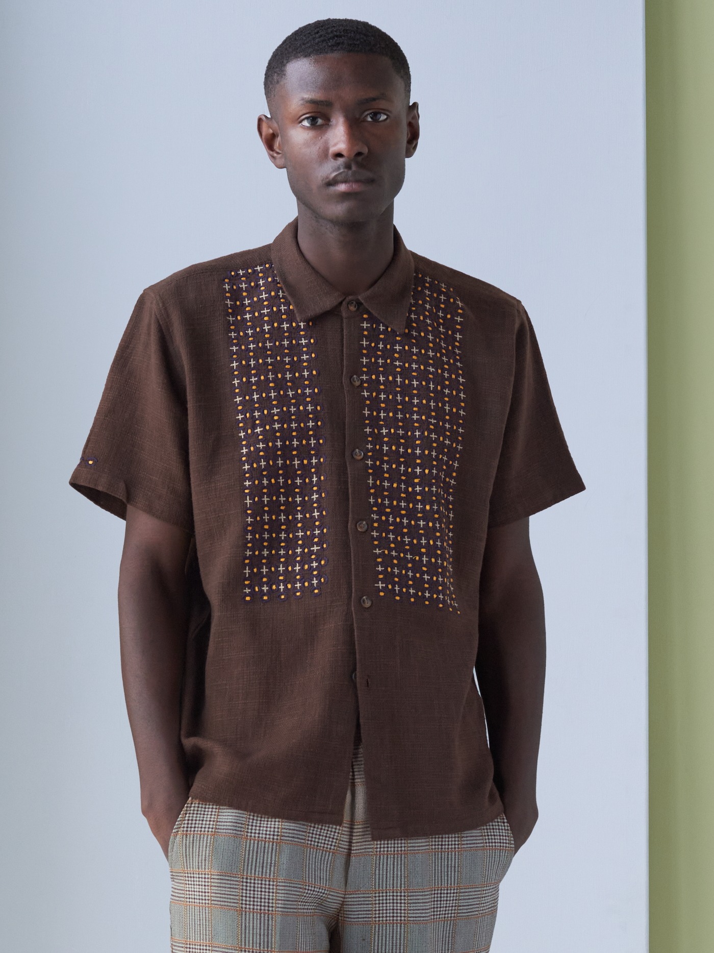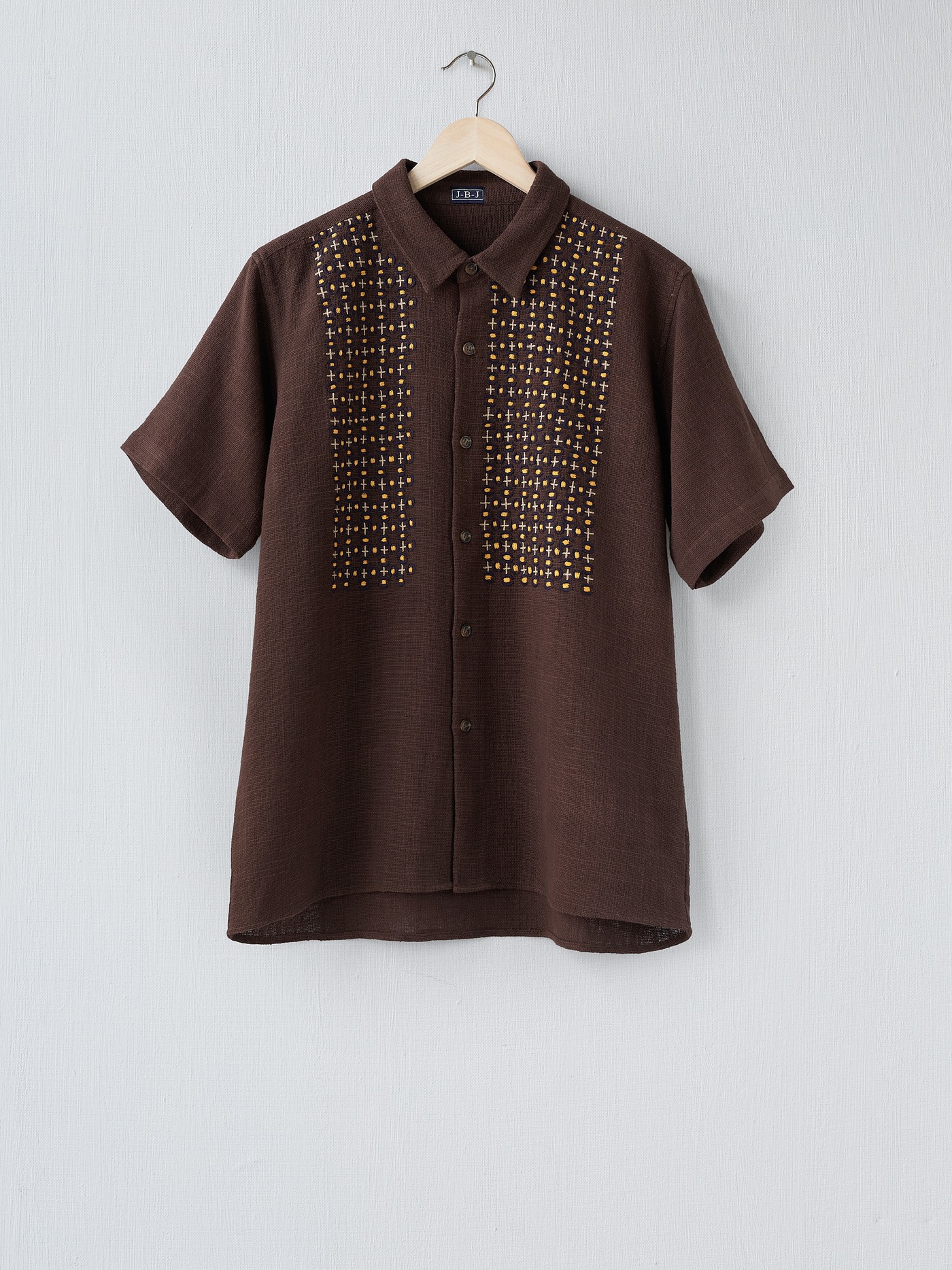 Brown Khadi cotton short sleeve shirt with hand embroidered details in orange brown , dark navy and cream.