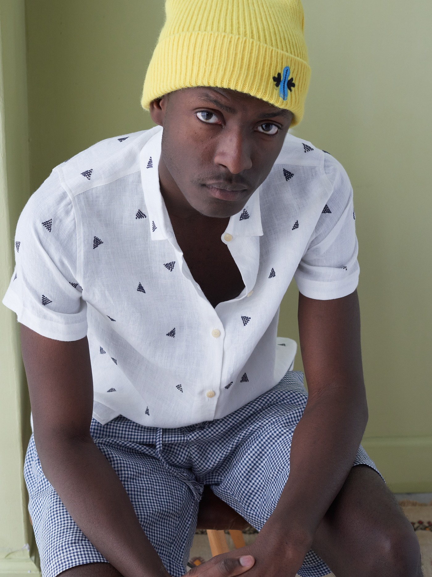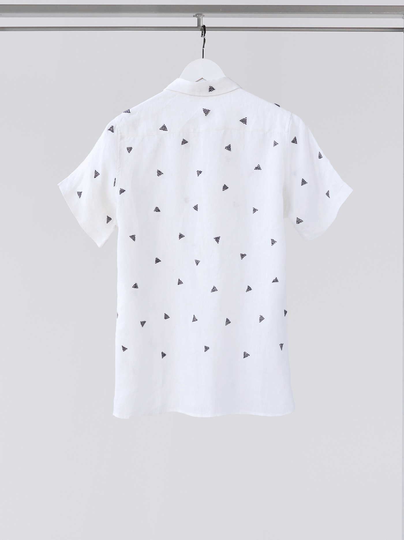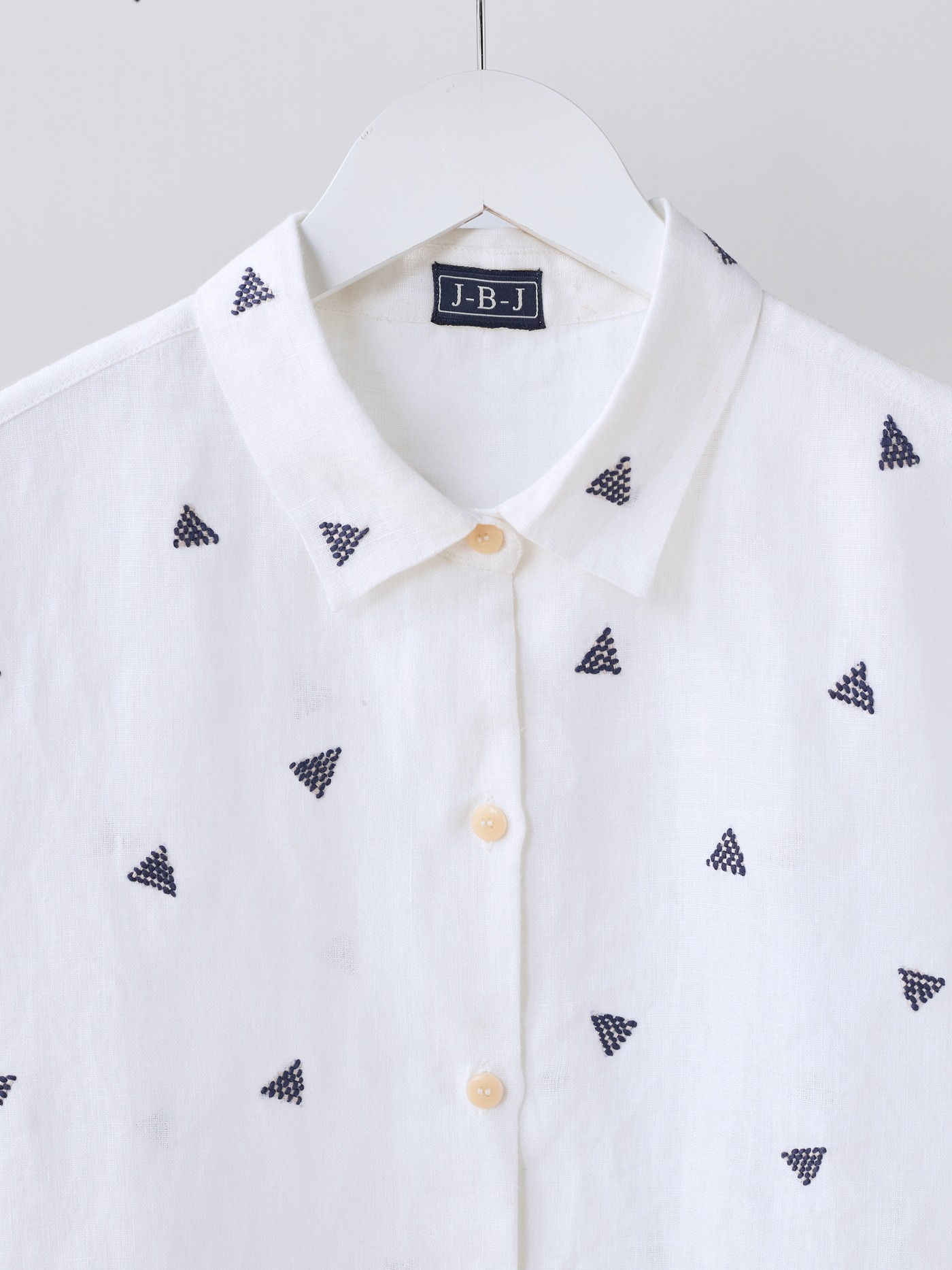 White short sleeved linen shirt; details all hand embroidered in navy.