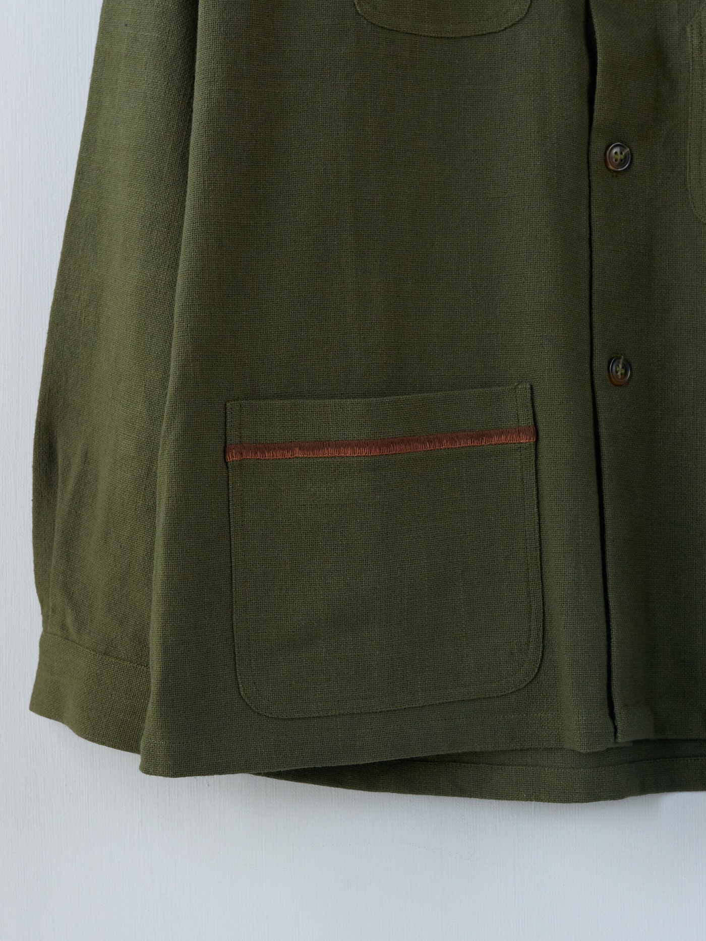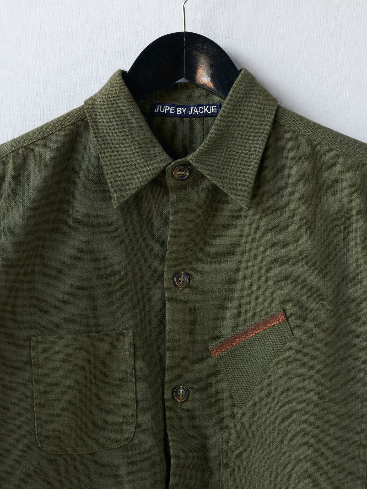 Army green cotton "jacket shirt" , characterized by the smart hand embroidered details in two tones of brown.