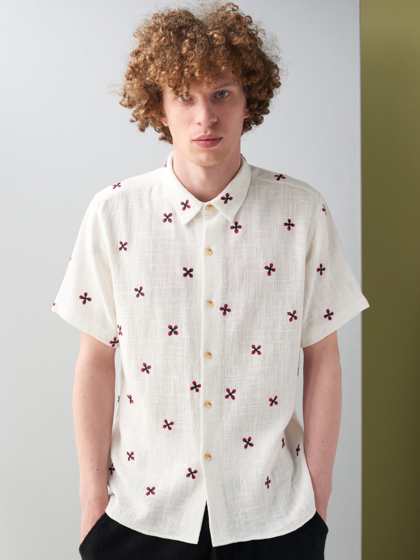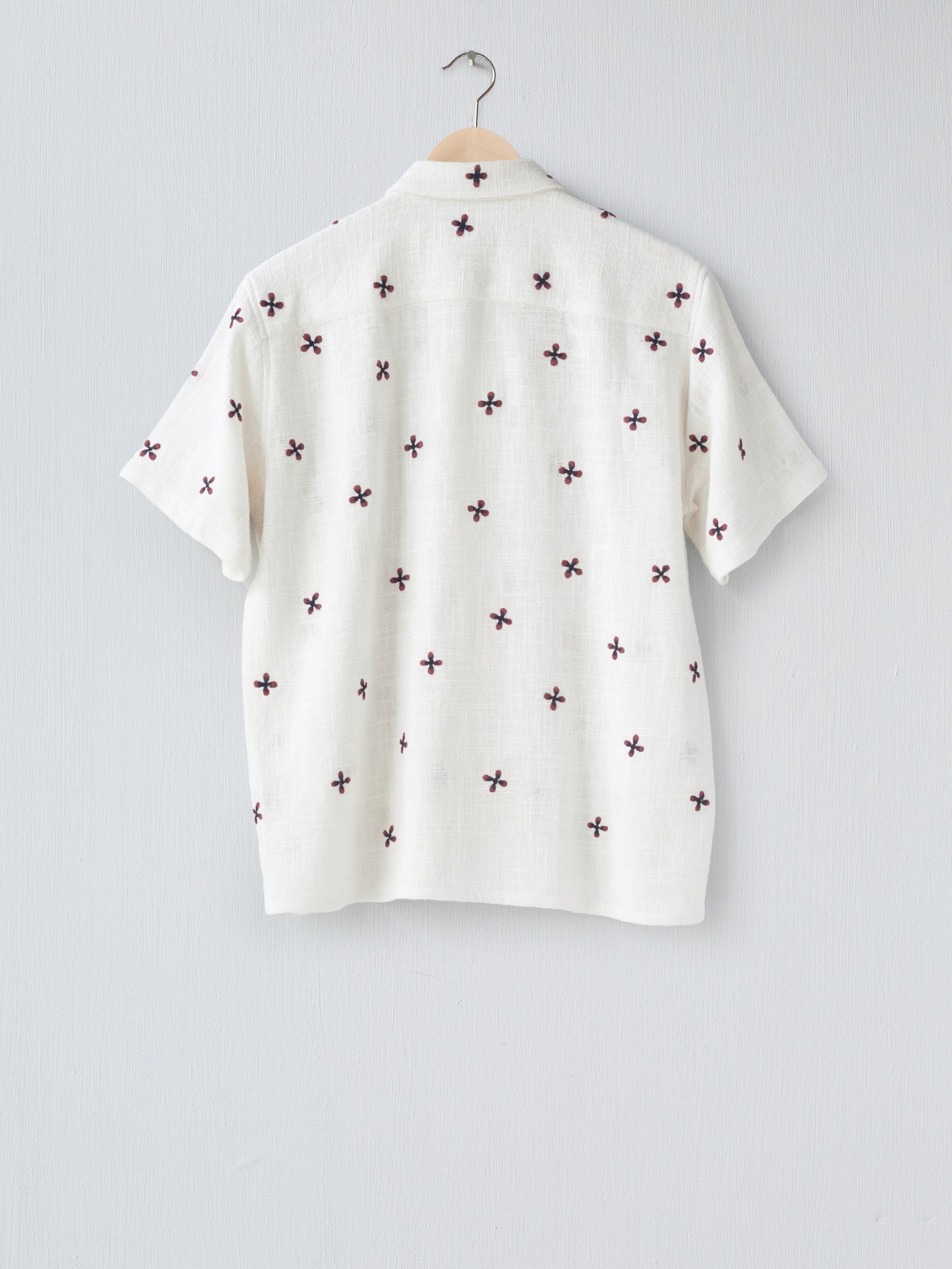Off white cotton shirt with an intricate hand embroidered floral design, in deep red and navy, all over.