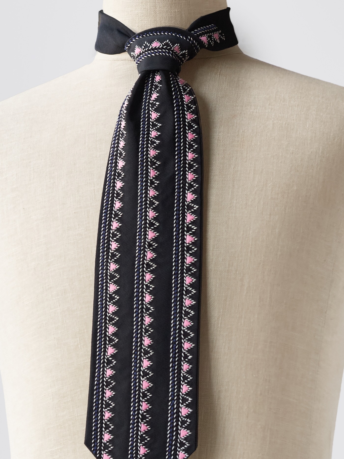 Black silk tie, hand embroidered with navy, cream and pink details. Comes in a giftbox.