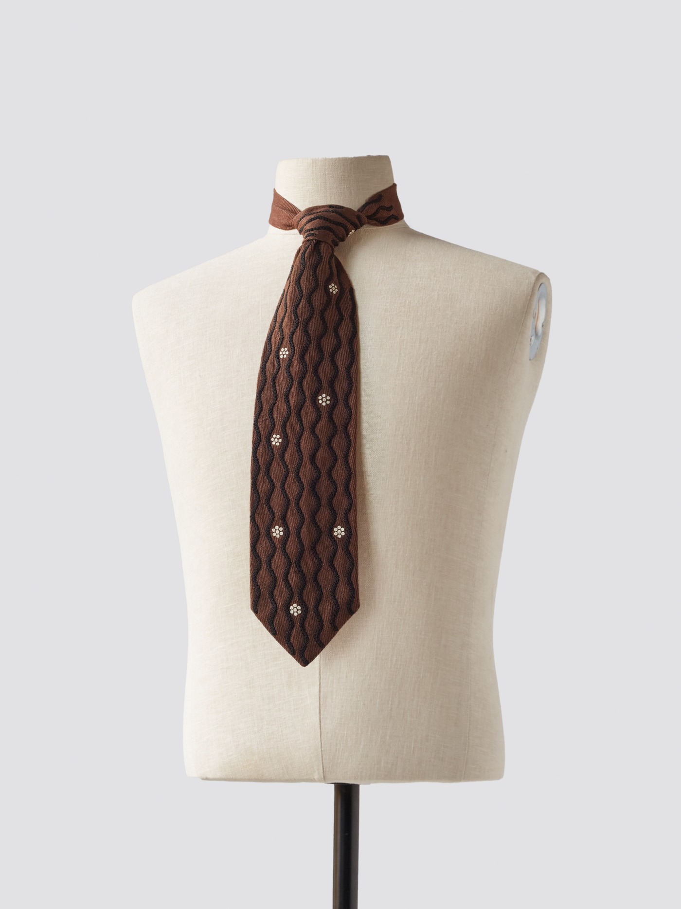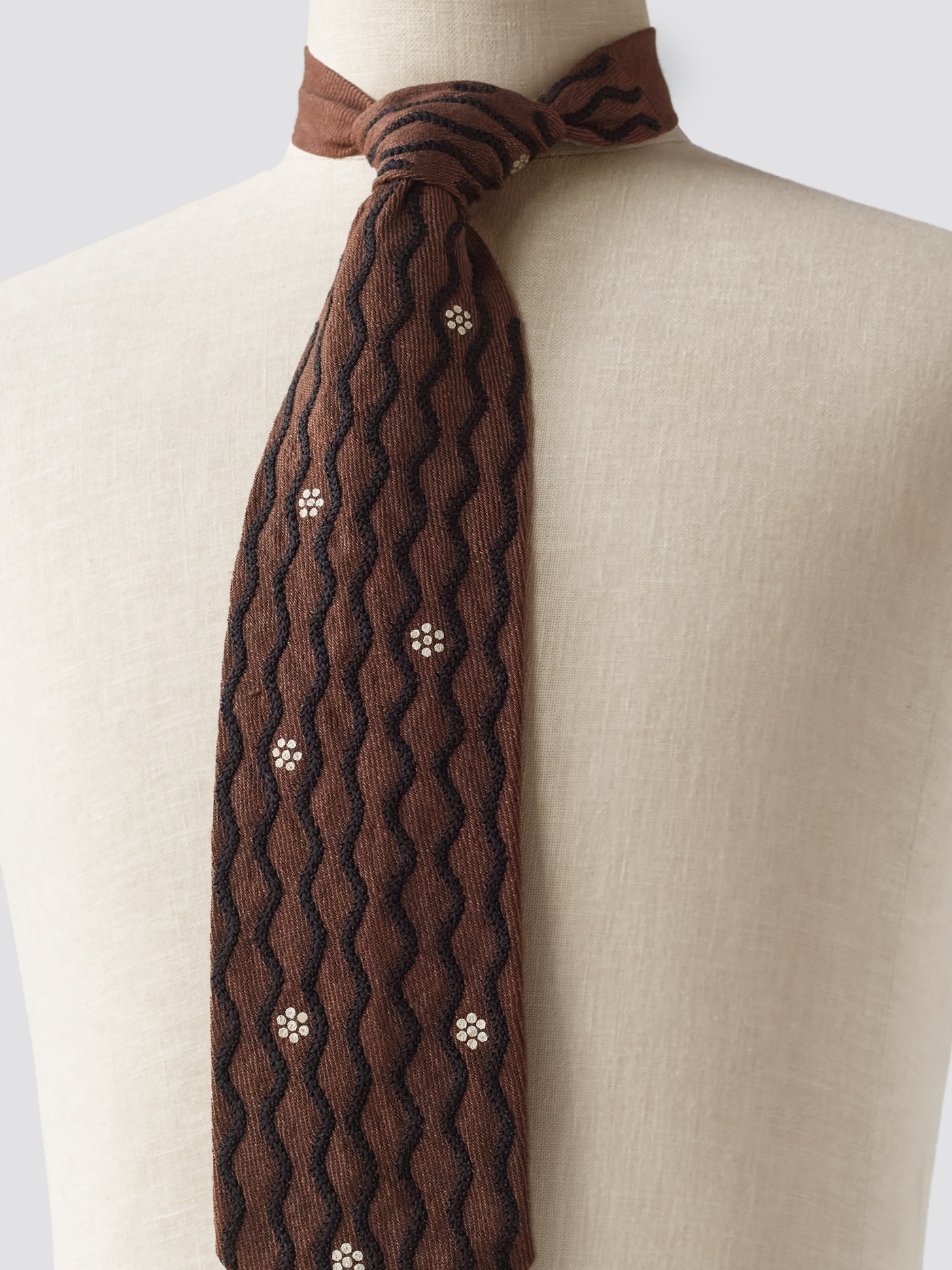 Handmade intricate embroidered design on a wide brown linen wool tie.