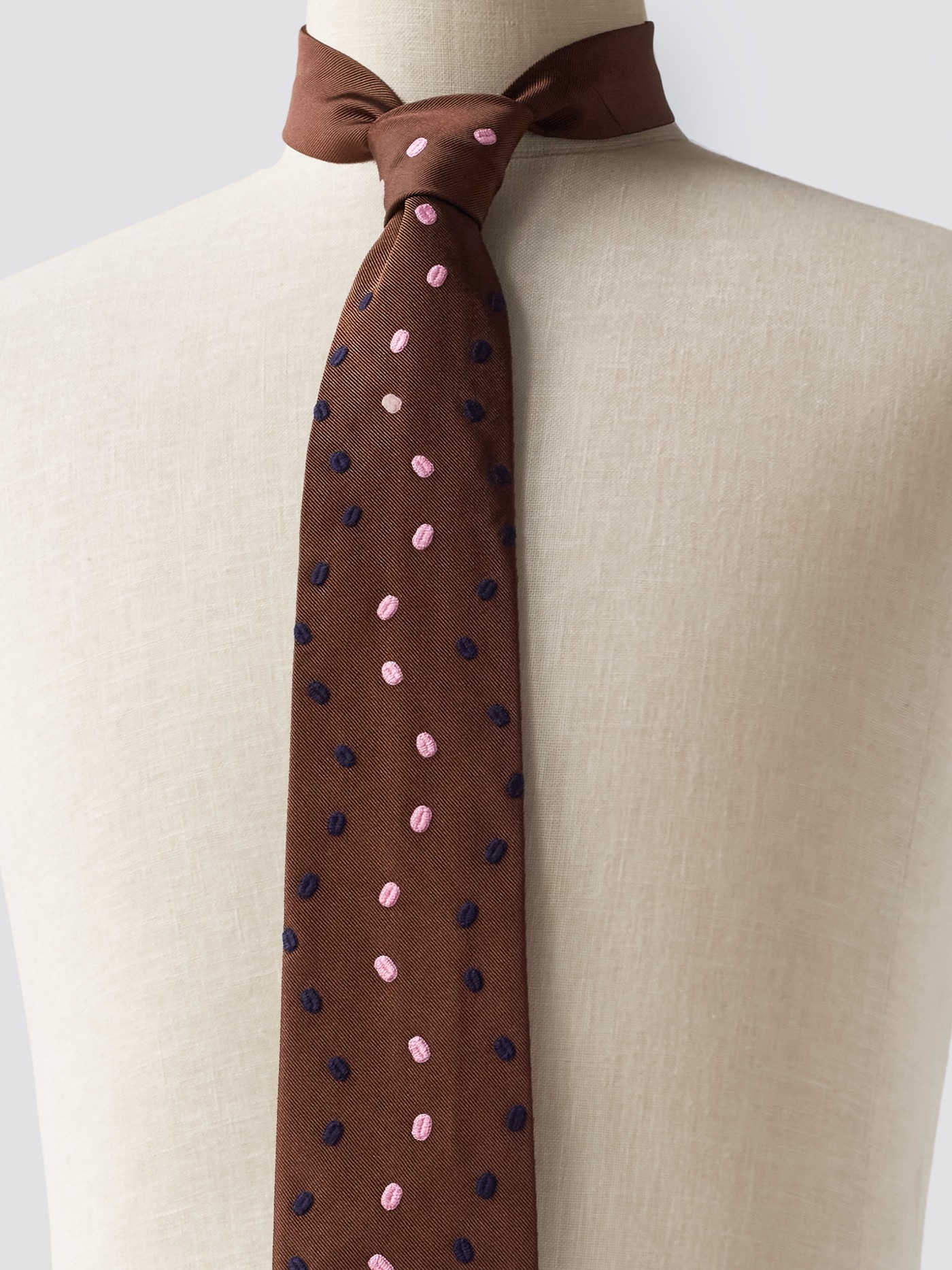 Dark navy and pink embroidered details on a brown silk base. This unique tie comes in a giftbox.