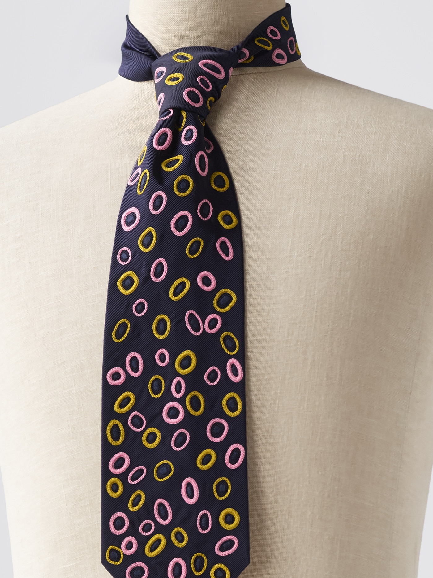 Sophisticated navy silk tie, hand embroidered with a pink, gold mustard , and lime yellow design.
