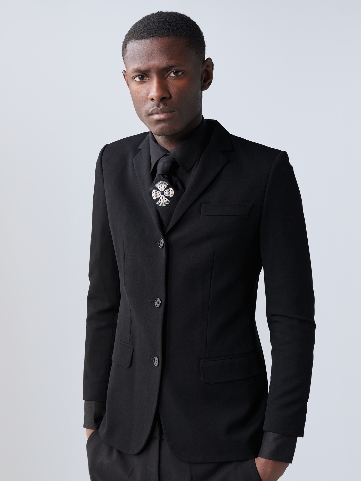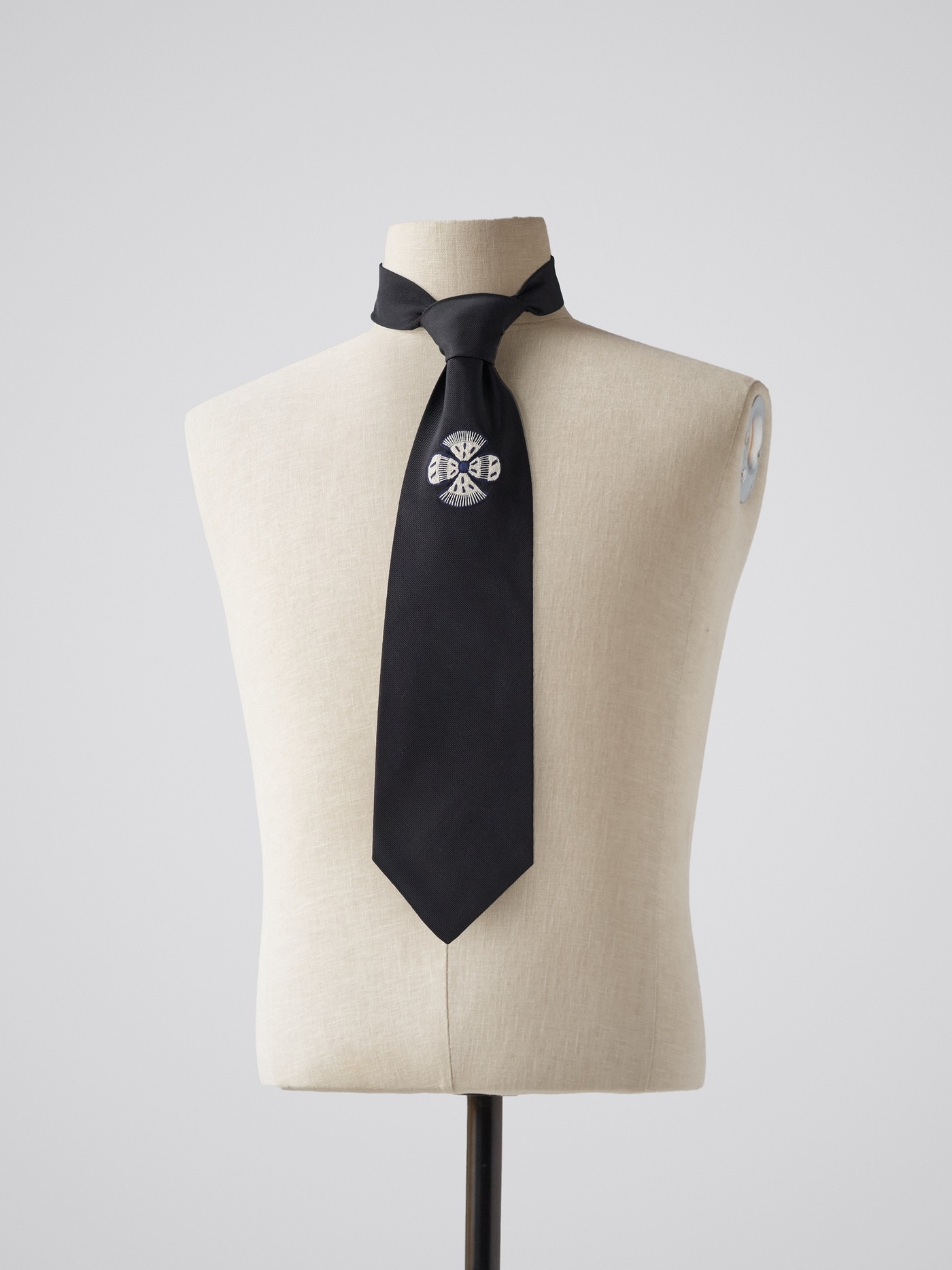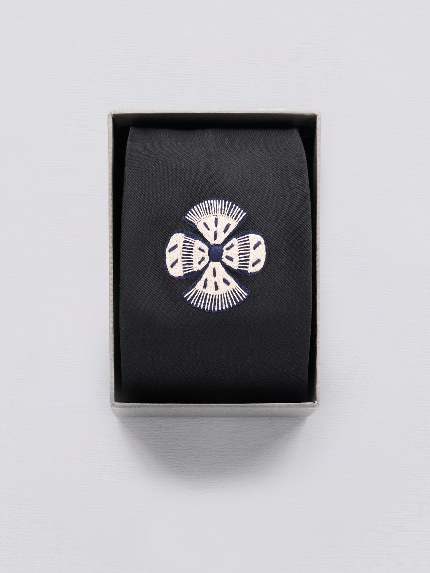 This stunning black silk tie is designed with a single striking flower in cream and navy.
