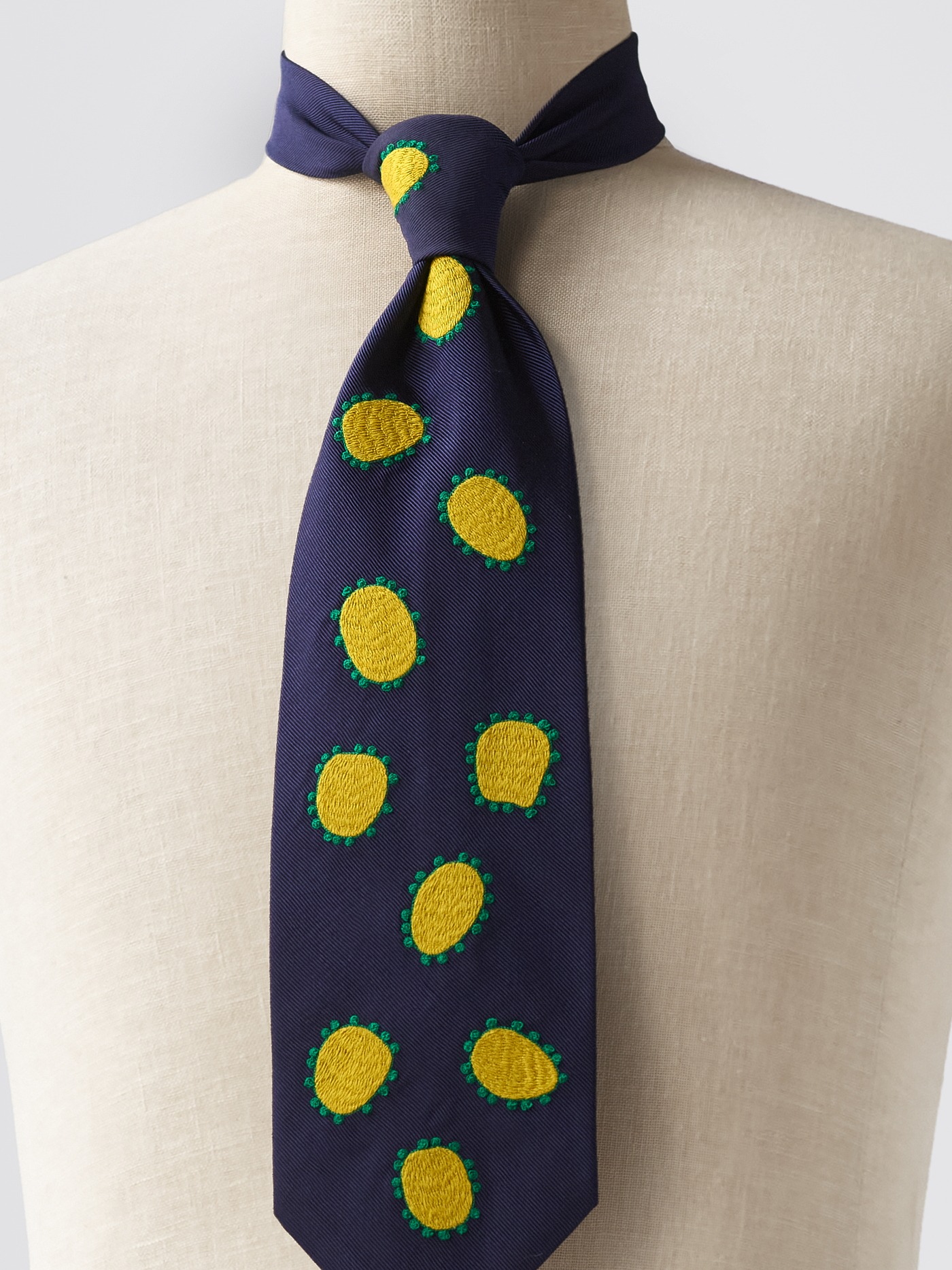 Navy silk tie accented with a striking Emerald green and lime yellow hand embroidered design.