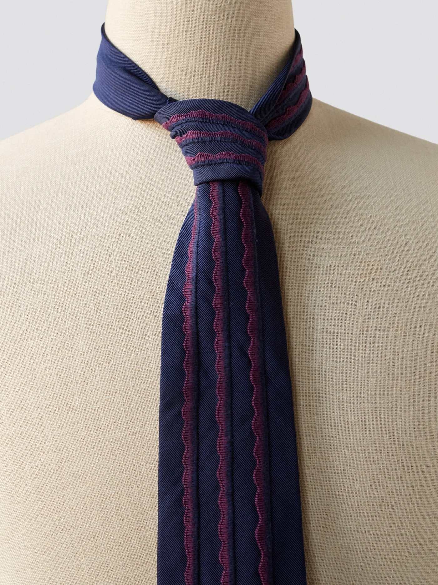 Sophisticated tie with hand embroidered lines in Burgundy, the base fabric is a high quality navy silk.