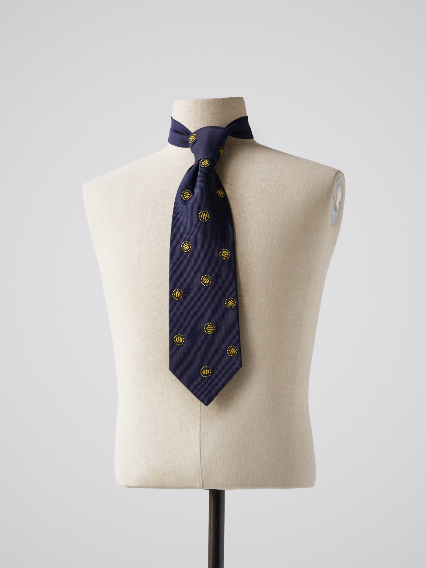 Navy silk tie adorned with meticulously hand embroidered yellow and navy circular patterns, adding a subtle yet striking detail to your look.