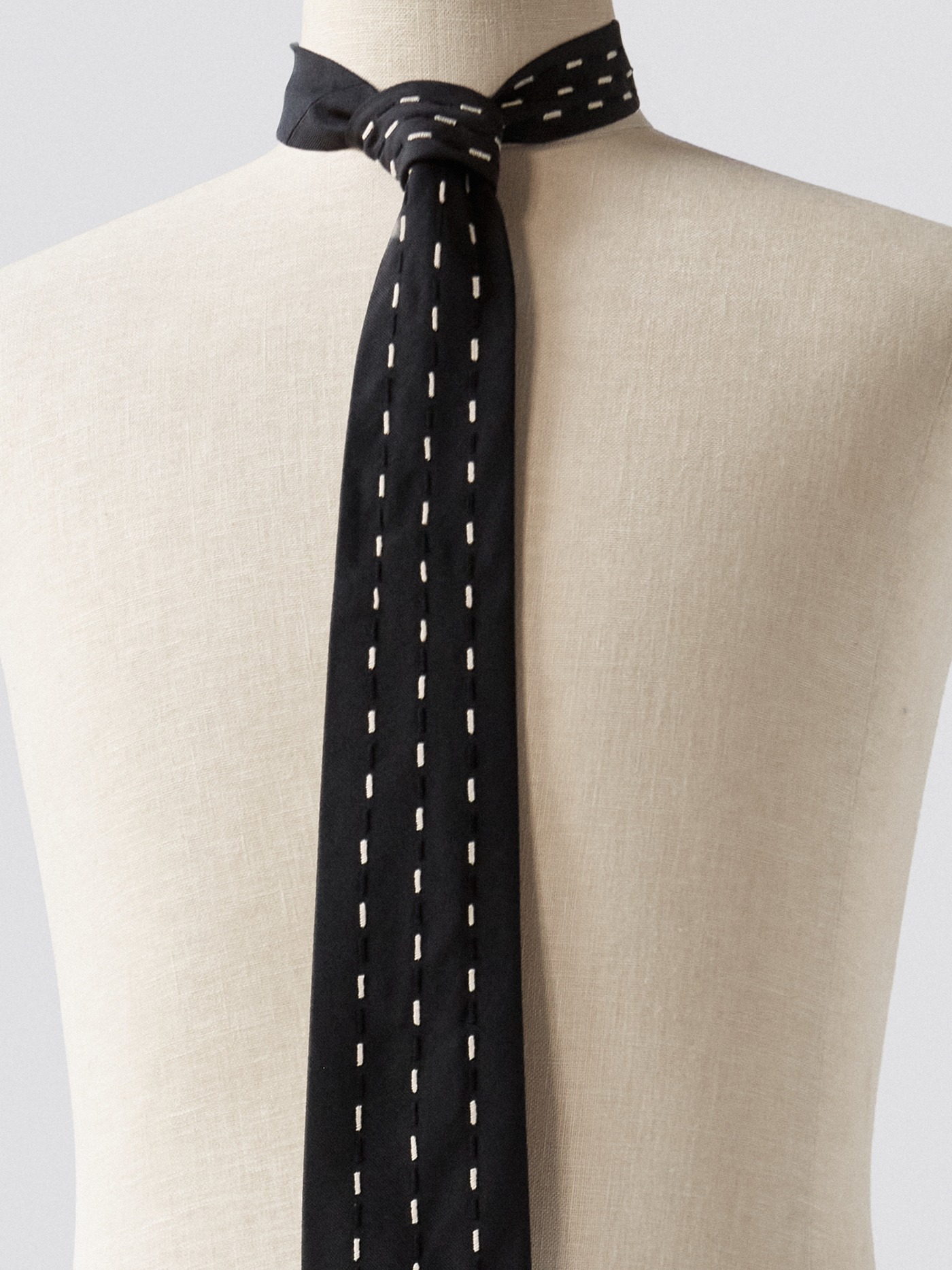 Sharp black silk designer tie, decorated with black and cream details.