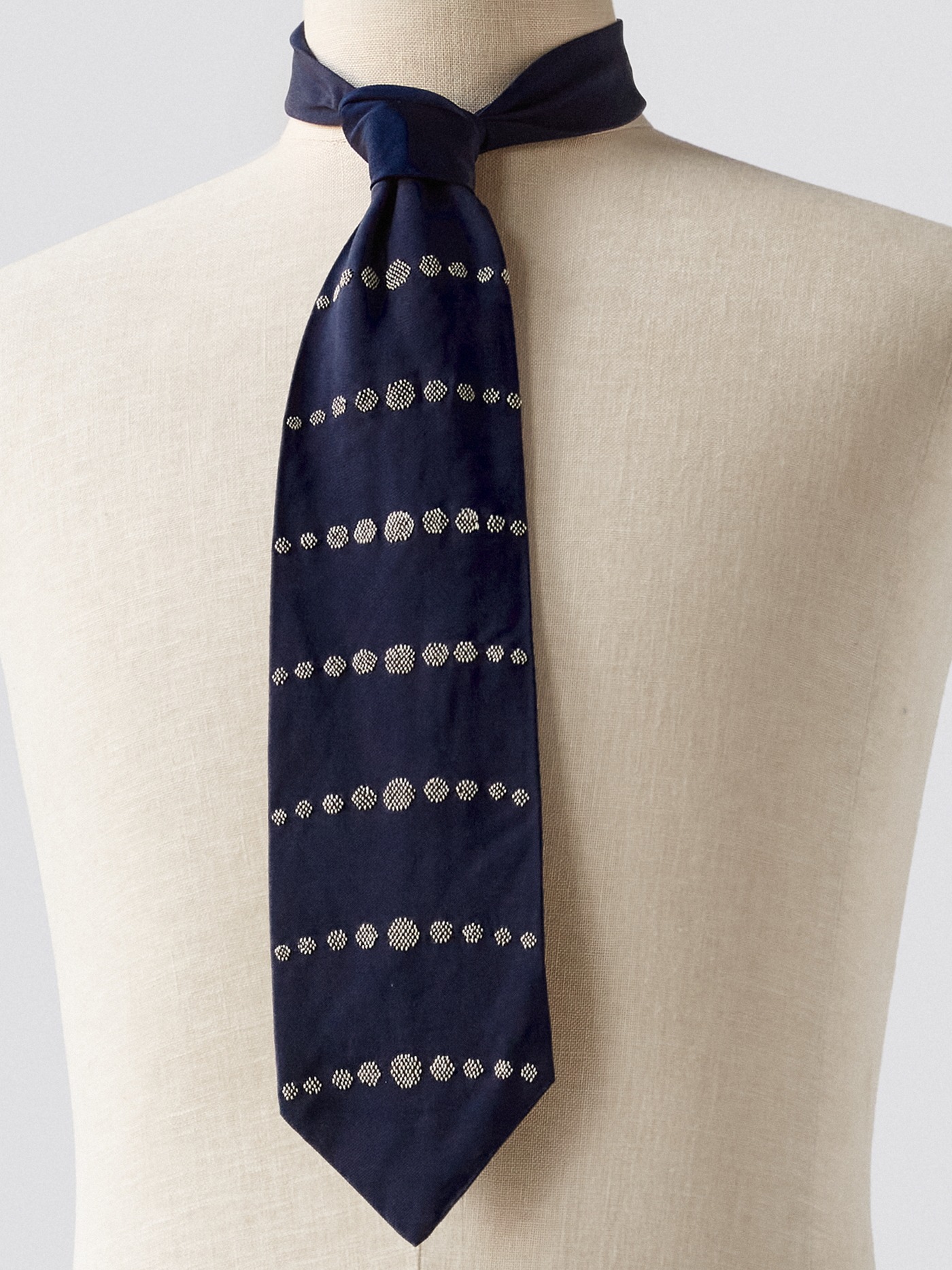 Fine hand embroidered dots come together in horizontal lines, giving this wide silk tie its unique character.