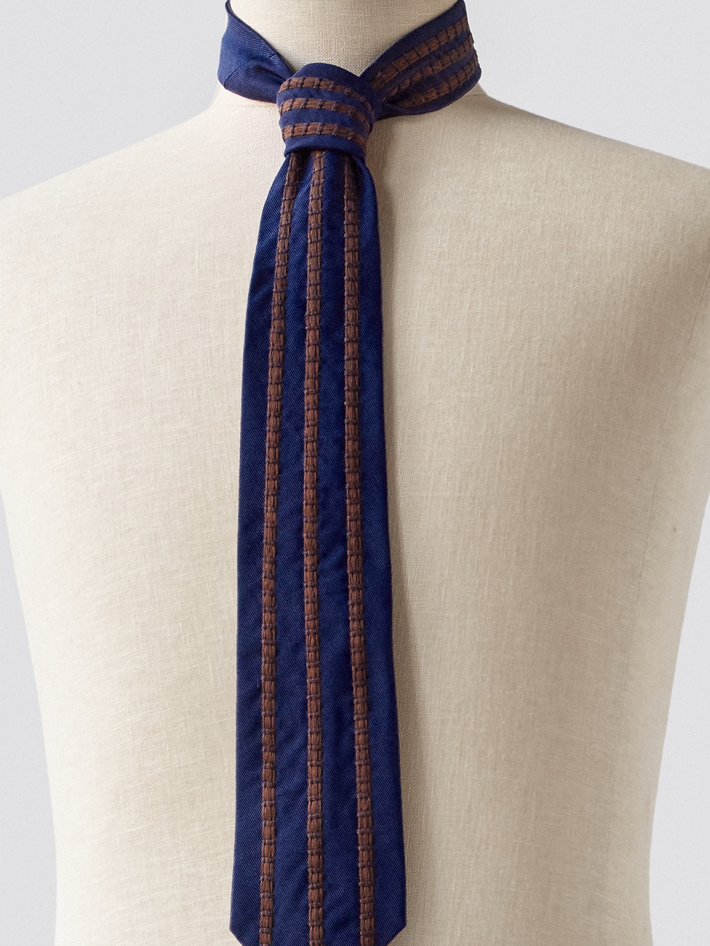 The three brown hand embroidered lines create an extra dimension to the navy silk tie.