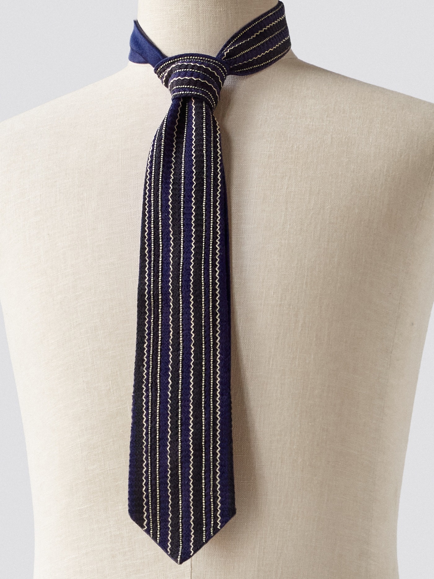 Interesting tie with sophisticated, intricately made embroidered lines in brown, black and cream.