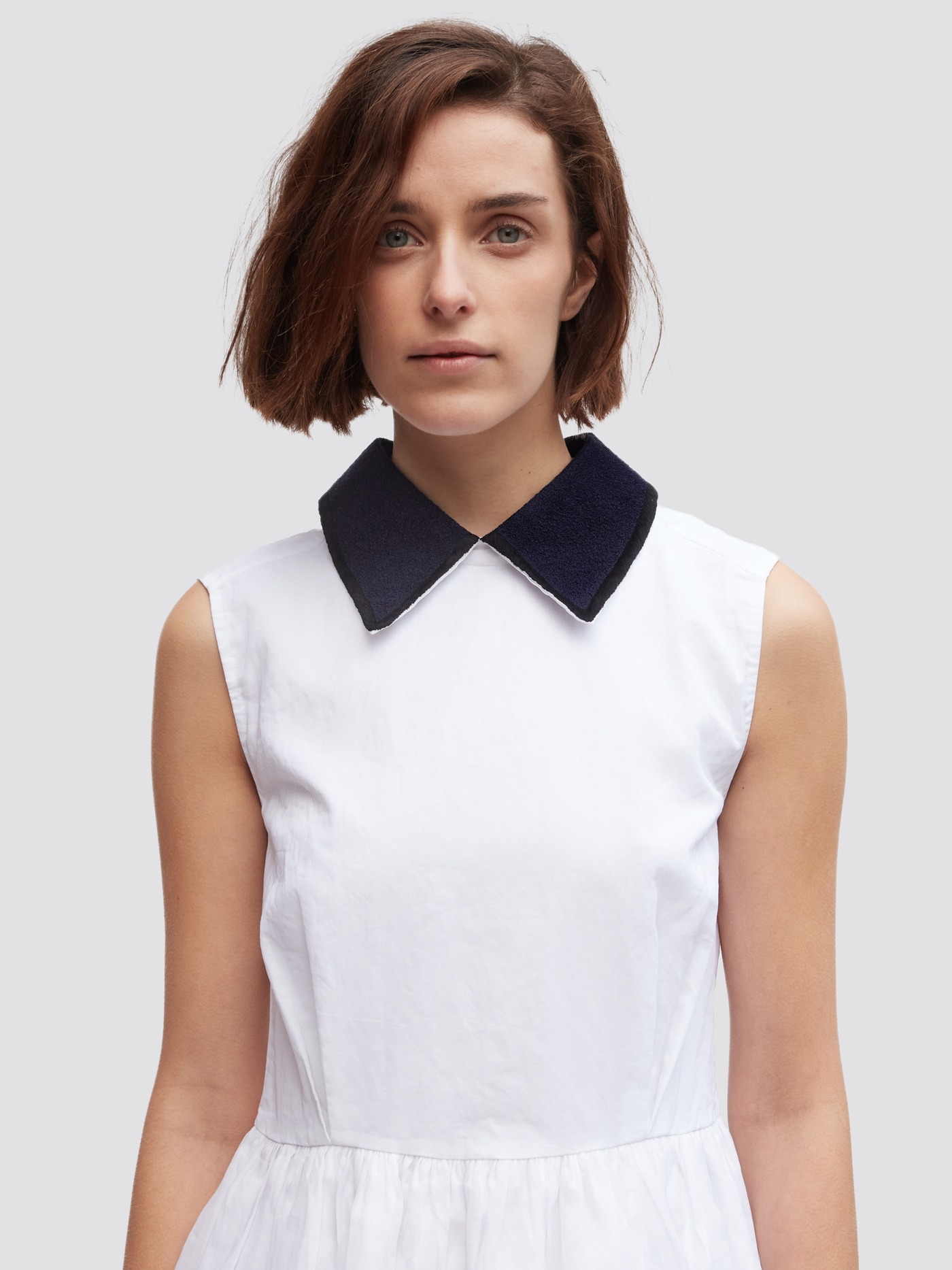 Feminine optical white dress made of the finest cotton with an intricately hand embroidered border and a full embroidered point collar in dark navy, with a fine black outline border.