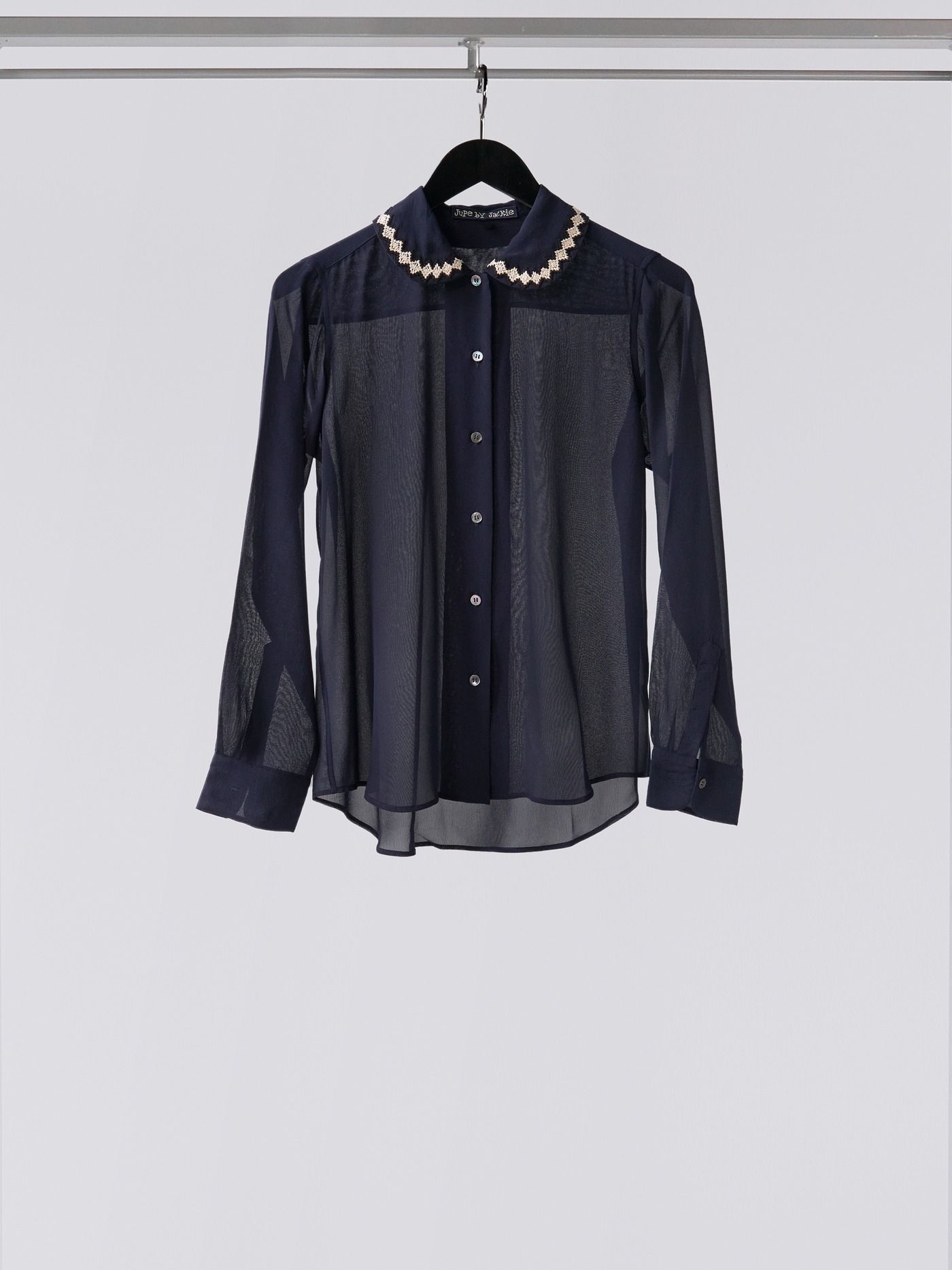 Navy silk crepe Georgette blouse, with intricate collar embroidery in cream and black.