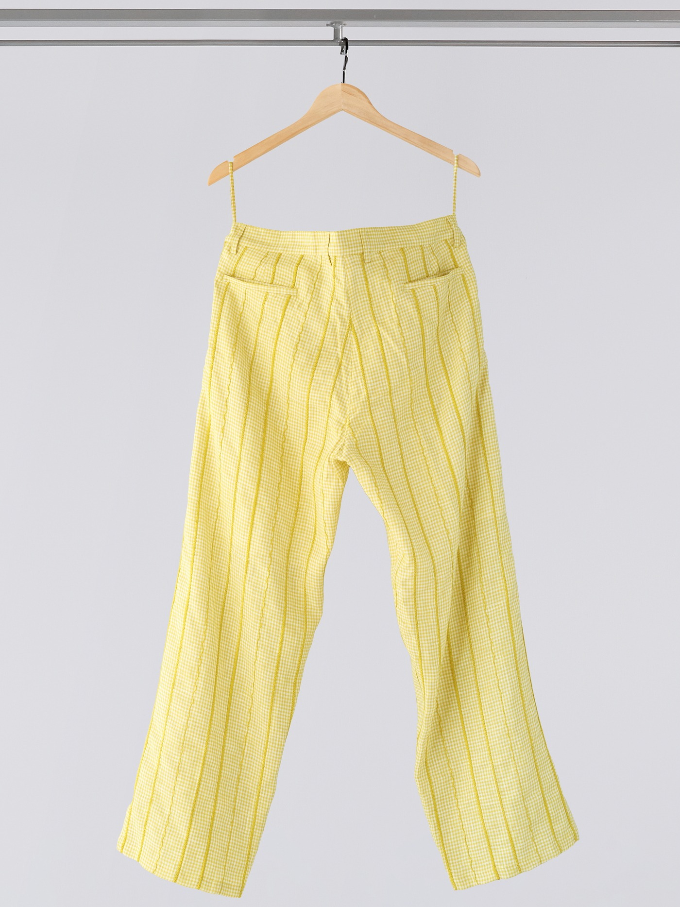 Checked structured linen pants distinguished by refined hand embroidered tone on tone pinstripes, set in different stitches for a quietly striking outcome.
