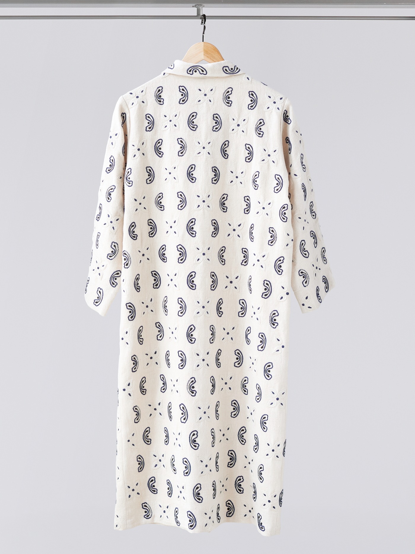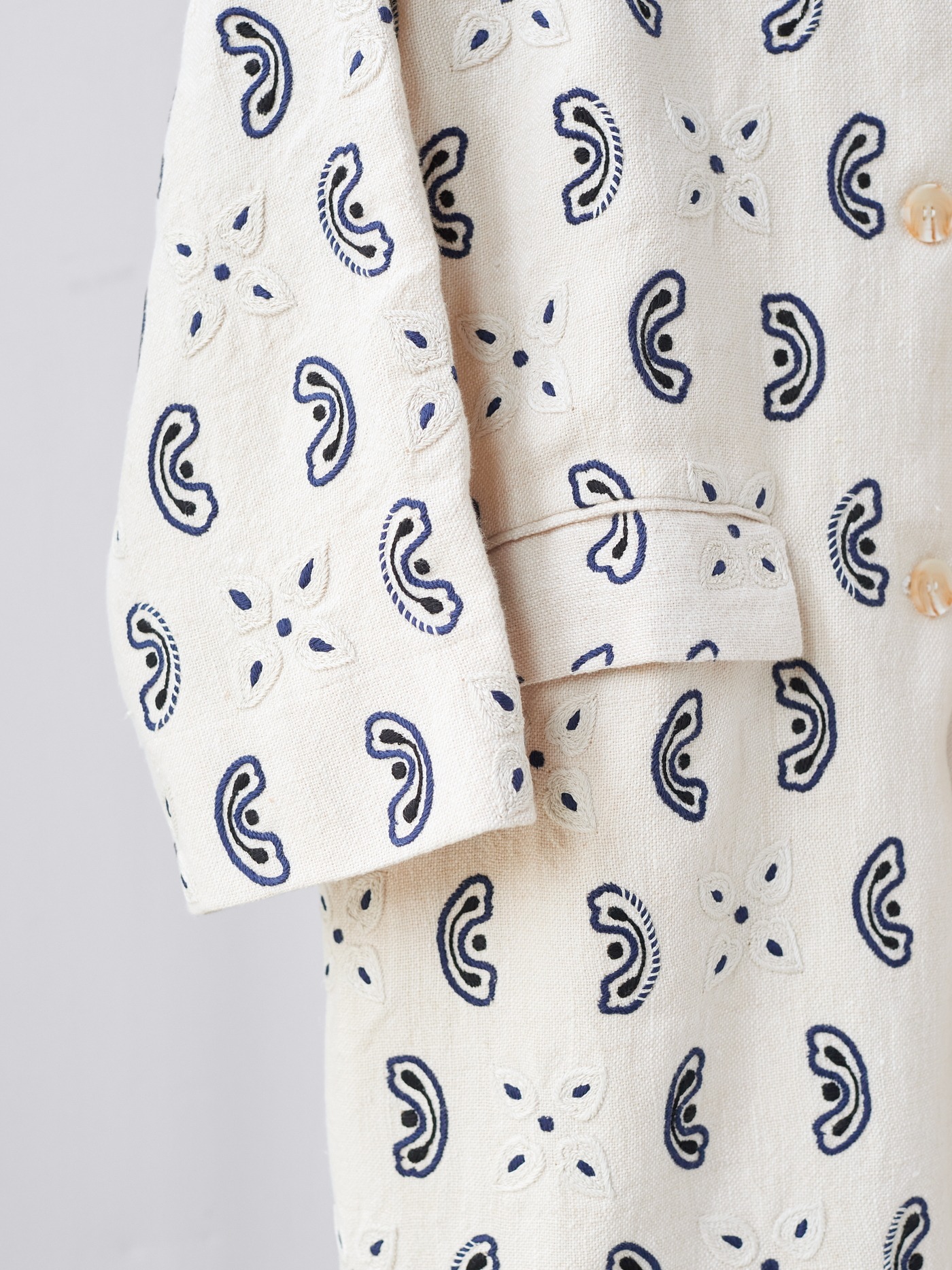 Cotton linen blend jacket with a long, straight silhouette.