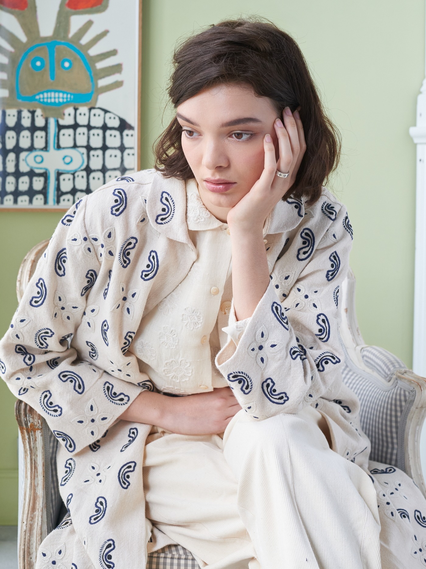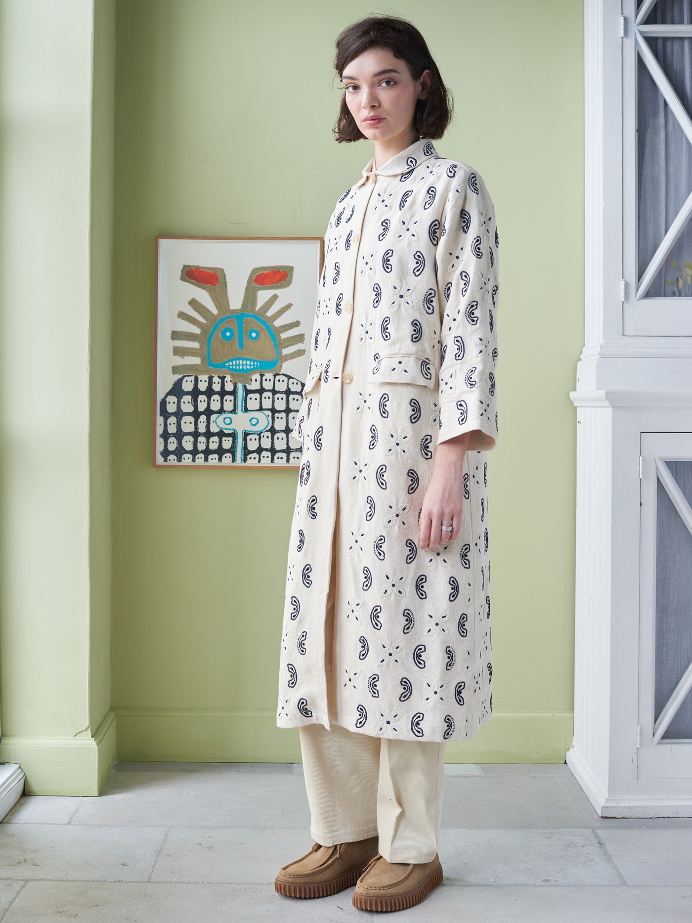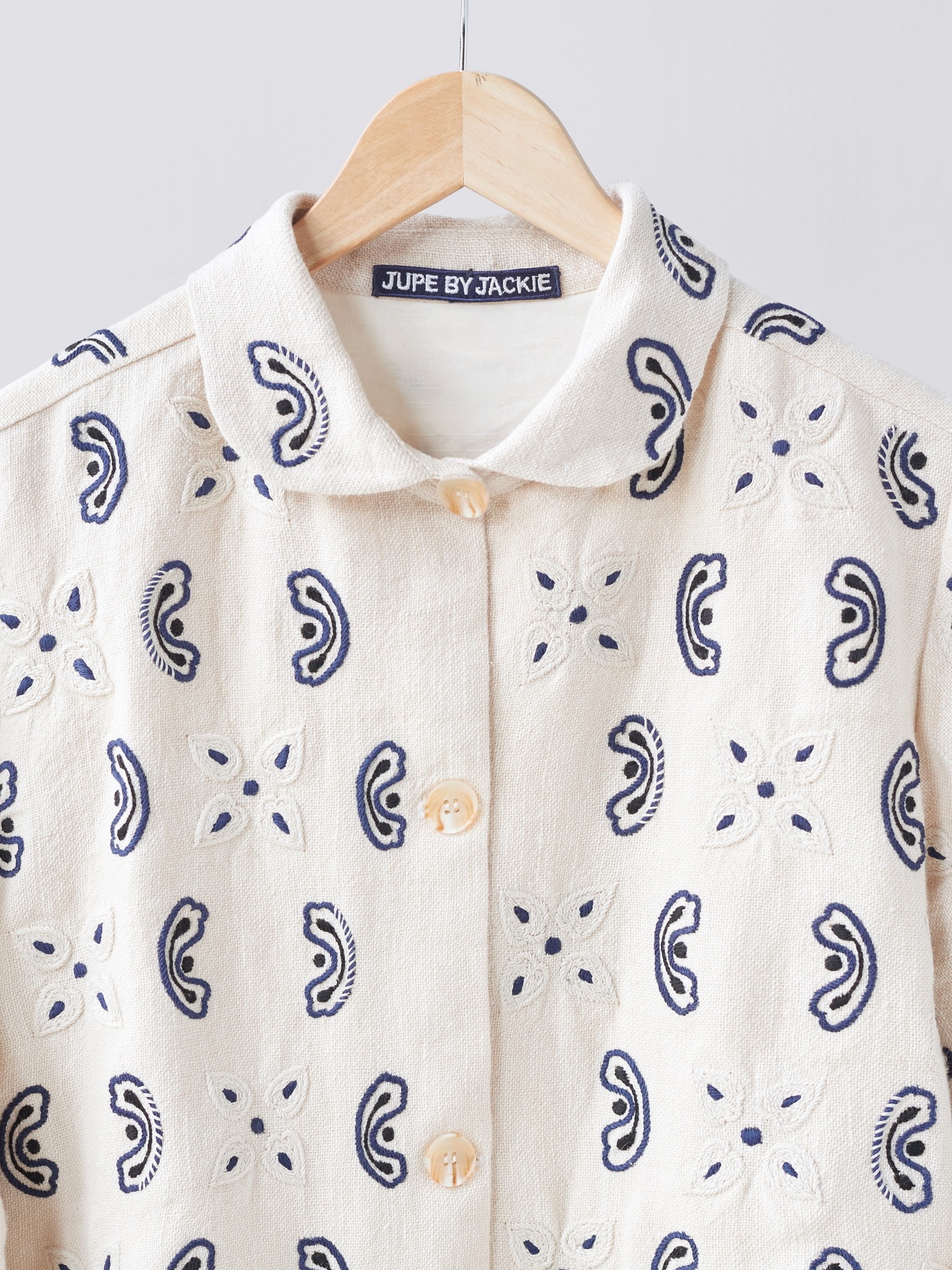 Rounded collar, clean button front and patch pockets keep the shape clear and balanced.