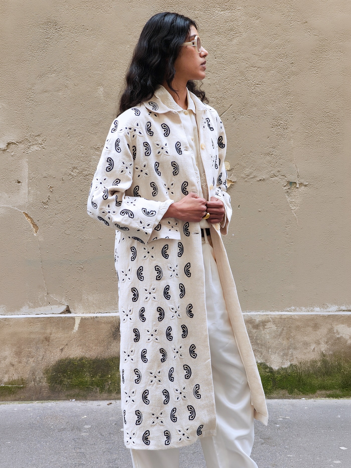 Completely hand embroidered ; designed with graphic floral and paisley motifs in dark navy and ivory.