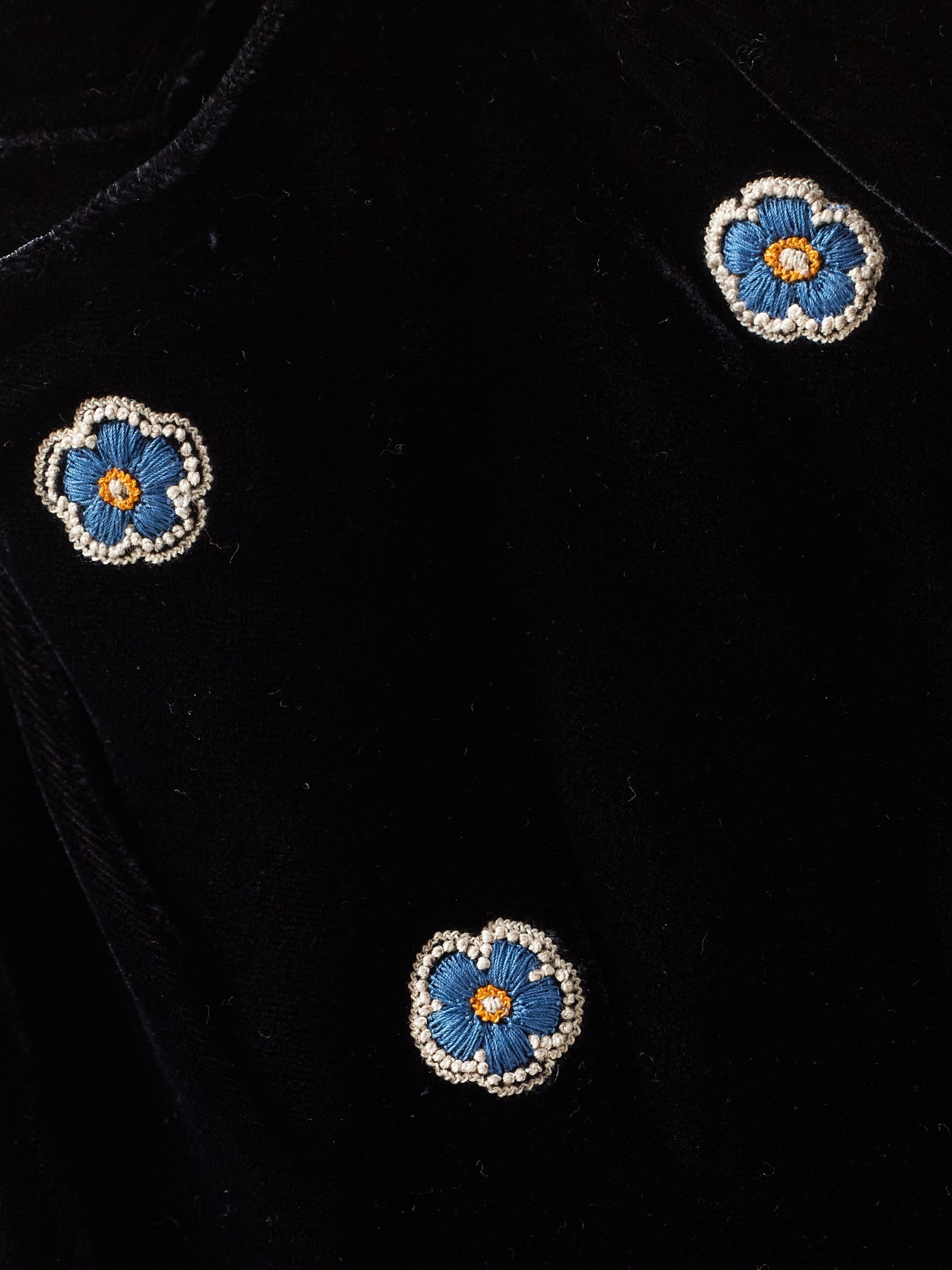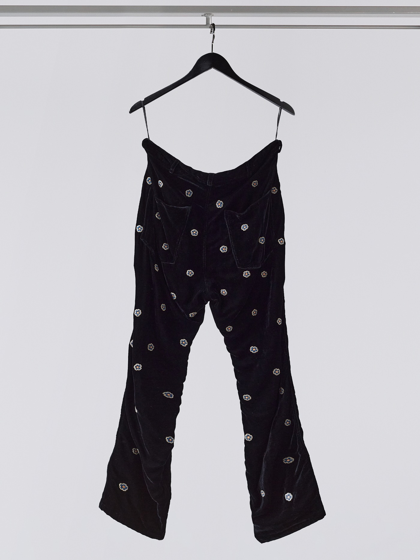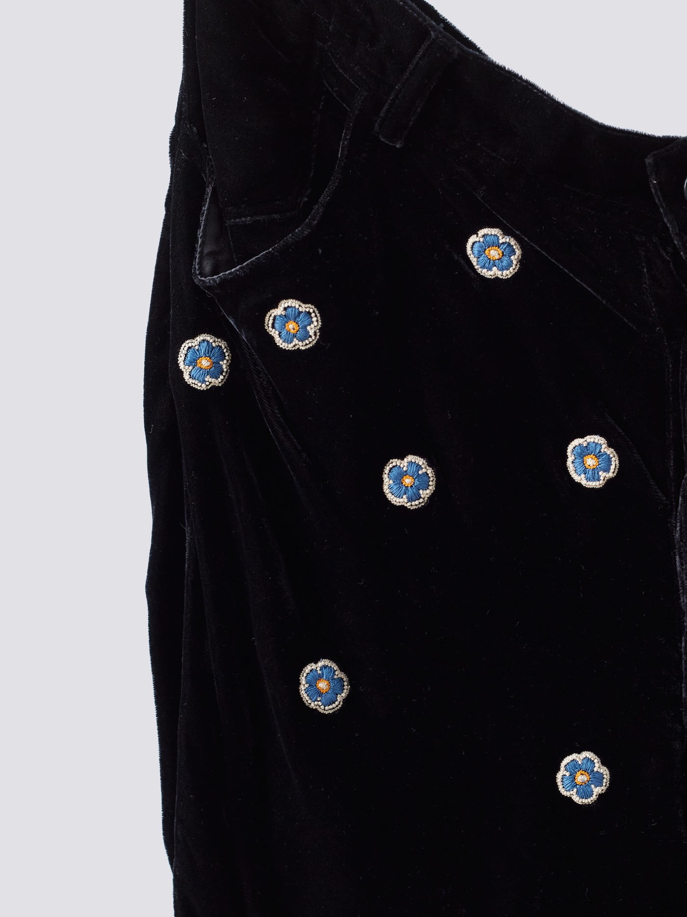 A big bow for the master artisans ; all flowers on this black silk velvet trousers are embroidered by hand.
