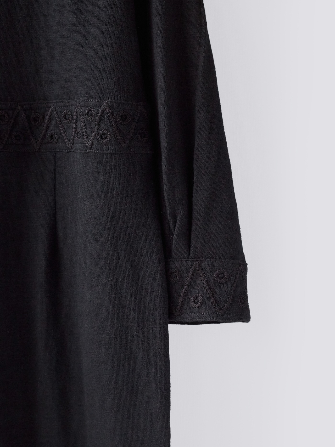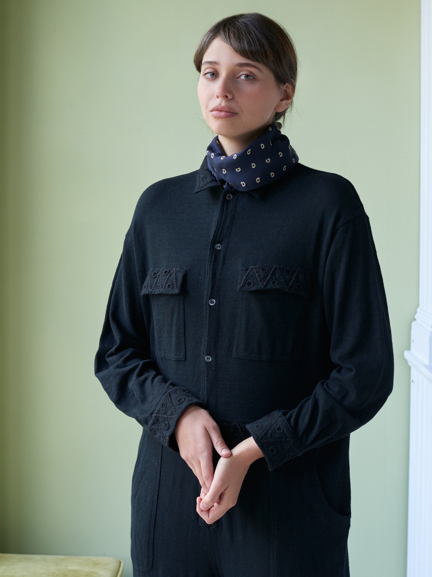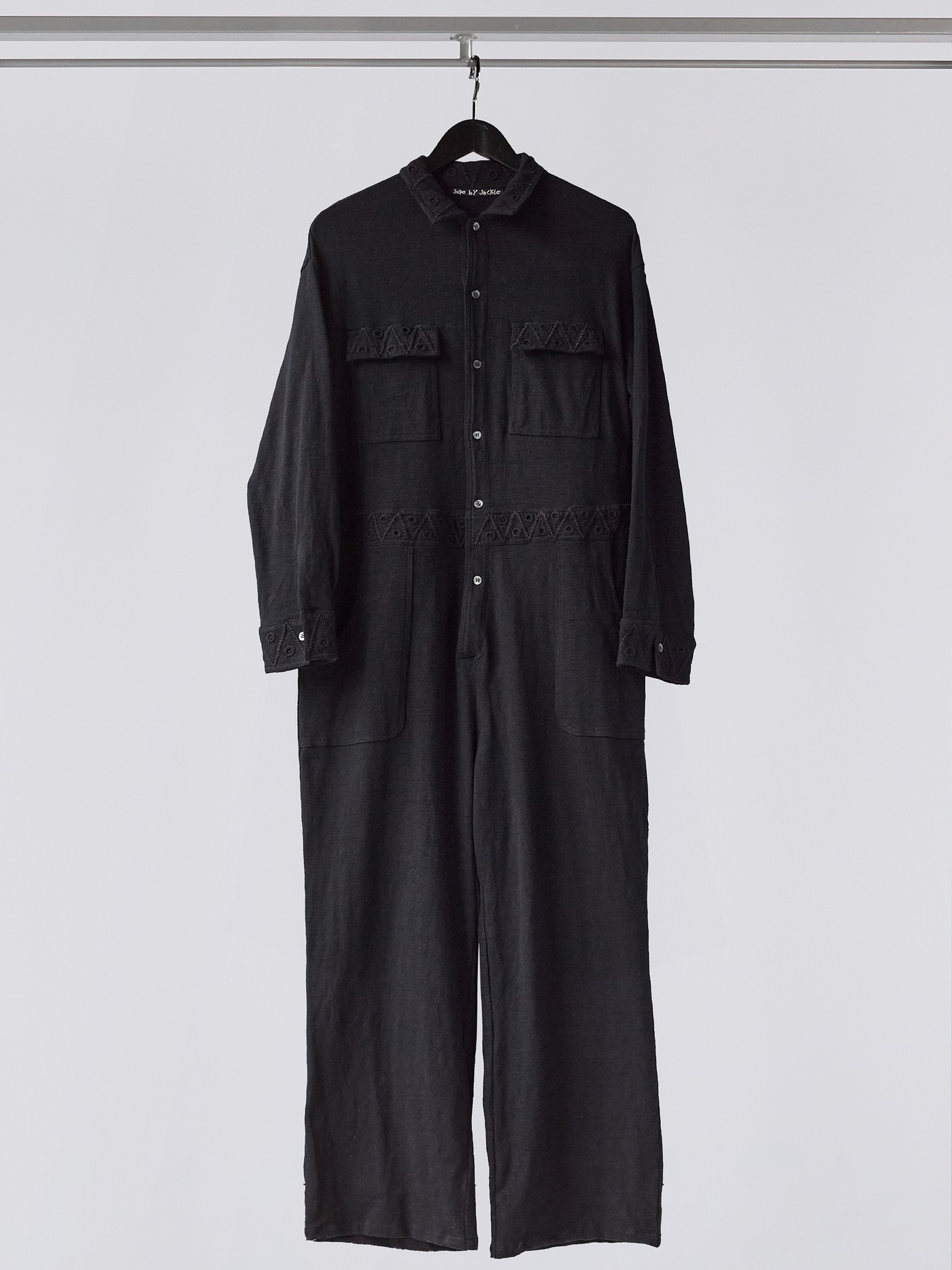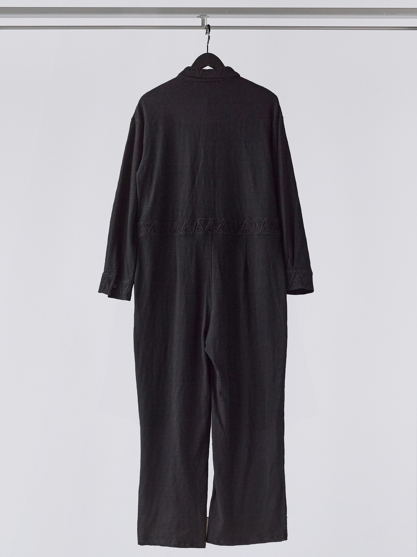 Hand embroidered cotton jersey jumpsuit. Tone on Tone black
