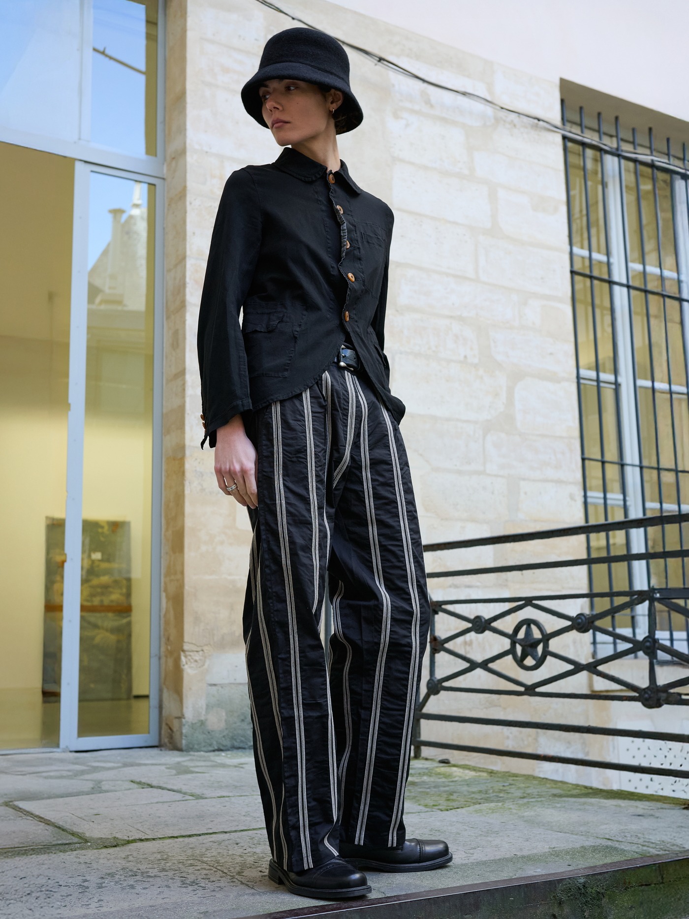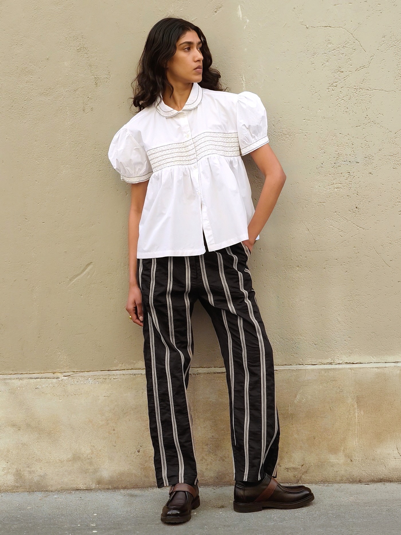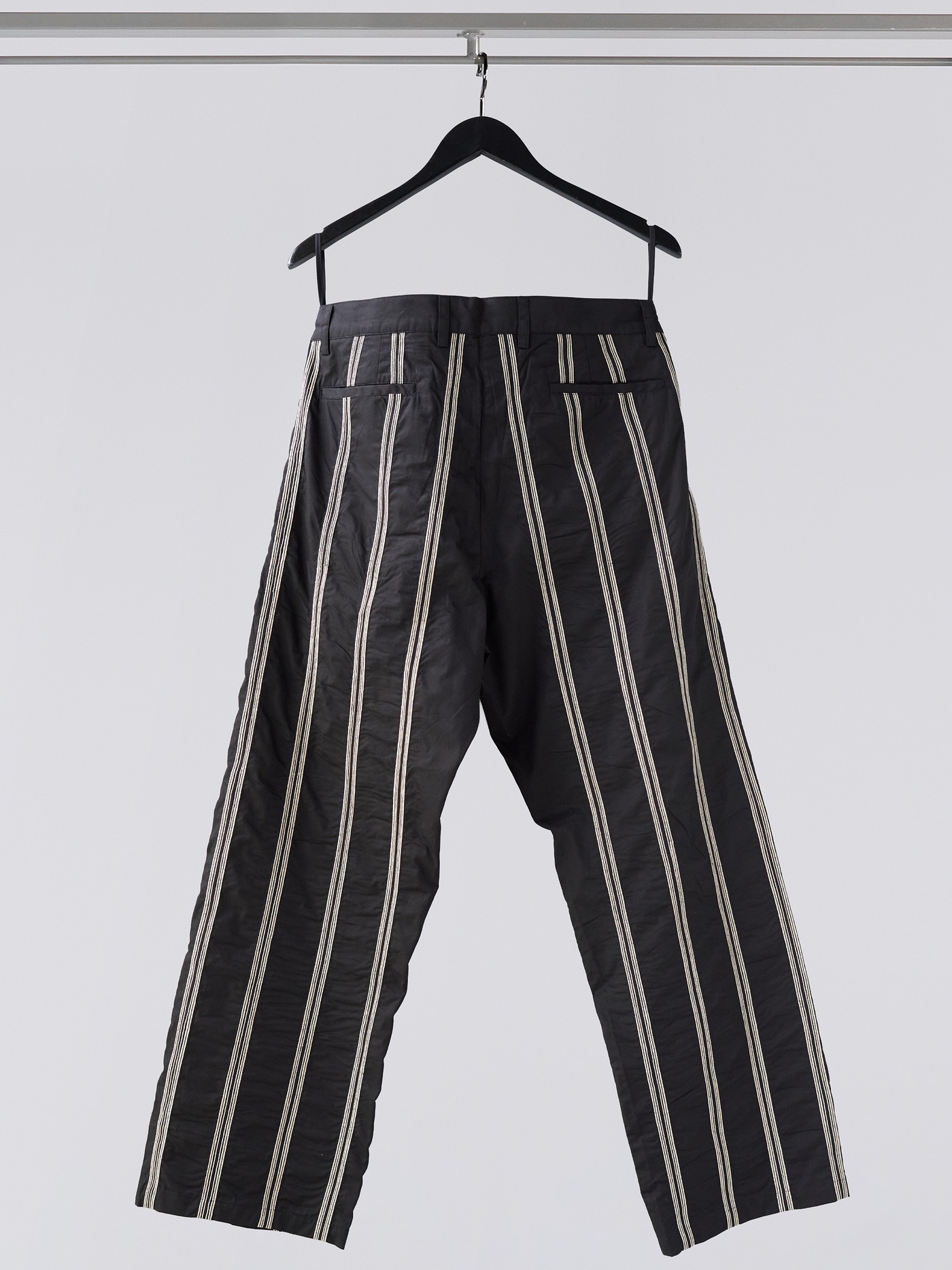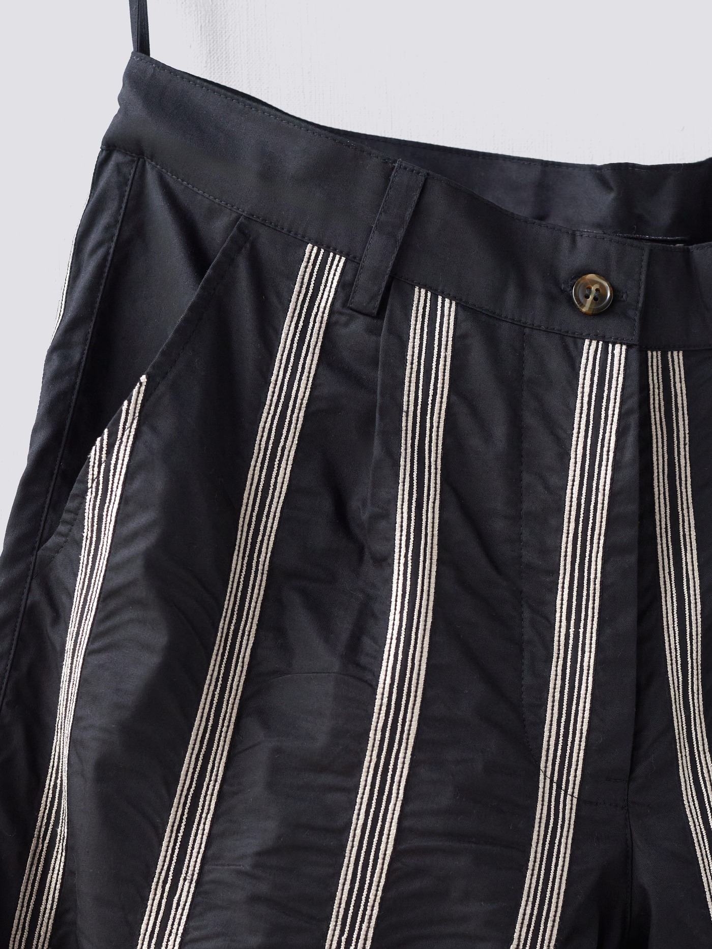 Cotton pants with a hand embroidered stripe pattern in cream and black
