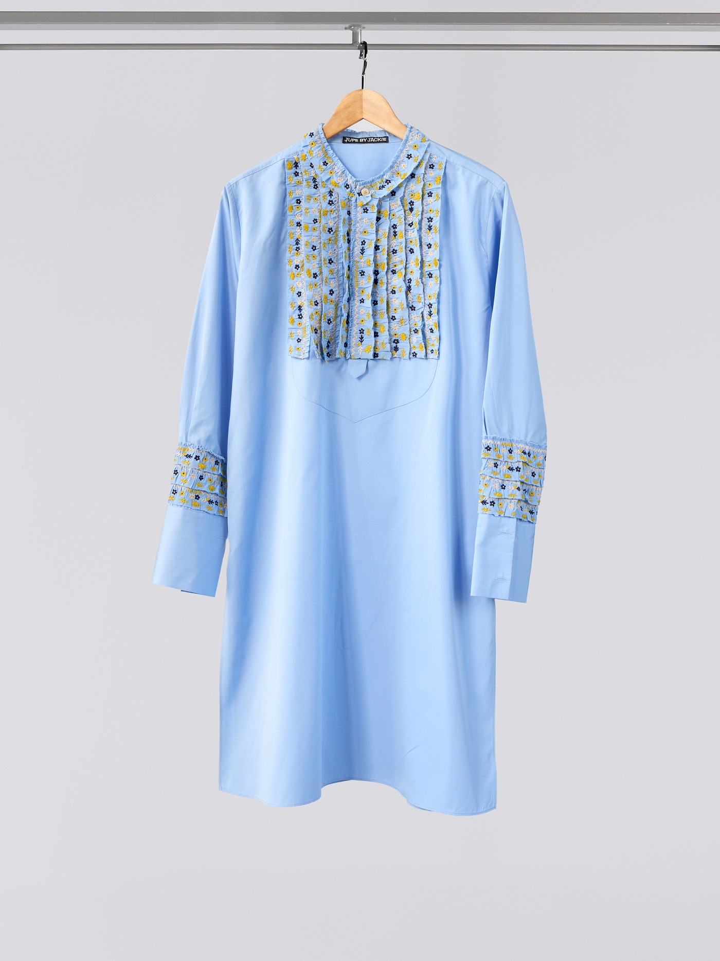 Ruffled front and sleeves with fine hand embroidered details.