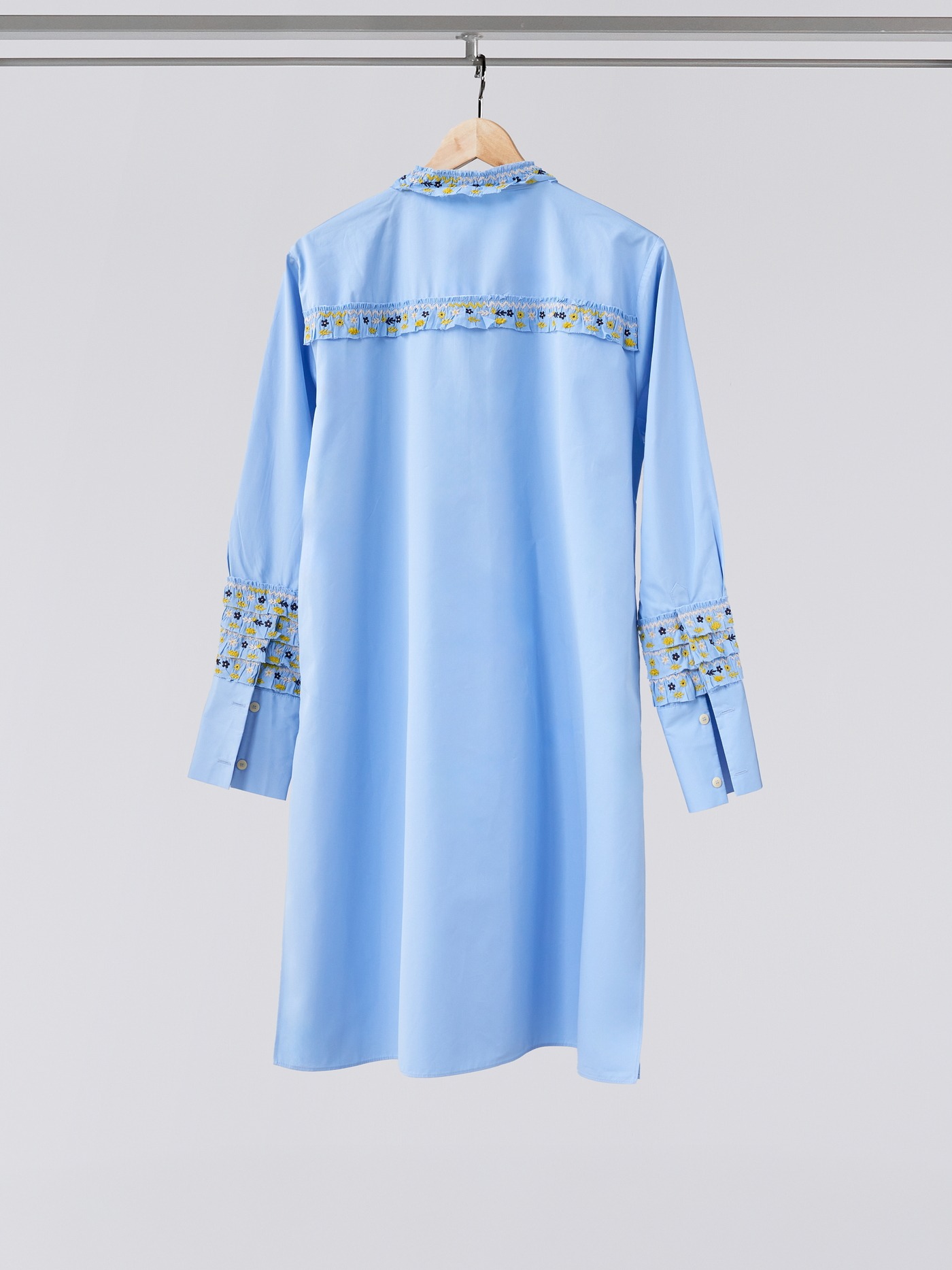 Crispy blue classic shirt dress, made of the finest cotton poplin with stand up collar.