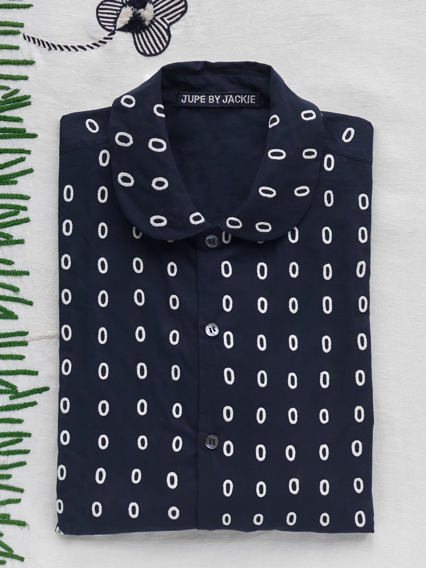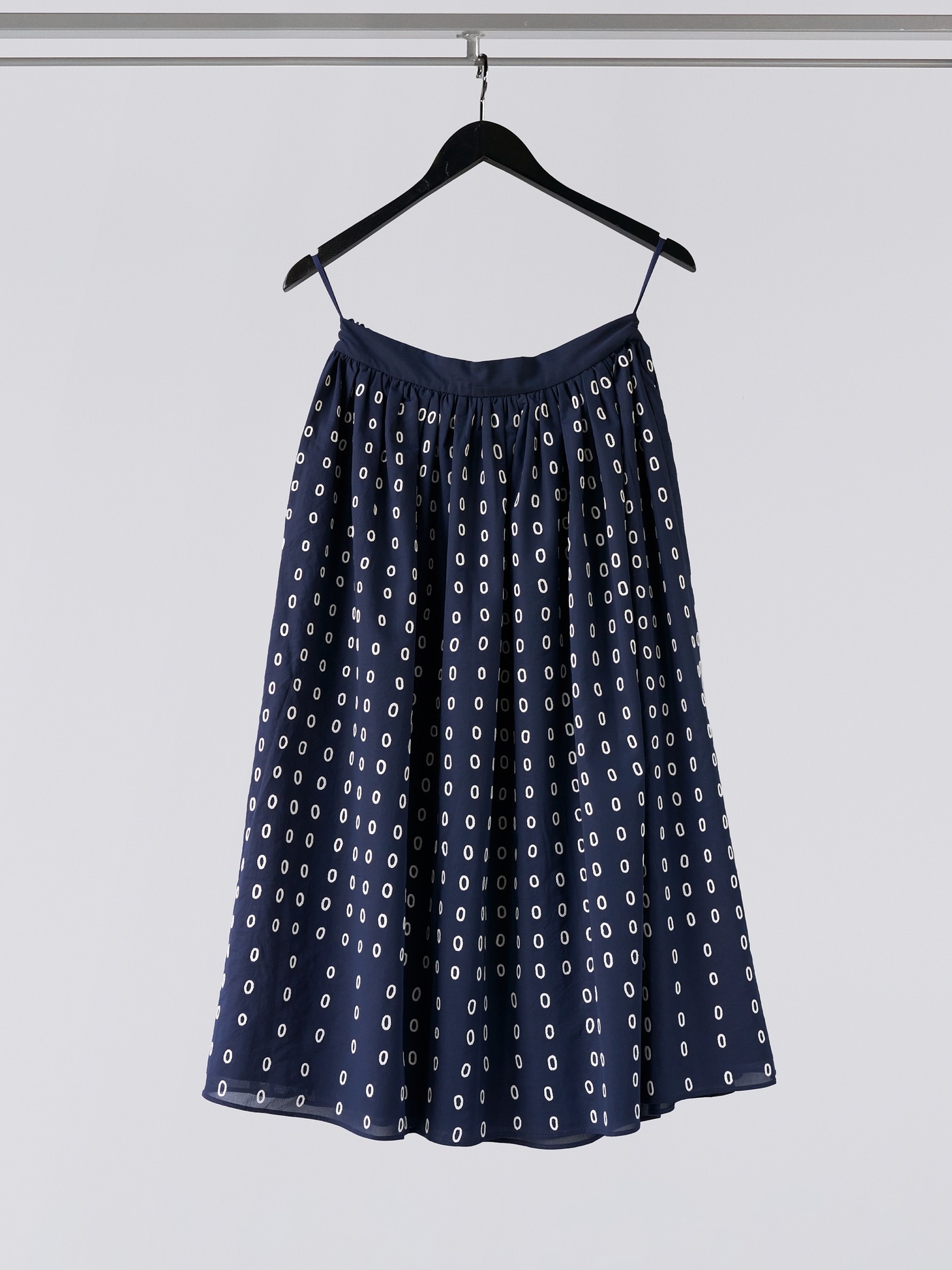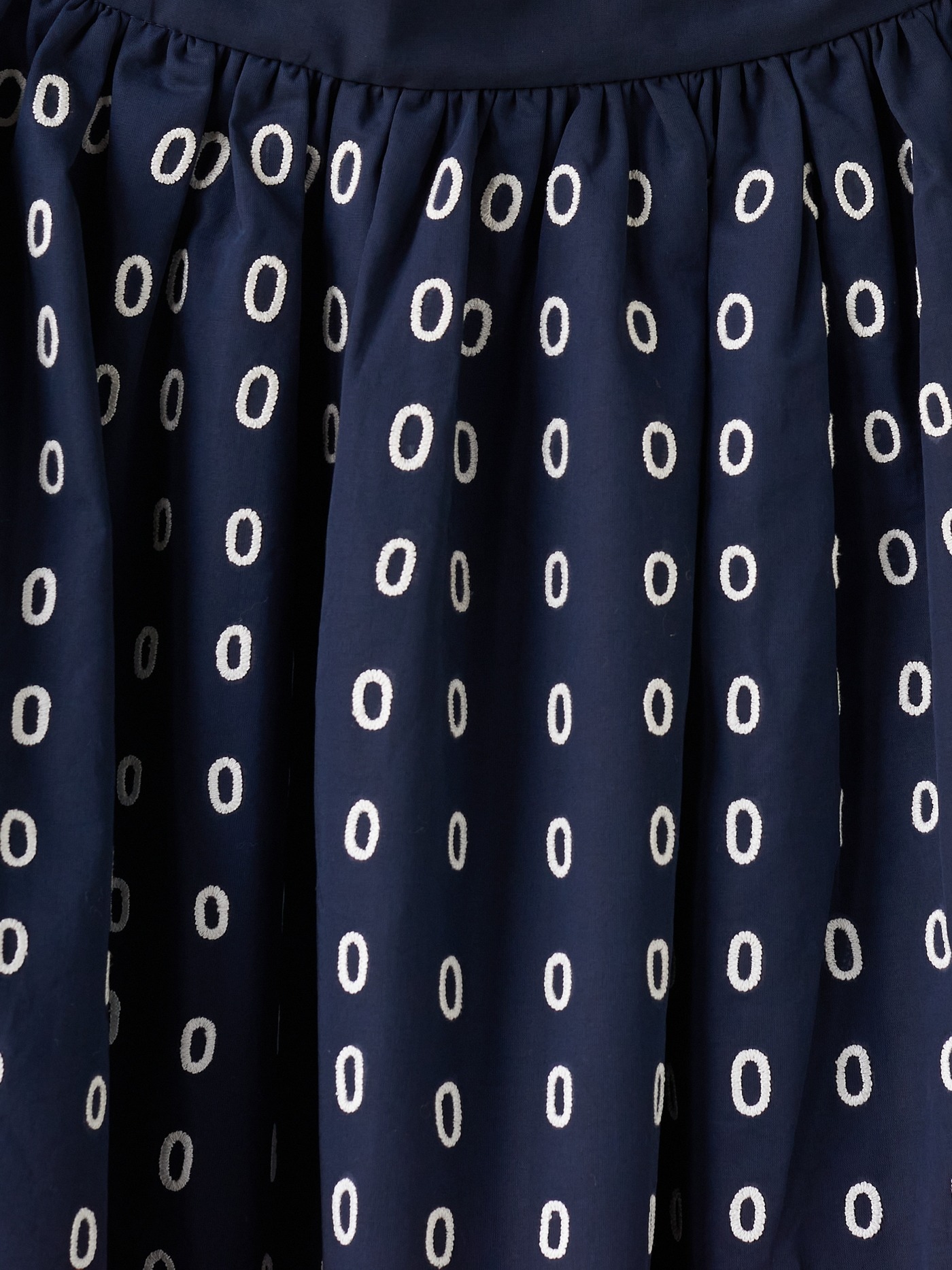 Navy hand embroidered skirt, made of fine Swiss cotton voile or organdie. All over hand embroidered with oval rings. Innerlined.